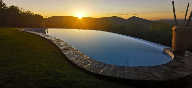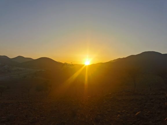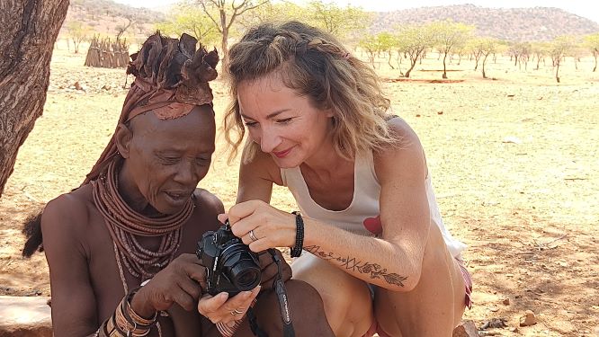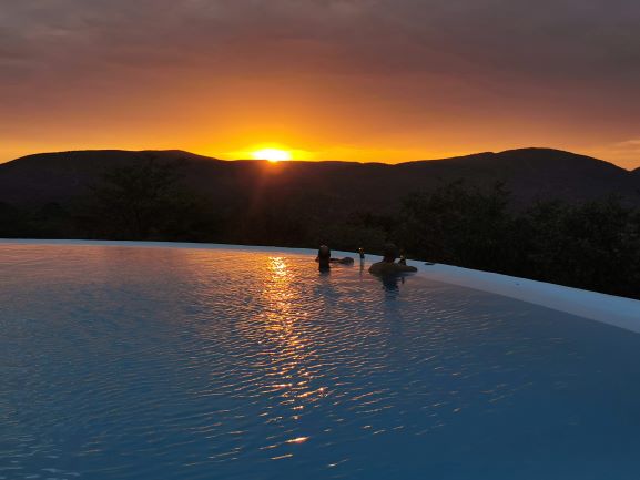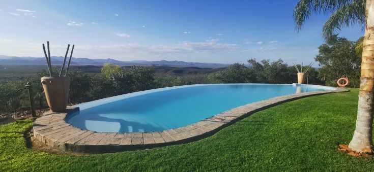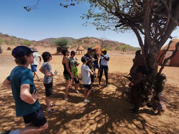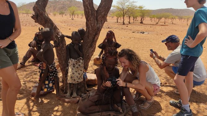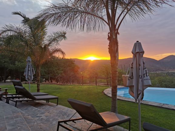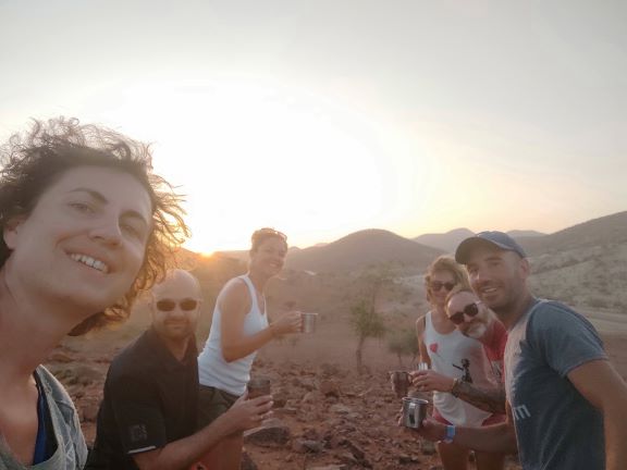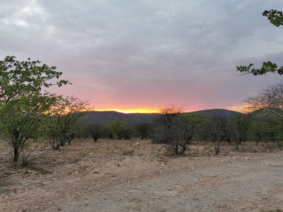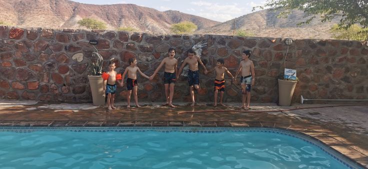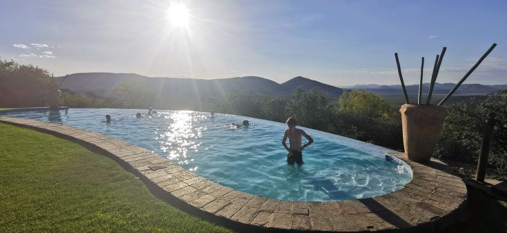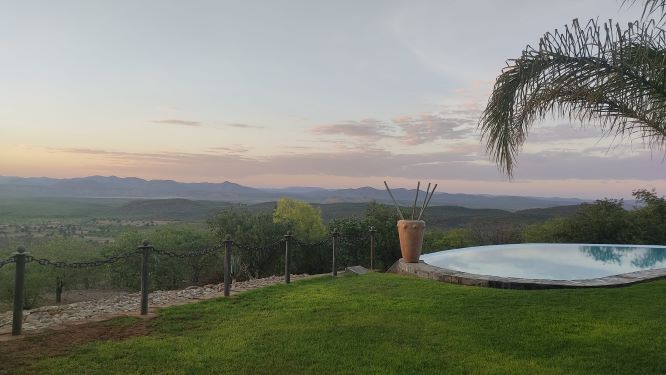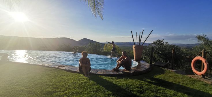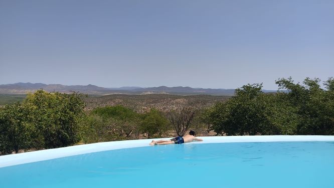 Le camping se situe sur les hauteurs avec une vue splendide sur la vallée en contrebas. Nous profitons de cette fin de journée au bord de la piscine pour faire plus amples connaissances, suivie d’une soirée barbecue. Nous avons prévu de passer quelques jours ensemble sur ces terres Himba.