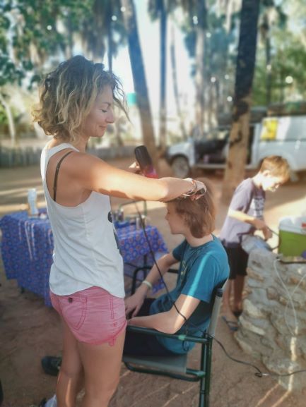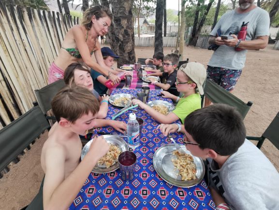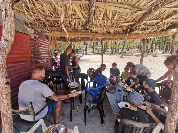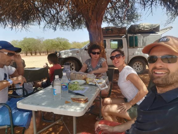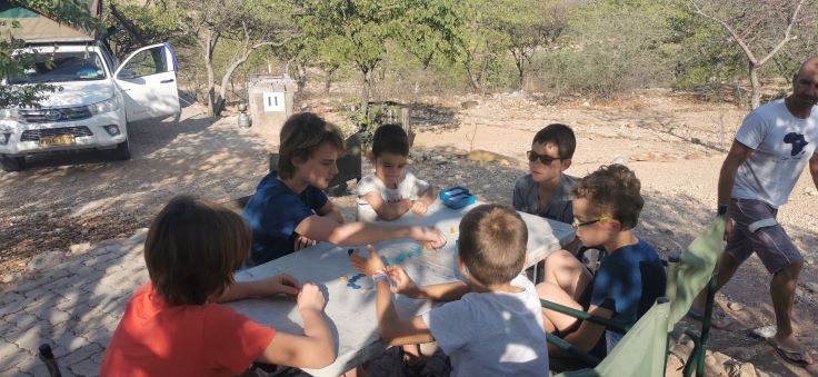 Nous croisons dans le supermarché la famille de baroudeurs franco-québécois que nous devions justement retrouver à Opuwo. Il s’agit des « 5 couleurs primaires », Caroline et Sam et leurs trois enfants Enzo, Noé et Jolan. Nous faisons vite fait les présentations masqués puis nous filons tous ensemble au campsite.