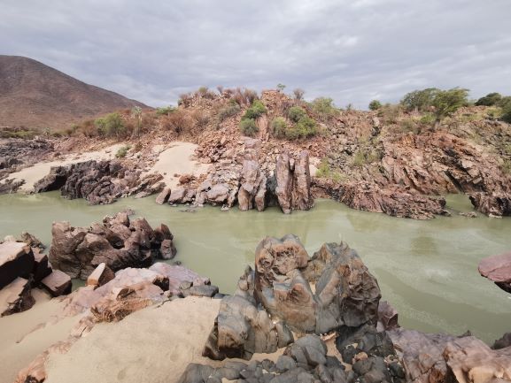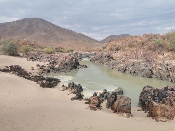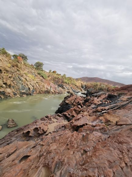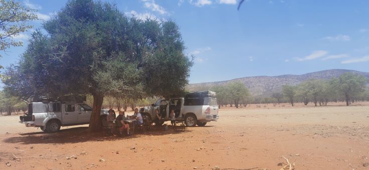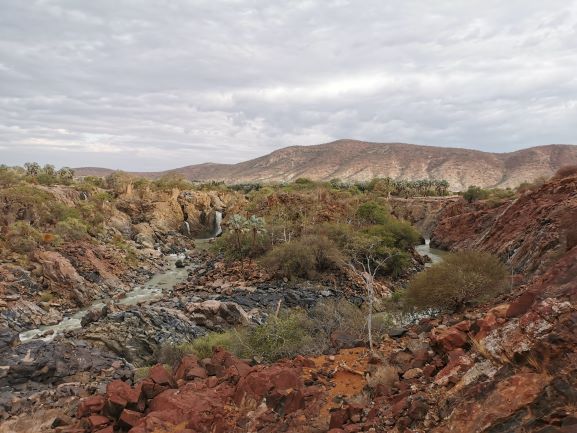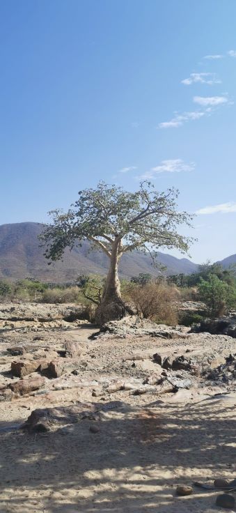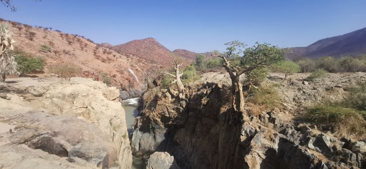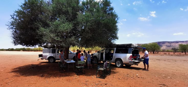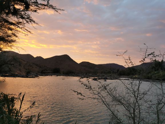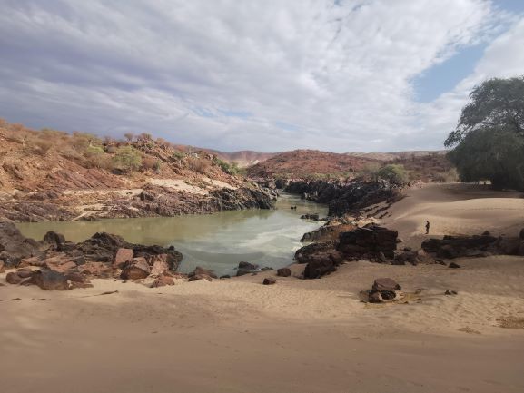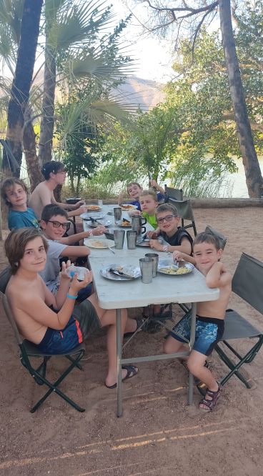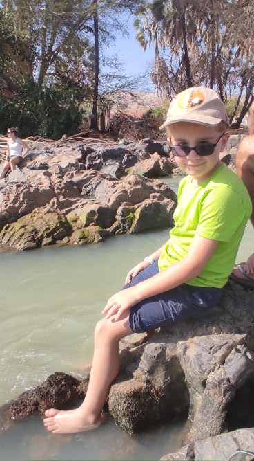 Le lendemain matin, nous décidons encore de profiter quelques heures de ce cadre magnifique avant de reprendre la route. Les enfants s’entendent déjà super bien, du coup on mélange les enfants dans les voitures pour qu’ils puissent en profiter. Nous roulons en direction d’Epupa Falls, une longue route qui peut devenir très compliquée lorsqu’il pleut. Heureusement, ce ne sera pas notre cas mais nous traversons beaucoup de lits de rivière asséchées qui nécessitent toujours de ralentir pour éviter un vol plané. Nous nous arrêtons pour le déjeuner sous un arbre assez gros pour tous nous abriter du soleil. Puis nous reprenons la route. Les paysages changent, la terre vire au ocre, la végétation commence à apparaitre à l’approcher de la rivière Kunene. Lorsque nous arrivons à Epupa Falls, nous avons l’impression de voir un oasis au milieu du désert : la végétation est luxuriante autour de la rivière, le tout est entourée de montagnes rouges désertiques. Nous nous installons à notre camping juste au bord de la rivière, attention aux crocodiles ! Nous restons tranquilles à profiter de la piscine pour cette fin de journée.