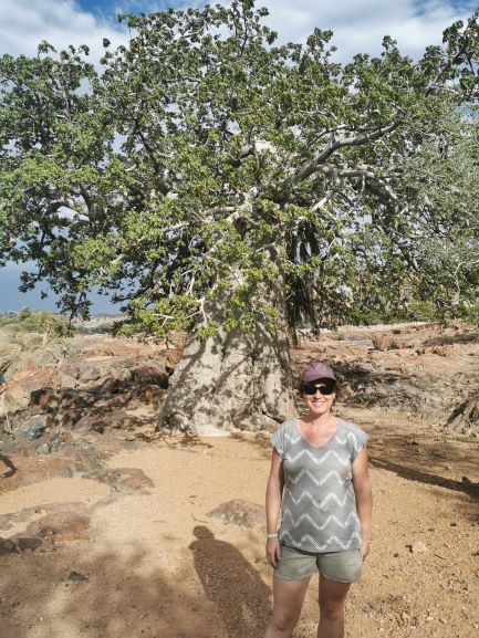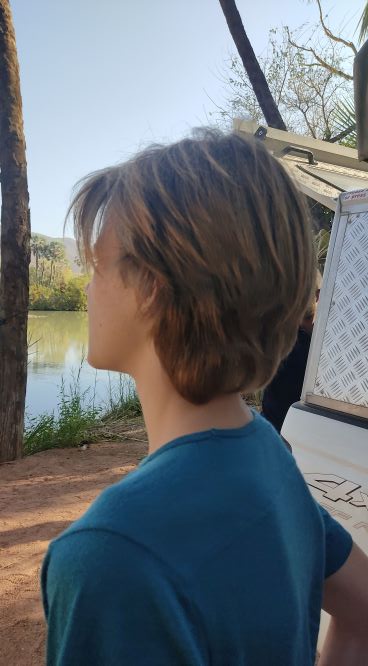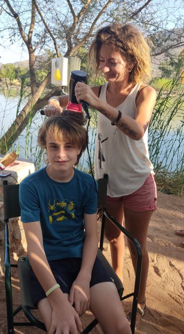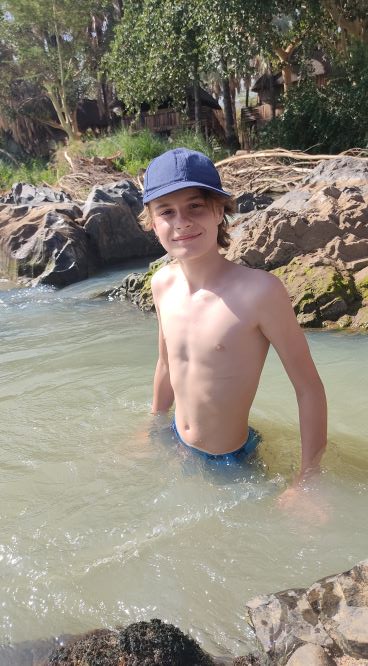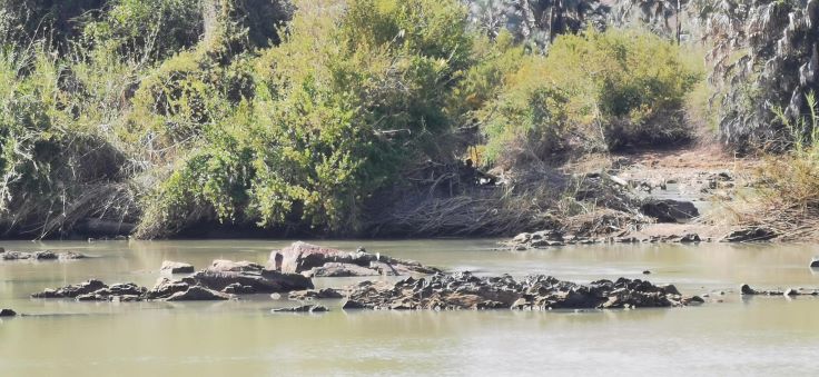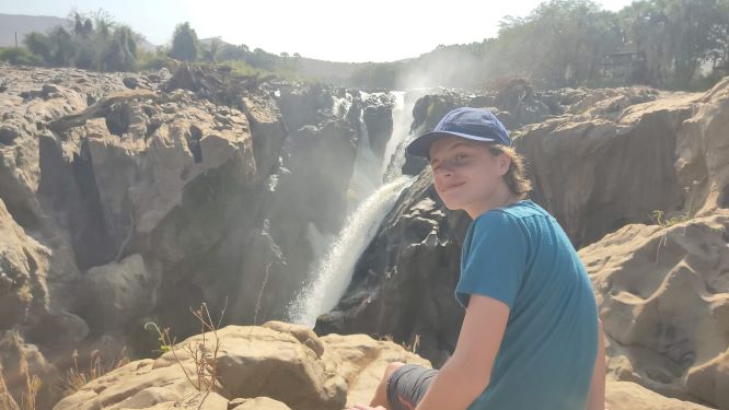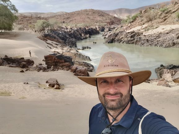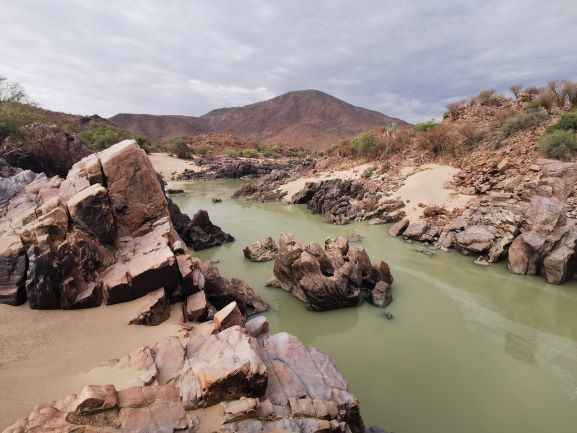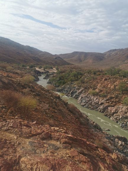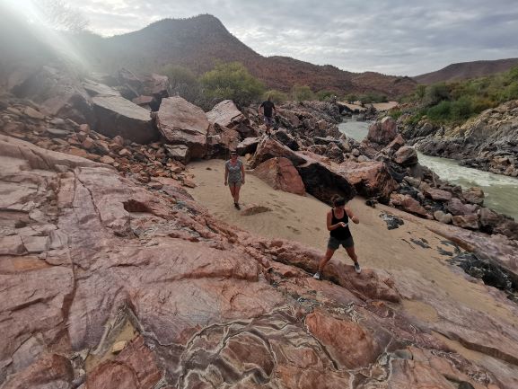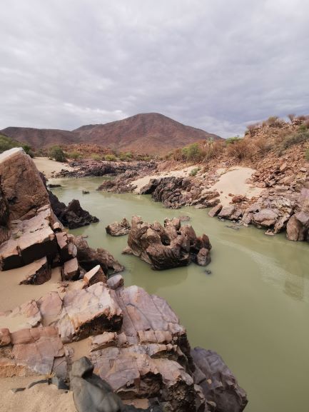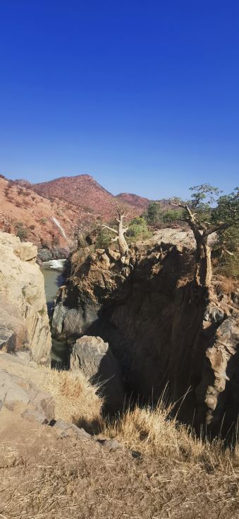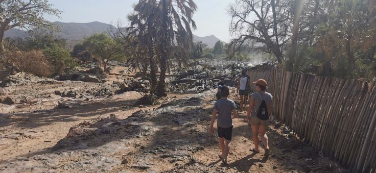 Le lendemain matin, nous décidons encore de profiter quelques heures de ce cadre magnifique avant de reprendre la route. Les enfants s’entendent déjà super bien, du coup on mélange les enfants dans les voitures pour qu’ils puissent en profiter. Nous roulons en direction d’Epupa Falls, une longue route qui peut devenir très compliquée lorsqu’il pleut. Heureusement, ce ne sera pas notre cas mais nous traversons beaucoup de lits de rivière asséchées qui nécessitent toujours de ralentir pour éviter un vol plané. Nous nous arrêtons pour le déjeuner sous un arbre assez gros pour tous nous abriter du soleil. Puis nous reprenons la route. Les paysages changent, la terre vire au ocre, la végétation commence à apparaitre à l’approcher de la rivière Kunene. Lorsque nous arrivons à Epupa Falls, nous avons l’impression de voir un oasis au milieu du désert : la végétation est luxuriante autour de la rivière, le tout est entourée de montagnes rouges désertiques. Nous nous installons à notre camping juste au bord de la rivière, attention aux crocodiles ! Nous restons tranquilles à profiter de la piscine pour cette fin de journée.