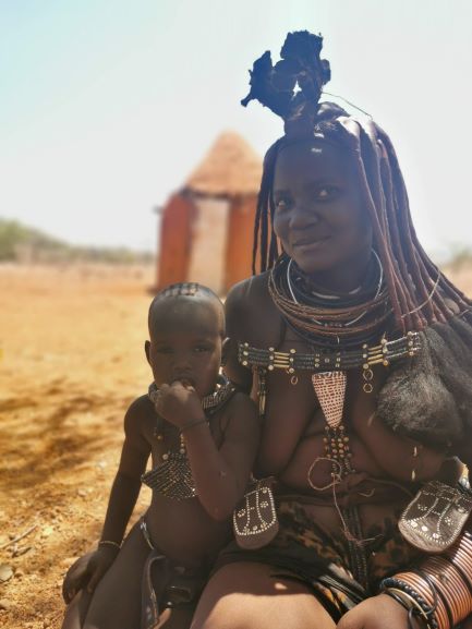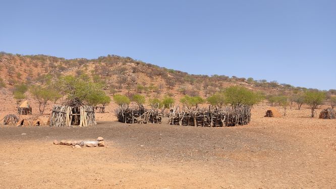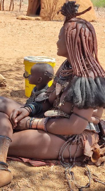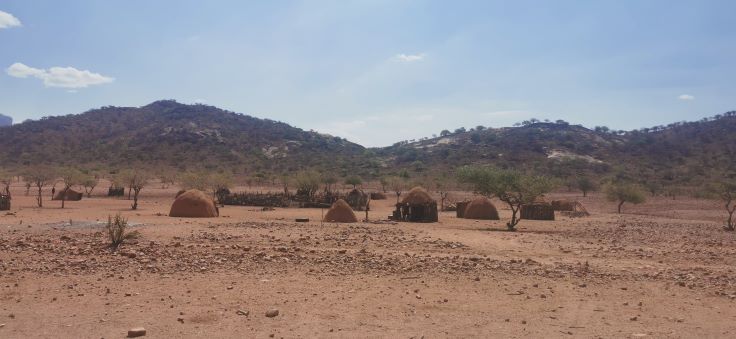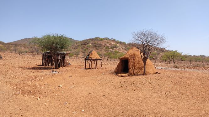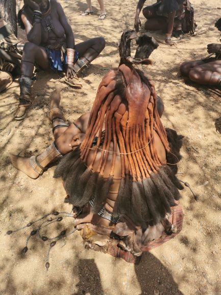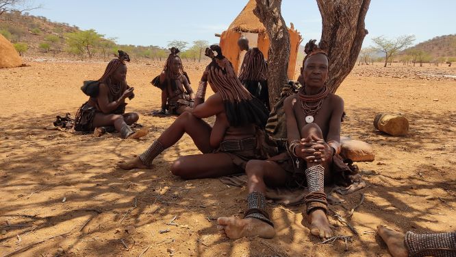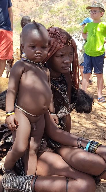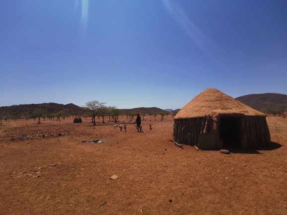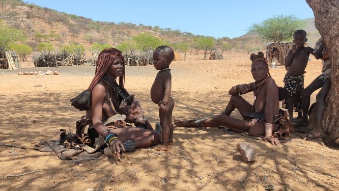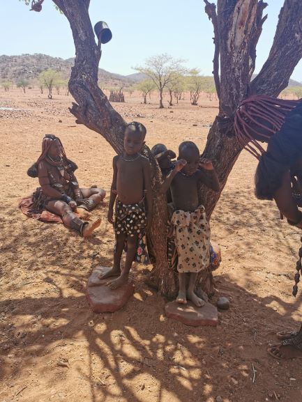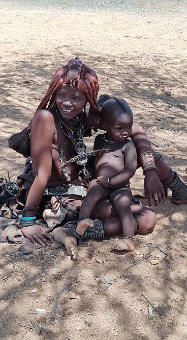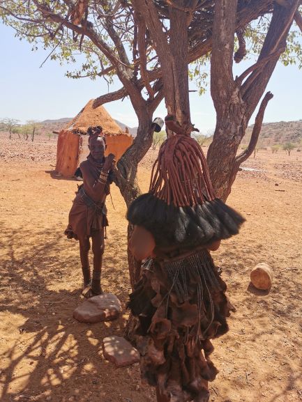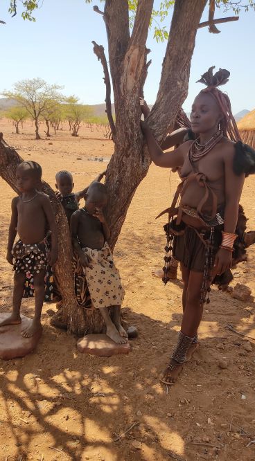 Après cette visite qui nous a ému et enchanté, nous repartons avec notre guide, une jeune fille de père Héréro et de père Himba, vers un village Himba authentique où ils n’ont pas l’habitude de côtoyer les touristes. Le village se situe à 5km de Epupa. Nous arrivons sur une grande plaine désertique de terre rouge où petit à petit nous apercevons le village Himba. Les femmes Himba nous accueillent et nous partagent leurs coutumes. La structure de leur hutte est faite de bois puis recouverte d’une sorte de boue rouge. Les hommes sont partis avec leurs troupeaux. Un homme peut avoir plusieurs femmes et passe de cahutte en cahutte selon son bon vouloir. Les enfants Himba ne vont pas à l’école. Nous passons une heure dans ce village, nous leur offrons des denrées et de l’eau pour leur confort.