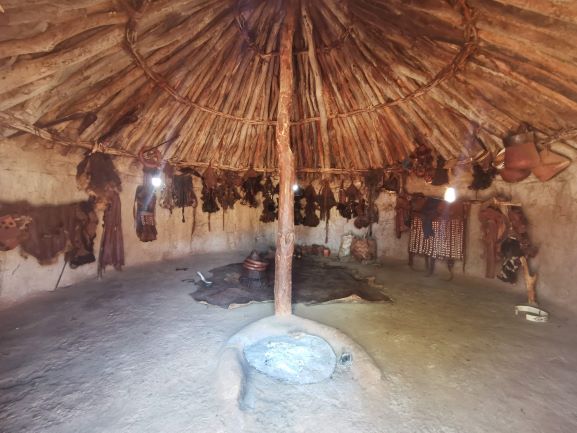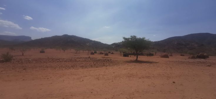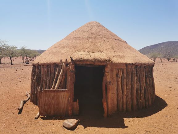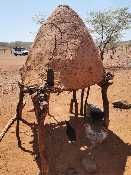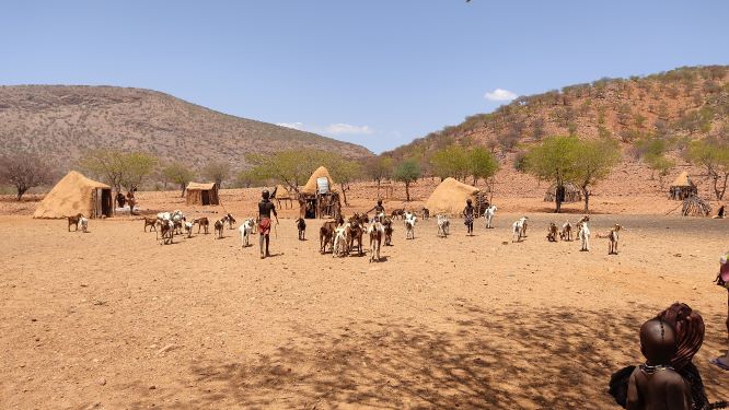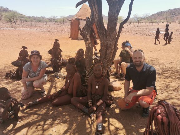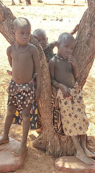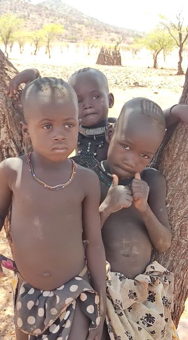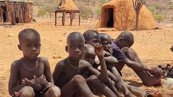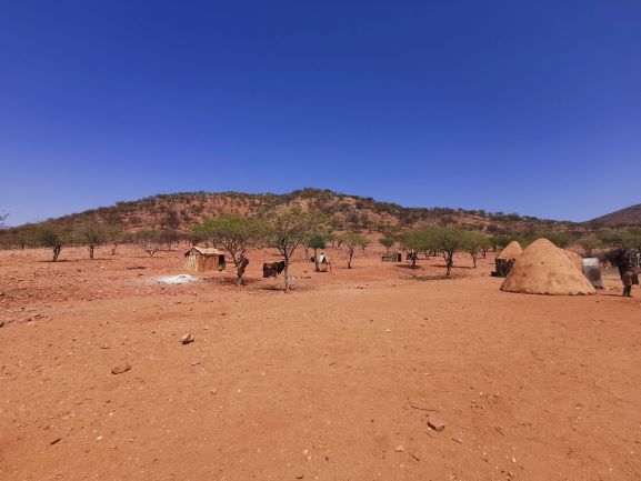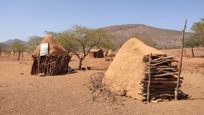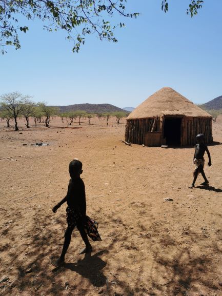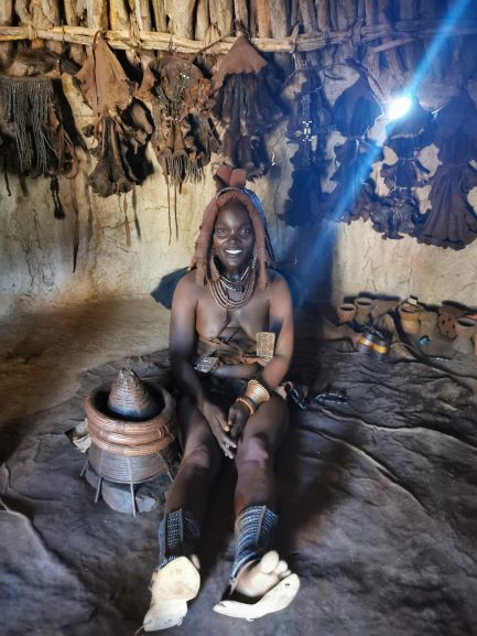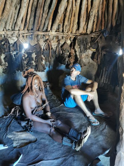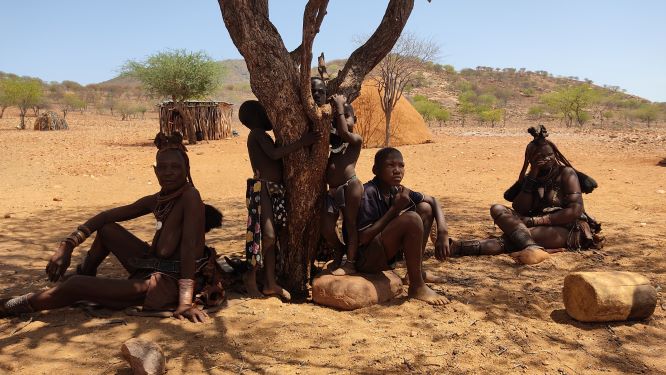 Après cette visite qui nous a ému et enchanté, nous repartons avec notre guide, une jeune fille de père Héréro et de père Himba, vers un village Himba authentique où ils n’ont pas l’habitude de côtoyer les touristes. Le village se situe à 5km de Epupa. Nous arrivons sur une grande plaine désertique de terre rouge où petit à petit nous apercevons le village Himba. Les femmes Himba nous accueillent et nous partagent leurs coutumes. La structure de leur hutte est faite de bois puis recouverte d’une sorte de boue rouge. Les hommes sont partis avec leurs troupeaux. Un homme peut avoir plusieurs femmes et passe de cahutte en cahutte selon son bon vouloir. Les enfants Himba ne vont pas à l’école. Nous passons une heure dans ce village, nous leur offrons des denrées et de l’eau pour leur confort.