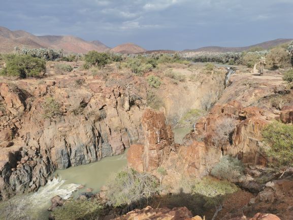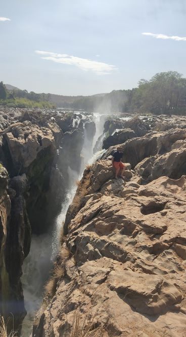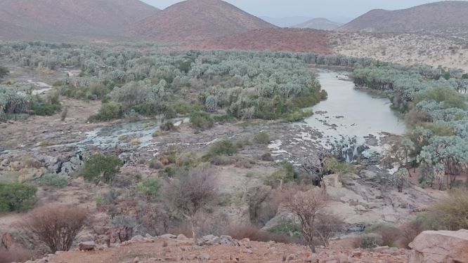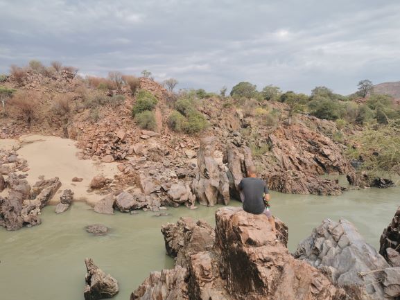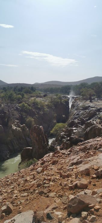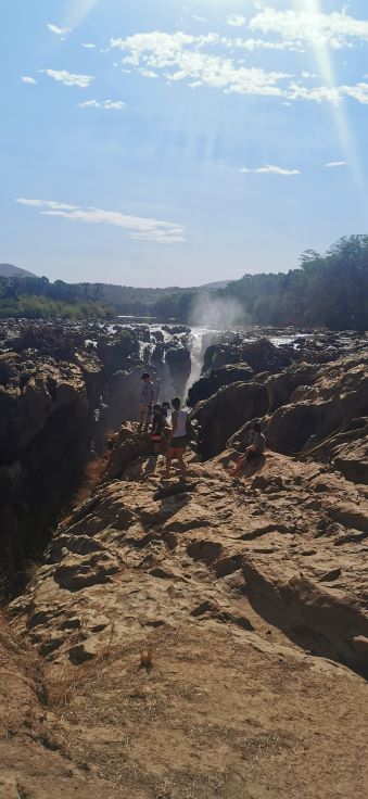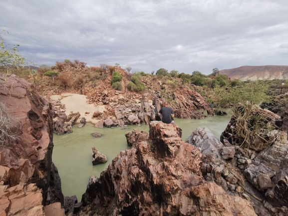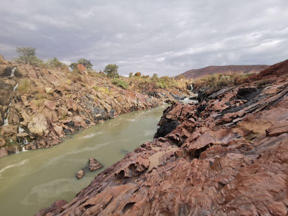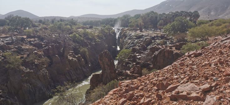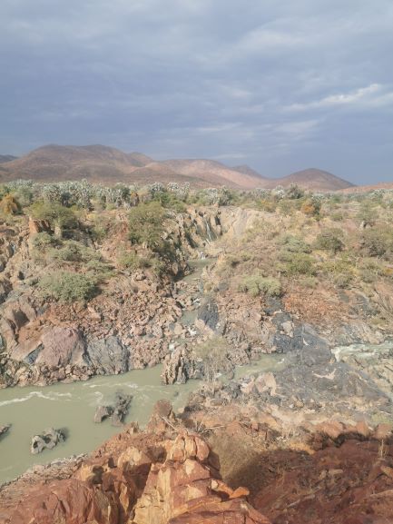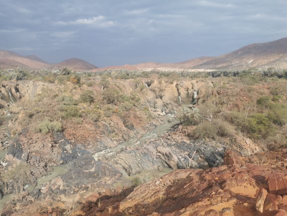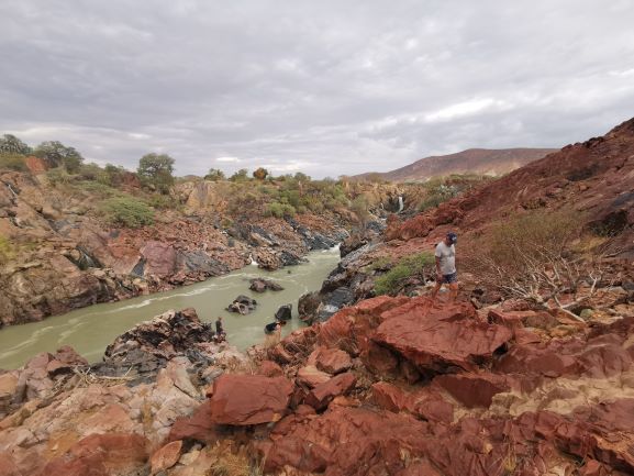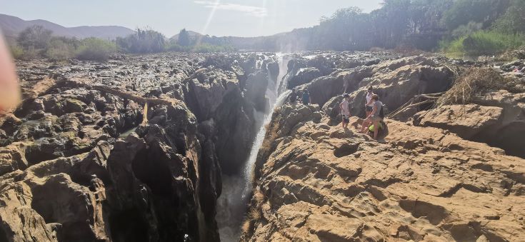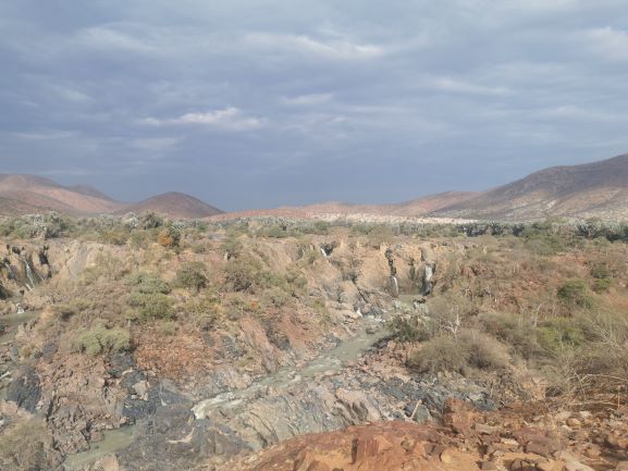 Nous rentrons au camping pour le déjeuner. Au moment du café, nous avons le plaisir de retrouver la famille Schmitt « Et pourquoi pas aller voir ailleurs ? » que nous avions rencontré à Swakopmund. Nous passons l’après-midi à discuter, et les enfants à jouer tous ensemble : 8 garçons, je vous laisse imaginer !!! En fin de journée, nous allons au point de vue sur les cascades d’Epupa pour prendre un apéro entre adultes. Nous avons vraiment bien fait, le panorama est juste exceptionnel : nous découvrons toutes les cascades d’Epupa éparpillées le long de la faille.