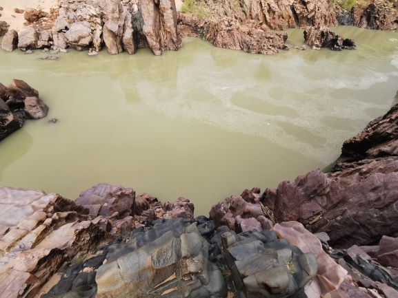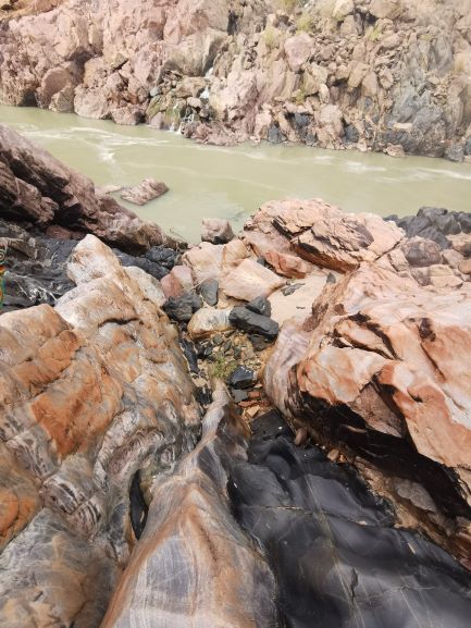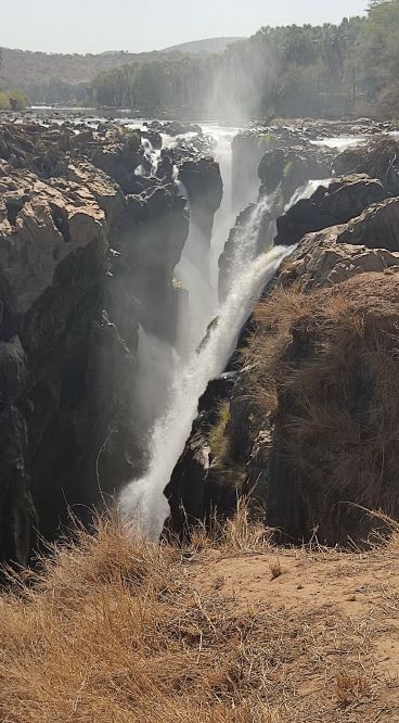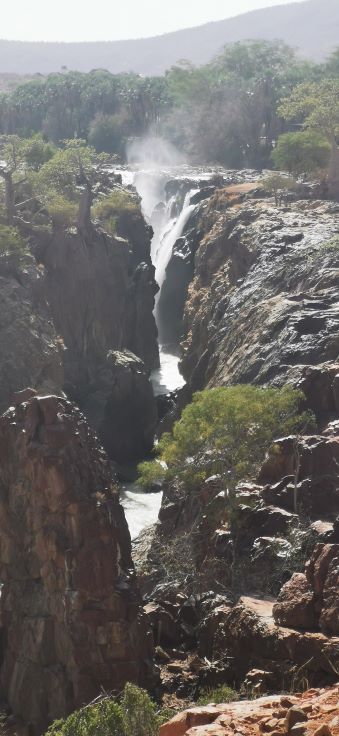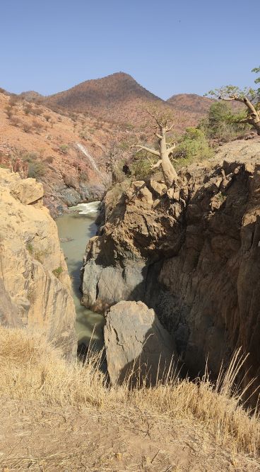 Puis nous partons nous promener et nous rejoignons les fameuses cascades d’Epupa qui sont à 500m du camping. La rivière Kunene qui sépare ici la Namibie de l’Angola tombe dans une faille de plusieurs dizaines de mètres en de multiples cascades, l’eau ruisselle de partout entre les roches, les baobabs et les palmiers. Nous trouvons un petit coin abrité pour se baigner. Cela nous fait penser à notre petit coin ardéchois, La Souche, les enfants s’amusent à faire des barrages en déplaçant les pierres de la rivière.