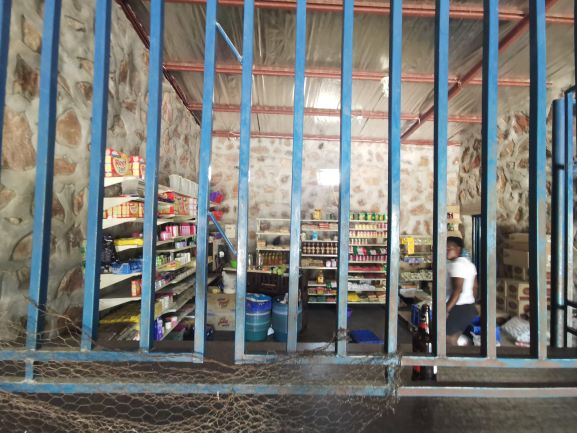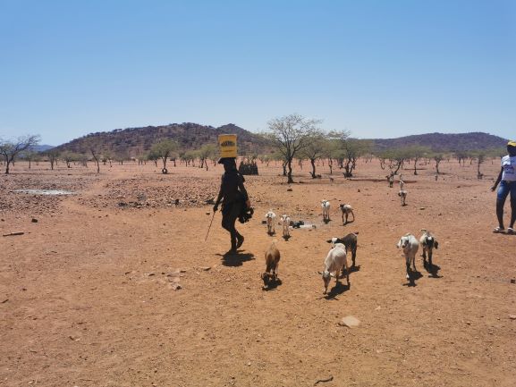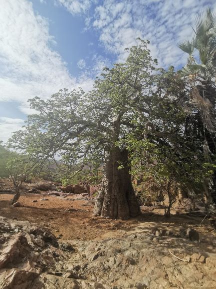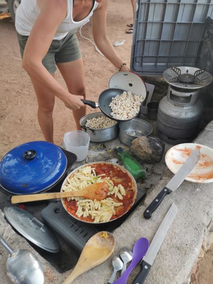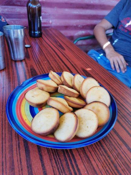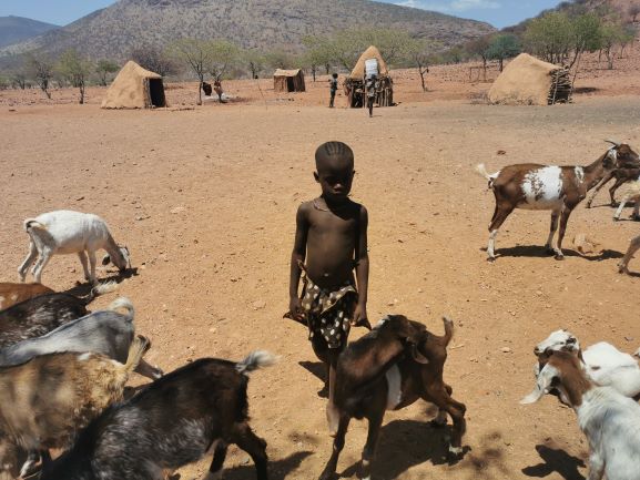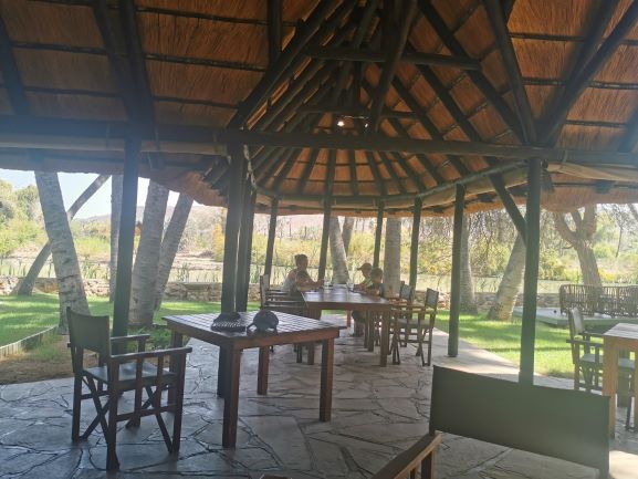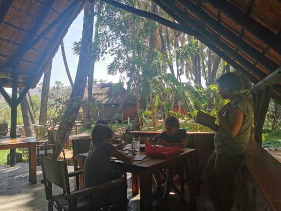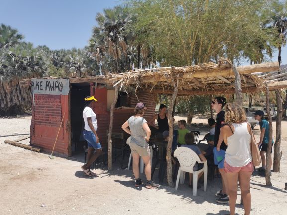 Nous revenons sur Epupa pour notre déjeuner. Nous avons réservé un « boui-boui » pour manger local : de la chèvre (un peu dur :p), du porridge, des pommes de terre le tout servi avec un très bon jus et enfin des petits gateaux maison en dessert. Nous rentrons tout juste les 14 sous la cahutte, c’est parfait.