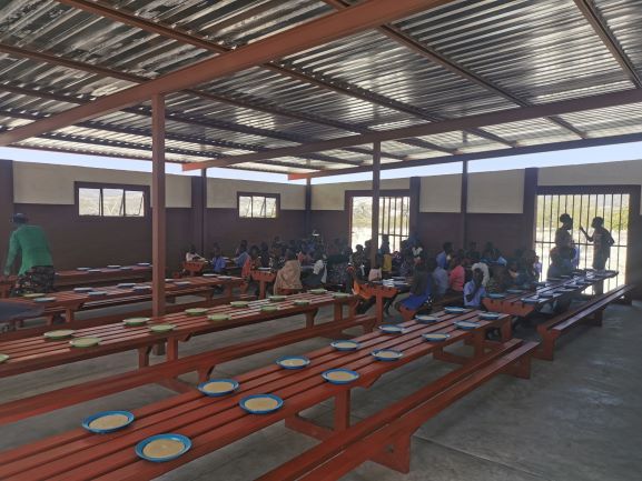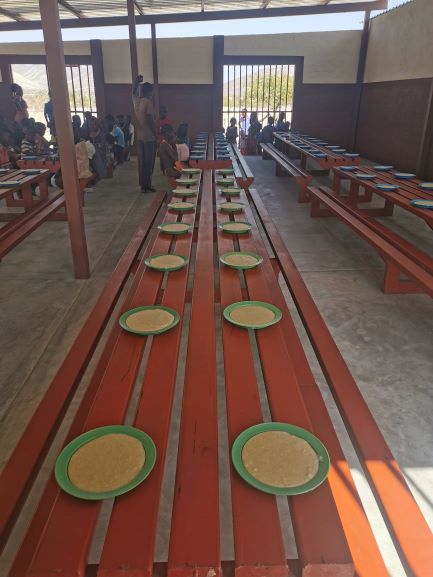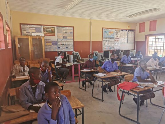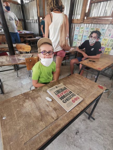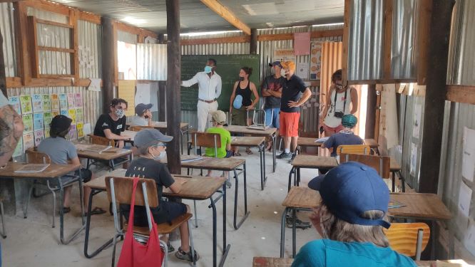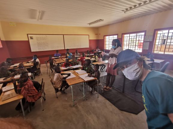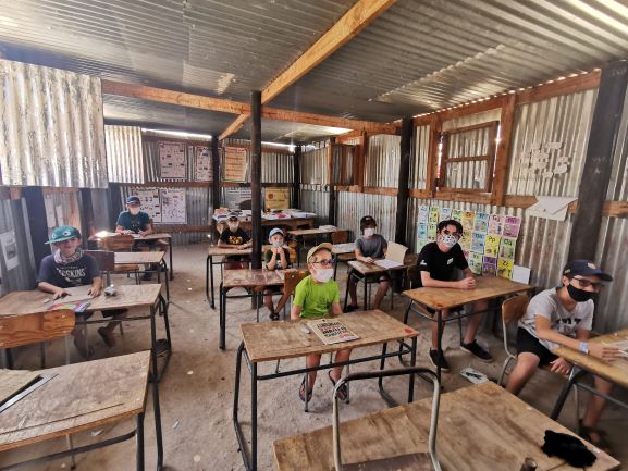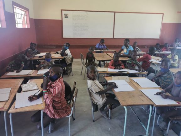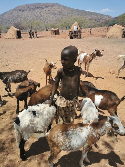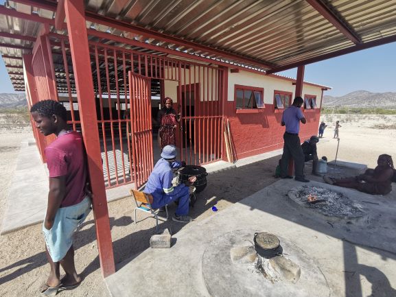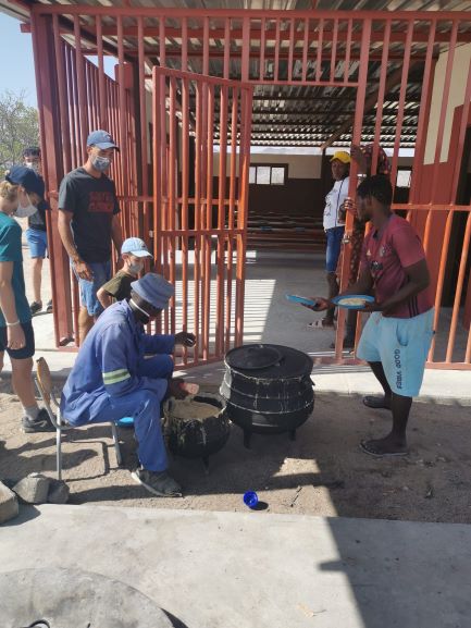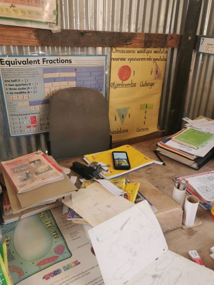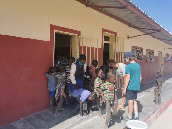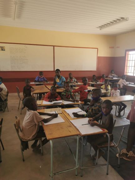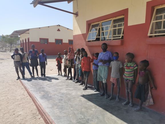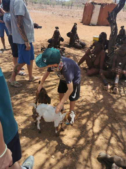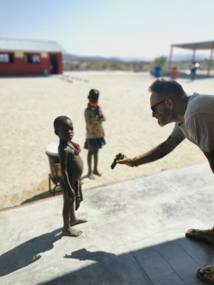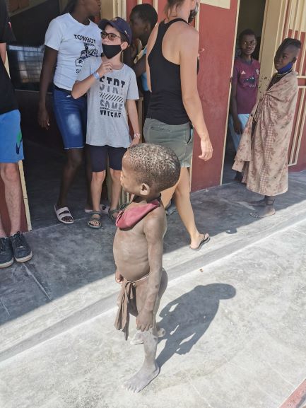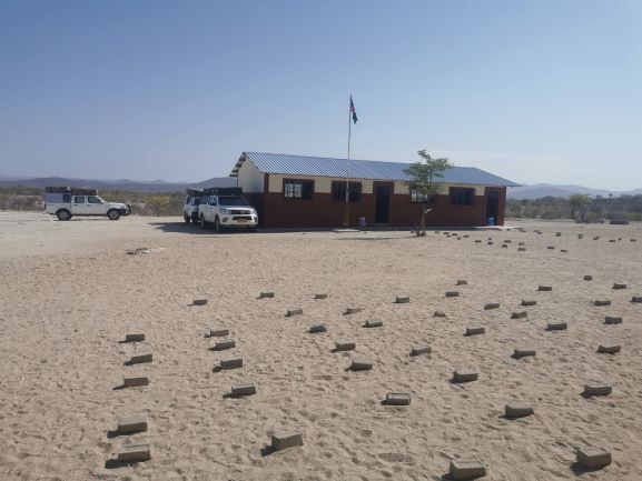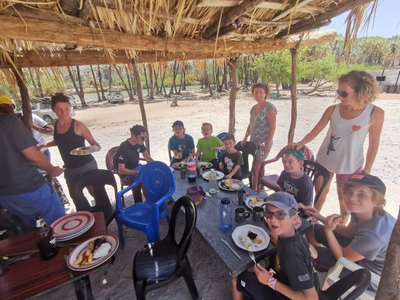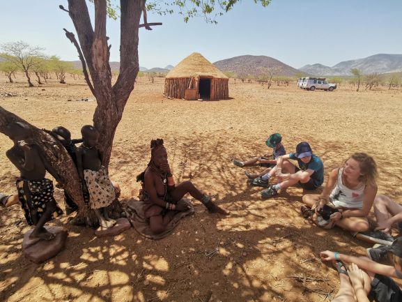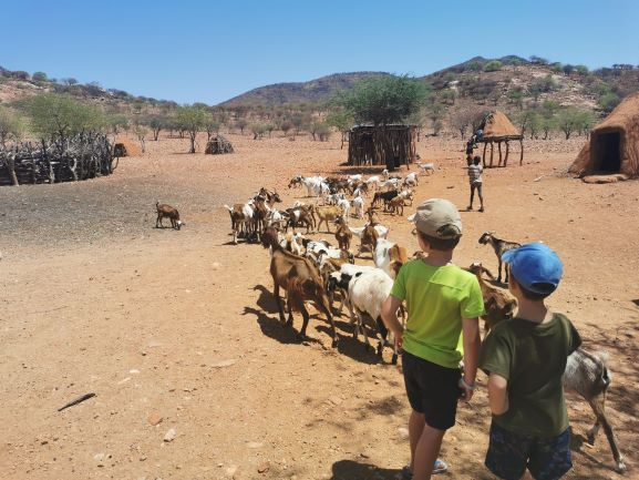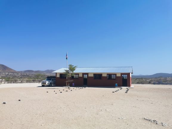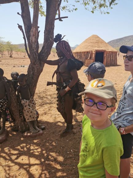 Sam nous a dégotté un super plan en discutant avec les petits marchands ambulants près de notre camping. Nous partons les 3 familles visiter une école au fin fond de cette région désertique. Nous parcourons 12 km de pistes très abimées par les précédentes inondations, au fur et à mesure que nous avançons nous nous demandons vraiment où peut être cette école. Nous sommes très surpris de découvrir une grande école avec plusieurs dizaines d’élèves. Le directeur nous reçoit et nous explique le fonctionnement. Nous rencontrons chaque classe et leur professeur. Nous sommes étonnés de voir que les consignes COVID sont arrivés jusqu’à eux : masques portés en classe et distanciation des bureaux de chaque élève d’un mètre. Les enfants restent à l’école du lundi au vendredi car ils viennent tous des villages « alentours », certains font plus d’une dizaine de kilomètres à pied pour se rendre à l’école. Les instituteurs eux sont sur place pendant 1 mois entier, ils rentrent chez eux plus rarement laissant leurs familles loin, comme ce professeur qui avait sa femme et sa fille à Opuwo à 3 heures de pistes de l’école. On a ressenti un vrai dévouement de la part de ces instituteurs. Les enfants commencent l’école à 7h. Ils ont une pause de 10h à 11h pour prendre le déjeuner : une sorte de porridge local leur est servi. Puis ils retravaillent jusqu’à 15h. Un second et dernier repas leur est servi à 18h et toujours le même porridge. Les dortoirs sont clôturés pour ne pas que les gamins filent à l’anglaise le soir. Le directeur doit remplir un registre quotidiennement et renvoyer pas mal de documents tous les trimestres pour justifier des besoins de l’école et recevoir les denrées essentielles en nourriture, eau (une denrée rare en Namibie mais encore plus dans cette région ! 7 ans qu’ils n’ont pas eu de pluie…), et affaires d’école. L’école nous a également offert un moment très émouvant pour nous : les plus grands ont chanté une chanson religieuse, digne d’une très belle chorale. Ils nous ont embarqué avec eux, les africains vivent tellement leur musique et leurs chants. Magique !!!
