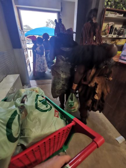 Lorsque nous arrivons, nous nous rendons au supermarché SPAR du coin pour faire le plein. Notre voiture se retrouve vite entourée sur le parking par plusieurs vendeurs ambulants, principalement des Himbas. Comme il est de coutume ici, un gars se propose de surveiller notre voiture moyennant un pourboire à notre retour. Nous prenons un vrai bain de foule dans le supermarché, les enfants sont un peu impressionnés. Malo ne me lâche pas d’un mètre. Nous n’avons pas osé photographier mais l’image était belle : un petit blond aux yeux bleus d’1m15 coincé entre une femme Herero avec sa longue robe africaine très colorée et son chapeau en forme de corne de buffle et les deux Himbas seins nues avec une jupe en peau de chèvre…