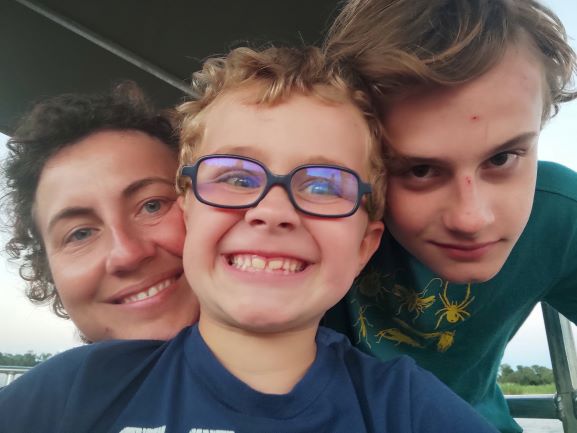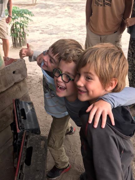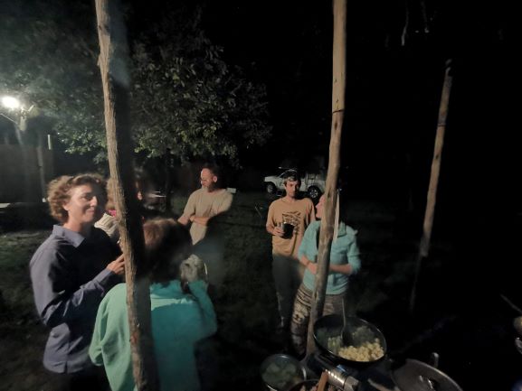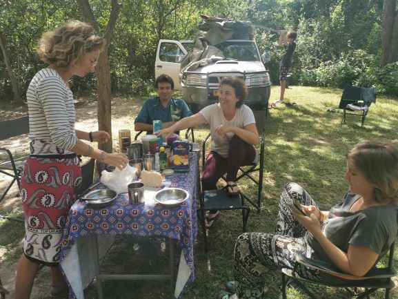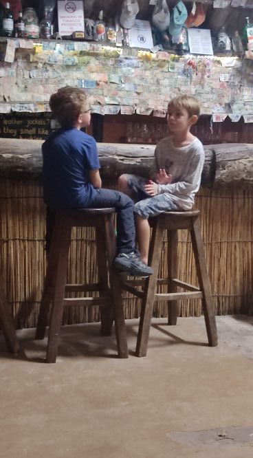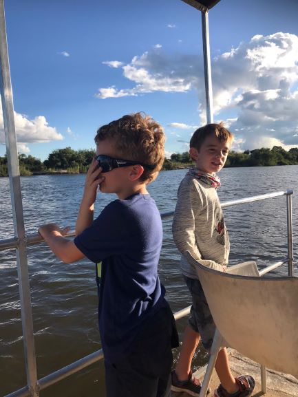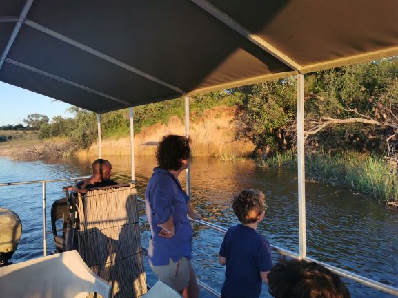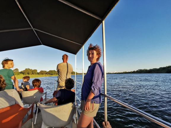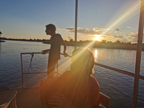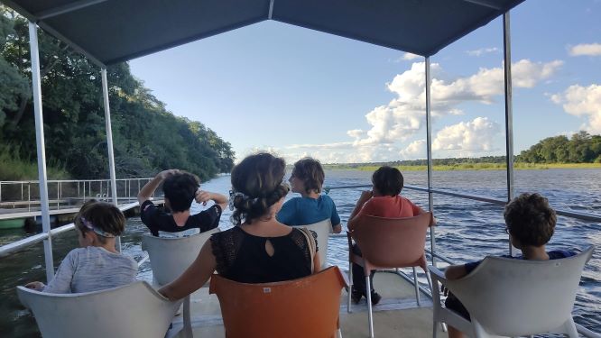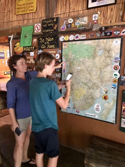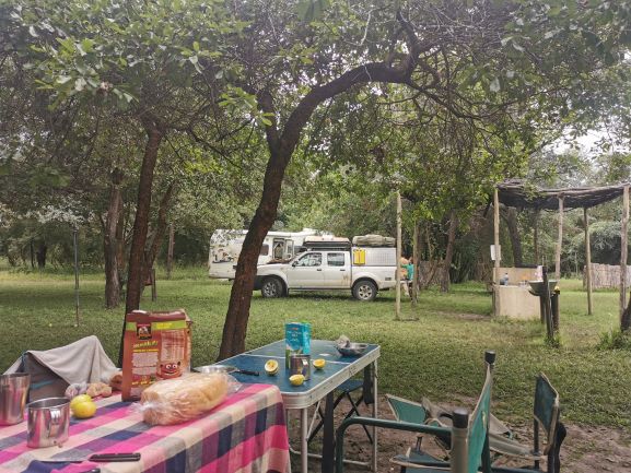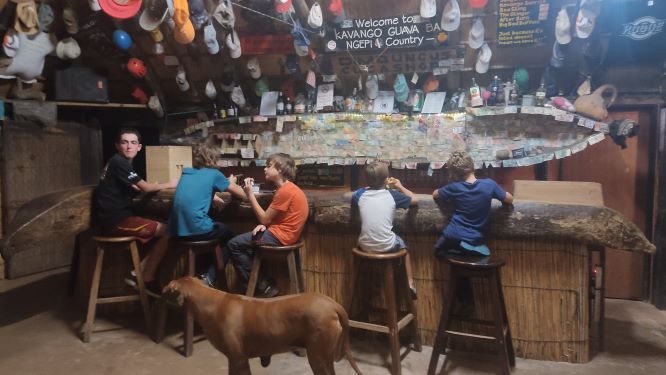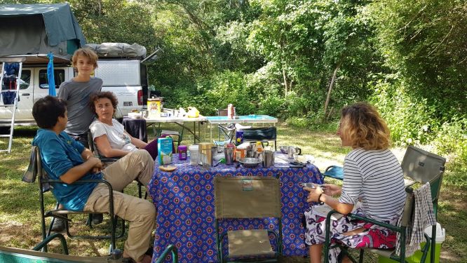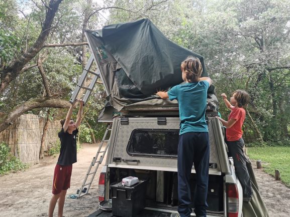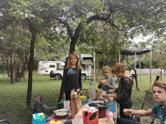 Nous arrivons un peu limite avant la tombée de la nuit dans un camping que nous avons eu du mal à trouver. En effet, nous sommes arrivés à hauteur du Mudumu National Park. Il y a tellement peu de touristes dans la zone, que les lodges sont fermés. Le camping accepte de rouvrir la zone de campement rien que pour nous ! Nous sommes rejoint ce soir-là par une grande famille de baroudeurs, déjà croisée en Suède en septembre, les untouracinq. Ils ont tracé depuis la frontière du Botswana pour nous rejoindre dès le soir même, alors que ce n’est pas dans leurs habitudes. Nous sommes heureux de tous nous retrouver. Nous partageons un bon apéro et un bon repas en discutant d’Afrique, de voyages, d’enfants…