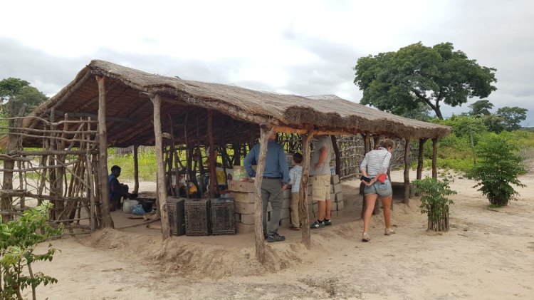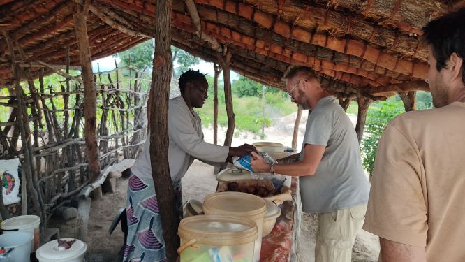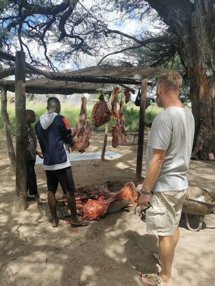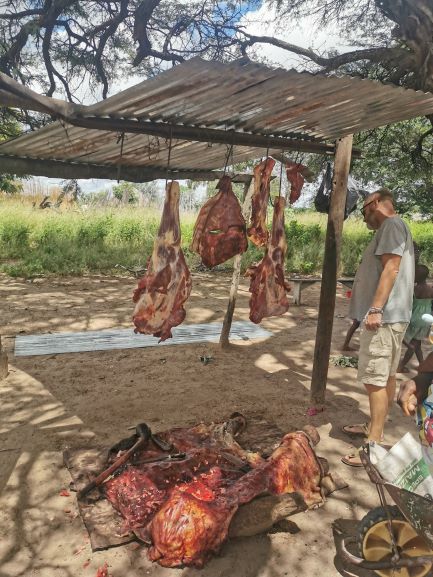 Après une bonne nuit où certains d’entre nous ont entendu l’hippopotame se promener autour des 4×4, nous partons pour la journée. Nous faisons une halte pour quelques courses. Notamment notre ami Stéphane s’essaie au marchand du bord de route, ici le boucher avec une viande de vache toute fraiche mais déjà envahie de mouches.