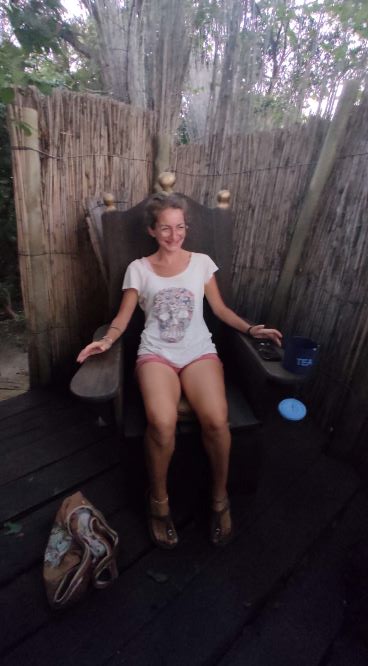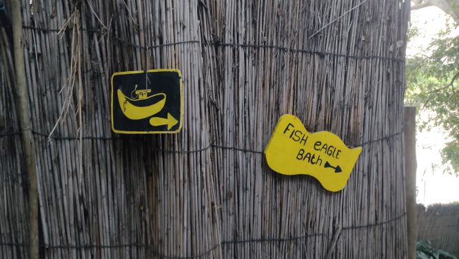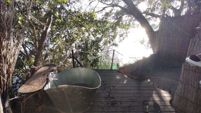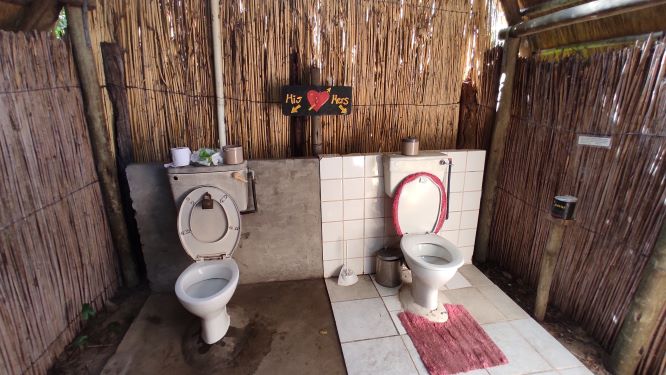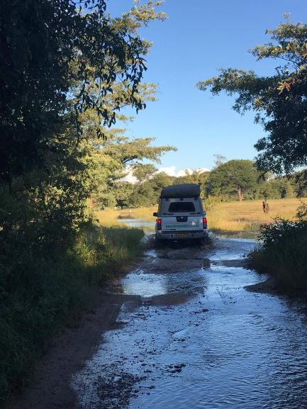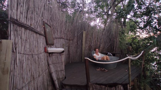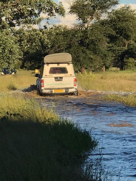 Nous reprenons la route pour s’arrêter pour la nuit à Divundu. Nous trouvons un superbe campsite, sûrement un de nos favoris, plein d’humour avec des installations sanitaires qui sortent de l’ordinaire. Il est situé le long de la rivière près des crocodiles et des hippopotames qui viennent souvent à la nuit tombée se balader dans le camping. Pour se rendre au camping, on s’exerce de nouveau aux 4×4 un peu extrême avec des énormes marres à traverser.