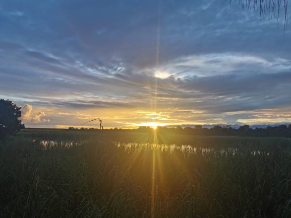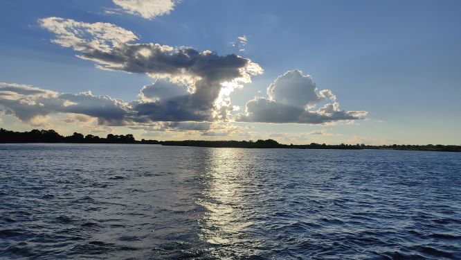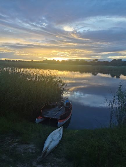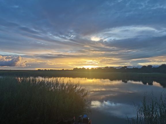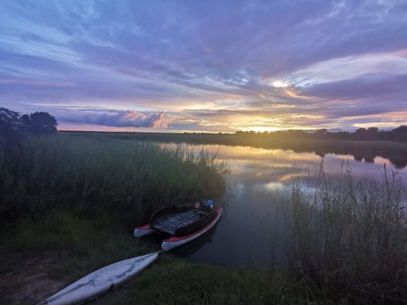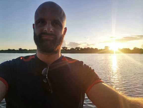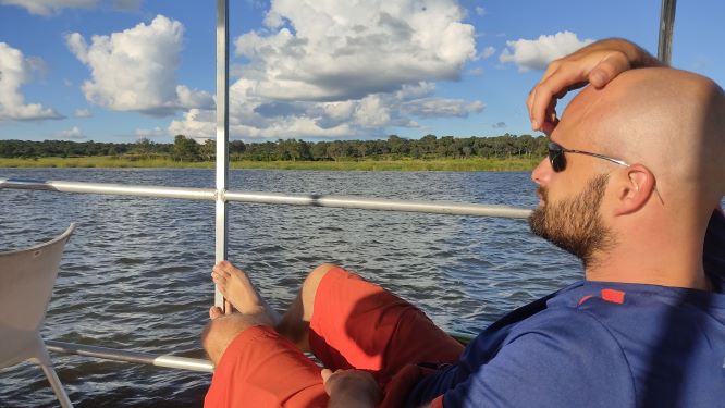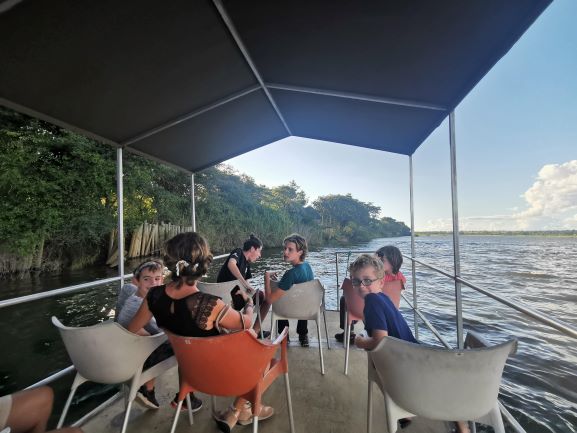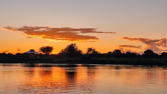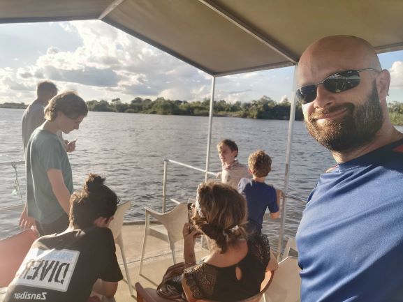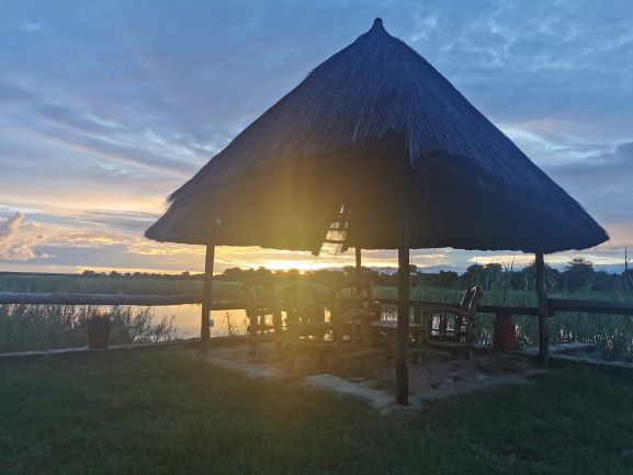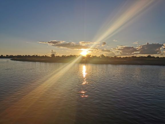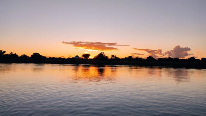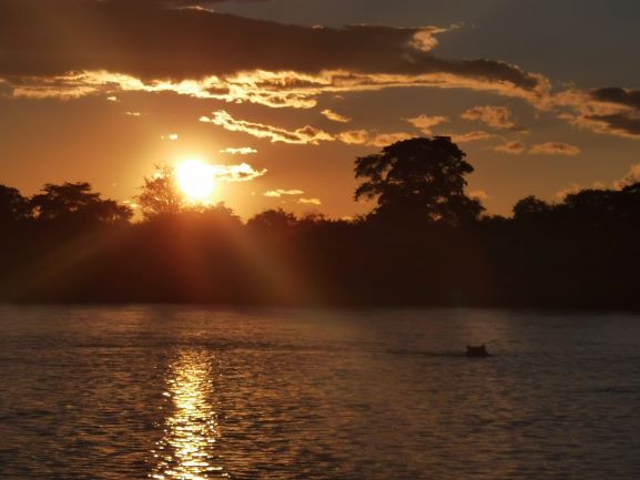 Nous rentrons pour 17h au campement car nous sommes attendus pour une croisière sur la rivière au coucher du soleil. Nous rencontrons des groupes d’hippopotames qui essaient de nous intimider pour certains. Il y en a même un qui bondit très haut au dessus de l’eau. Nous voyons également un crocodile nager et un autre lézarder au soleil couchant. Nous rentrons à la fin du coucher de soleil qui nous offre un très beau spectacle aux couleurs oranger.