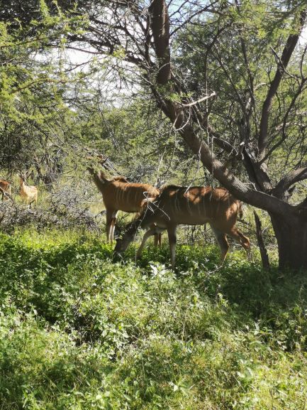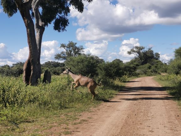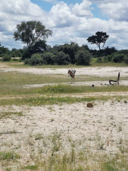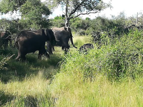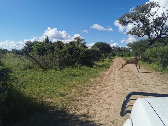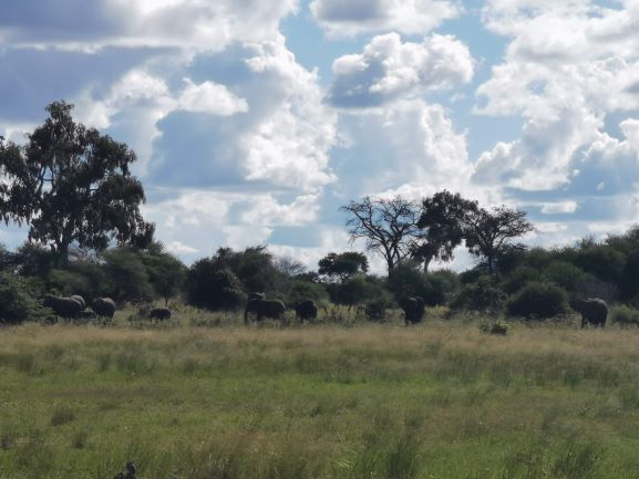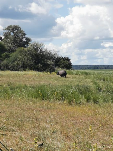 Nous nous rendons ensuite au parc Mahangu, la première réserve sur notre route de Caprivi. Au vue des inondations récentes de la région, seule une toute petite partie est ouverte : 30 km de piste aller/retour sont praticables. Et pourtant malgré ce petit parcours, à comparer de grands parcs comme Etosha, on en prend plein les yeux : des koudous, springboks, girafes, phacochères, puis un peu plus tard l’hippopotame, des troupeaux de dizaines d’éléphants avec leurs petits et pour finir nos premiers buffles… Nous adorons ce parc, tellement de choses à voir en peu de temps. On ne ressent pas la fatigue des recherches infructueuses qui durent des heures comme nous avons pu connaître à Etosha.
