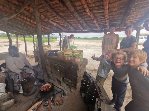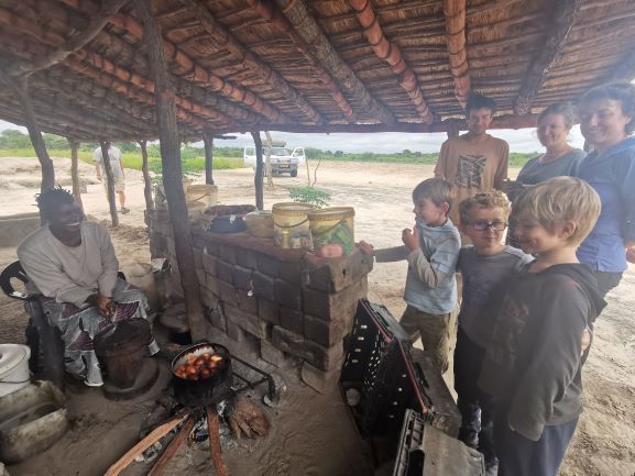 Tous les parcs du sud de la bande de Caprivi sont fermés à cause des récentes inondations. Nous décidons tous ensemble de ne pas aller plus loin dans Caprivi et de commencer à reprendre le chemin du retour. Nous tentons un dernier parc, le Bwabwata park qui longe une bonne partie de la route de Caprivi mais les gardes n’autorisent pas le camping-car à y circuler. Nous rencontrons un couple de français qui sort tout juste du parc et nous informe que même en 4×4 ça ne vaut pas vraiment le coup. La végétation est beaucoup trop fournie et haute pour apercevoir des animaux. Alors sans regret, nous reprenons tous ensemble la route principale jusqu’à Divundu. Nous ferons quelques petits stops pour acheter des beignets sur le bord de route et pour que la famille Schmitt donne des t-shirts aux enfants que l’on croise sur le bord de route. Nous dormons au camping des Popa Falls, accessible aussi bien aux 4×4 qu’au camping-car ce qui nous permet de profiter d’une dernière soirée entre les 3 familles.