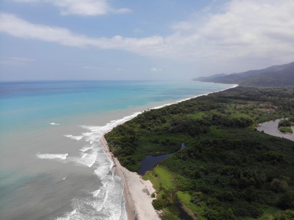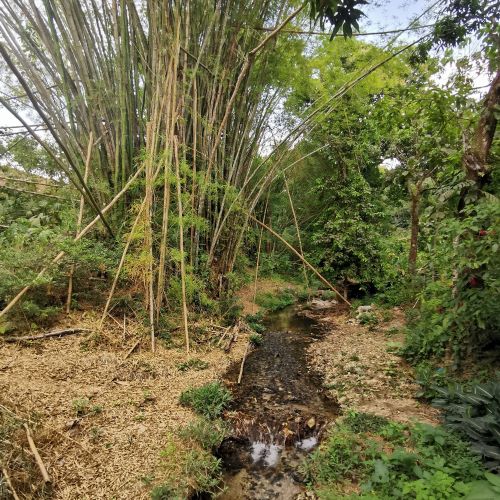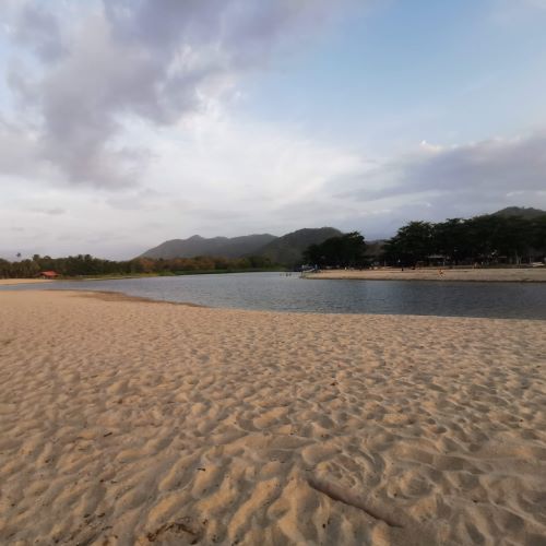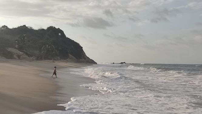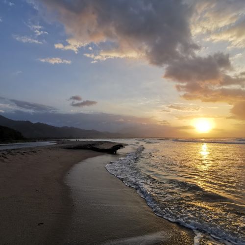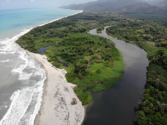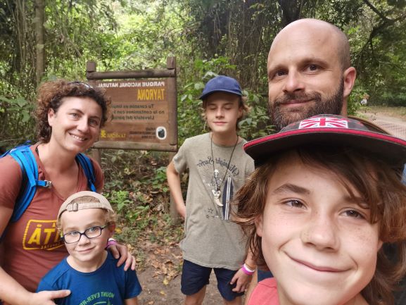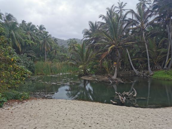 Nous faisons un premier stop à Buritaca, une plage que nous avait conseillée notre hôte de Santa Marta. Nous sommes super bien accueillis par un colombien qui nous invite à nous garer sur le parking de son hotel pour rejoindre la plage. En échange, on s’offre un bon petit « Jugo naturales de Maracuja », comprenez jus de fruit frais aux fruits de la passion, un régal ! La plage est déjà fermée à cause du Covid, dès 16h, mais on peut se baigner dans la rivière qui sépare le village de la plage. Le coin est vraiment très joli. Les enfants apprécient la baignade et nous le bruit des vagues et la fraicheur marine.