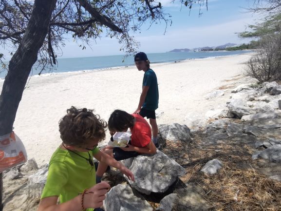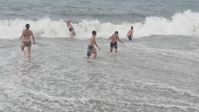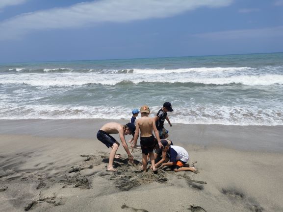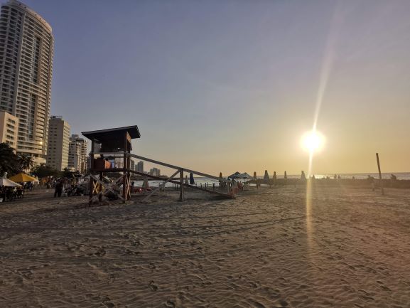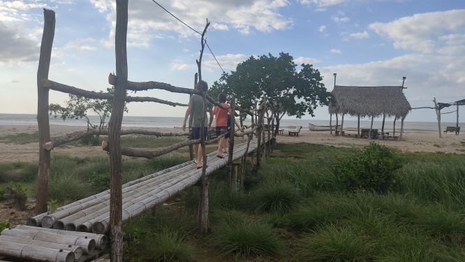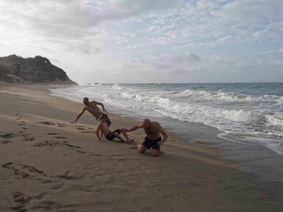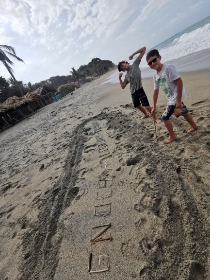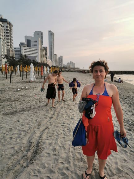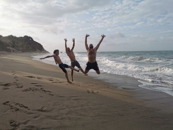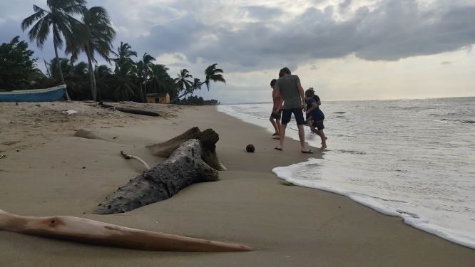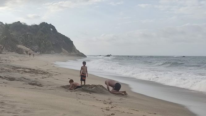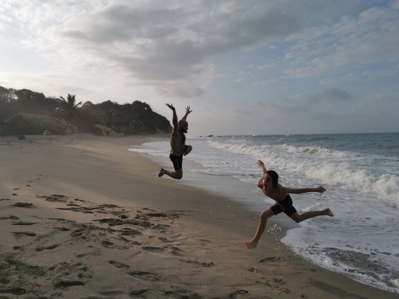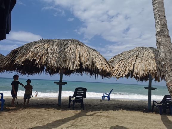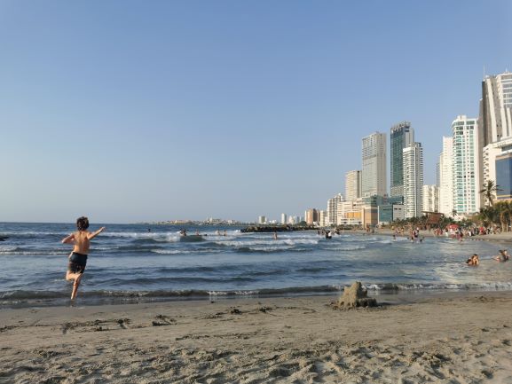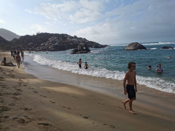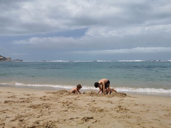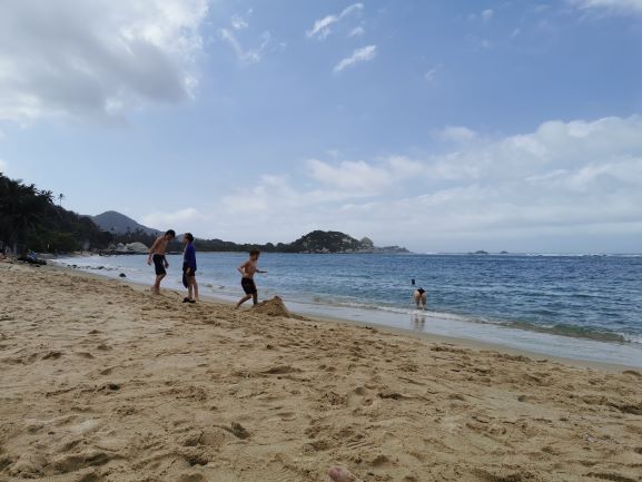 Les enfants trépignent de pouvoir aller se baigner dans la mer alors nous nous motivons après le goûter pour faire un tour à la plage. Nous sommes arrivés pendant un week-end férié : la plage est bondée de colombiens chacun écoutant sa propre musique. Il y a pleins de vendeurs à la sauvette pour des chapeaux, des bijoux, des objets en bois, de la nourriture, des boissons et des massages… il y en a pour tous les goûts. Au vue du passage du week-end, la plage est plutôt sale mais les enfants apprécient la baignade et s’en donnent à cœur joie.