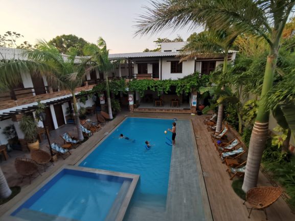 Nous arrivons en fin d’après-midi au Camali Hotel, une très belle auberge construite et tenue par un français installé en Colombie depuis vingt ans. Il l’a fait dans le style du village de Villa De Leyva avec deux grands patios, dont un réservé à une très belle piscine. Nous sommes tous ravis de profiter d’un peu de confort pendant quelques jours. Nous y retrouvons nos amis Les 5 couleurs primaires.