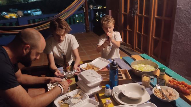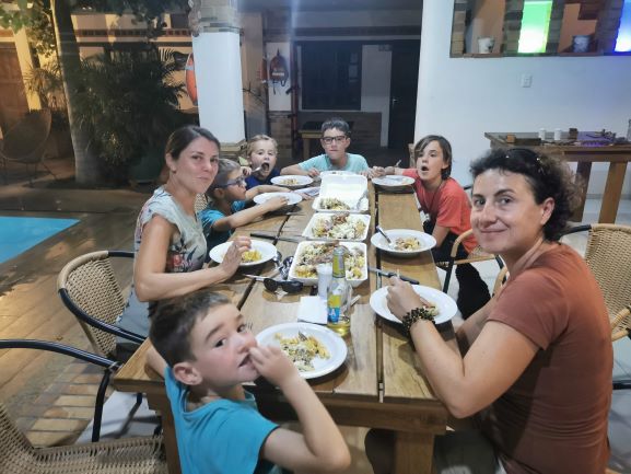 Le lendemain, nous profitons de cette journée de repos pour faire l’école, se mettre à jour sur le blog, sur l’organisation de la suite du voyage… Même si nous avons fait les courses pour tous nos repas, nous craquons le soir pour un repas Pachamama livré à domicile 🙂