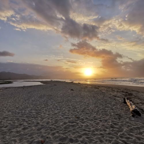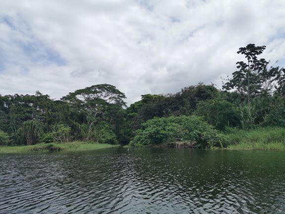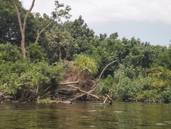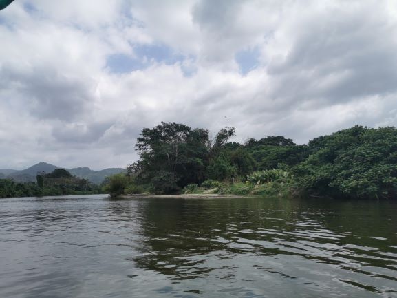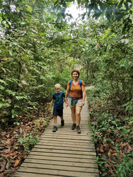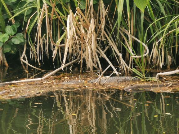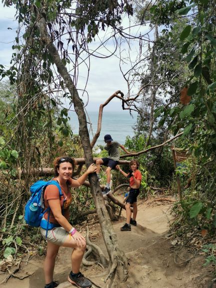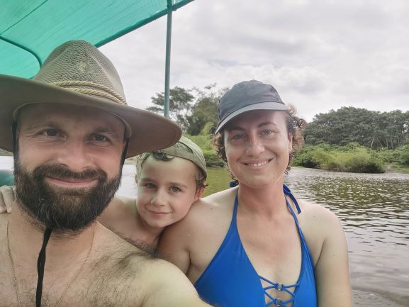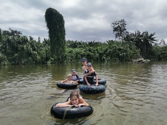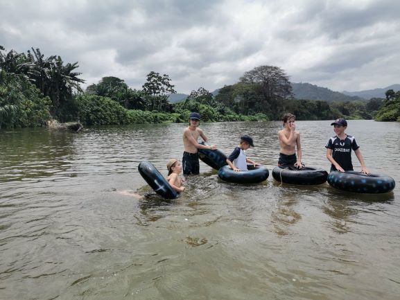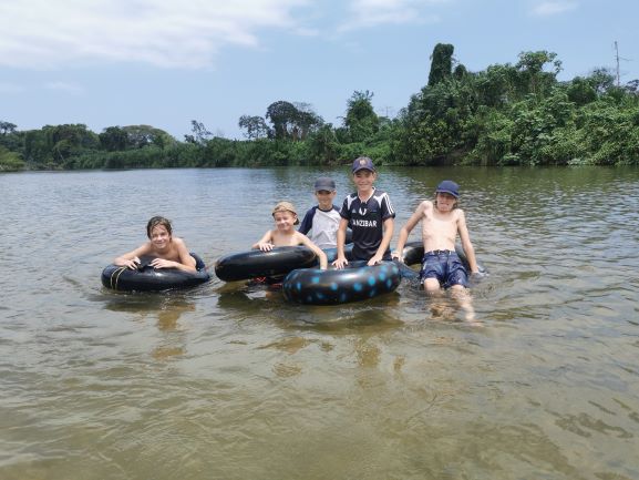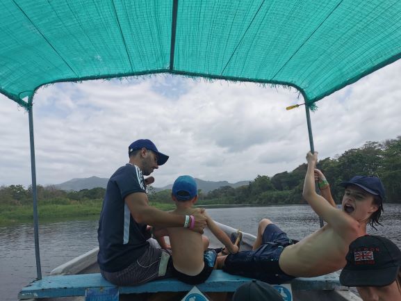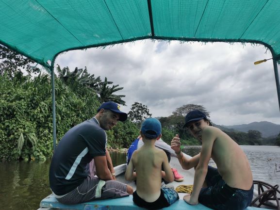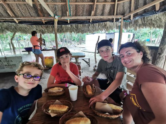 Le lendemain, nous partons tous ensemble pour une activité de descente de rivière en bouée. Nous avons rendez-vous à côté du Rio Don Diego, il s’agit d’une des multiples rivières de la côte qui se jettent dans la mer. Les bouées sont en fait des chambres à air de camion recyclées en bouée. Nous laissons toutes nos affaires dans les voitures et nous partons en maillot, les fesses dans les bouées, tirés par nos deux guides dans la rivière. L’un des guides s’occupe finalement que de nos enfants, le pauvre, 6 garçons dans l’eau c’est pas du repos !! Et l’autre nous tire, les parents sont en mode feignasse. Mise à part le côté très ludique de cette activité, nous apprécions la proximité que cela nous offre avec la nature. Comme nous descendons en silence se laissant guider par le courant, nous n’effrayons pas la faune. Nous observons multiples oiseaux, singes, tortues et mêmes des petits crocodiles !! Nous débouchons sur une plage de sable blanc déserte, seulement une petite échoppe pour nous vendre des boissons. La mer est forte à cet endroit, les enfants ne pourront se baigner mais ce n’est pas grave, ils ont de quoi faire en construction de sable. Après une petite heure de pause, nous retournons à notre point de départ en bateau cette fois-ci nous permettant d’approcher de nouveau la faune des bords de rivière.