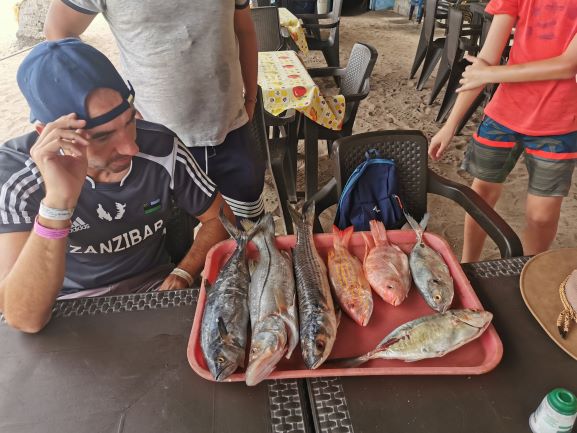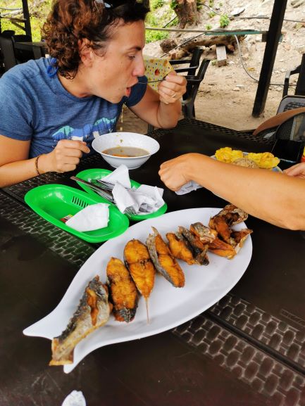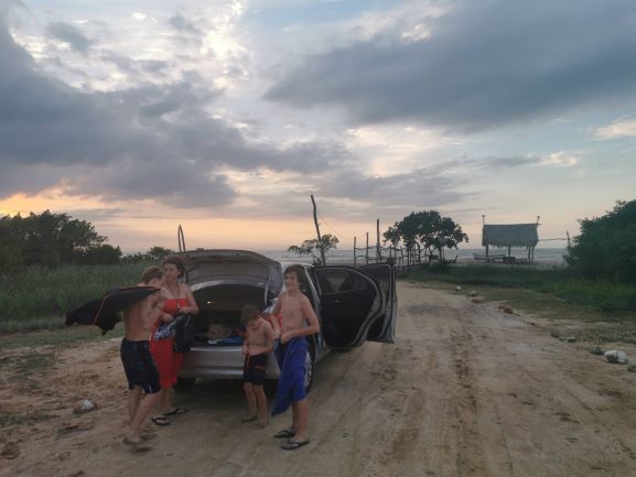 Sur cette jolie plage se trouve un petit restaurant local. Nous leur demandons la carte. Oh surprise ! Ils nous ramènent le plateau des poissons fraichement pêchés pour choisir celui qui finira à la casserole. Mise à part qu’ils ne savent pas cuisiner le poisson autrement qu’en le faisant bien frire, nous nous régalons de notre repas copieux. Nous profitons ensuite de la baignade avec nos enfants. La mer ici est très agitée et les vagues vraiment puissantes, les grands s’éclatent !