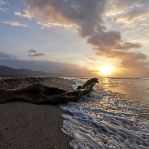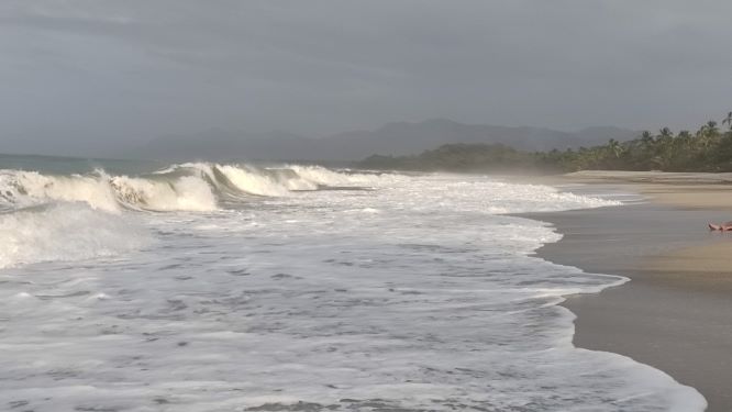 Du coup, nous sortons l’après-midi et profitons d’avoir la voiture pour aller un peu plus loin dans un village de pêcheurs pour retrouver de la tranquillité. Là-bas, nous trouvons la plage de Los Remedios, cités dans quelques blogs de voyageurs. La plage est belle et surtout il n’y a personne. L’eau n’est pas très claire car ici sur la côté, la mer est plutôt déchainée. Les vagues sont très fortes, ça remue. Les enfants sont contents comme toujours de cette pause balnéaire. Nous restons jusqu’à la tombée du jour. Nous nous changeons à côté d’une propriété privée. Un gars nous enverra ces deux gros molosses pour nous faire fuir, autant vous dire que c’est efficace 🙂