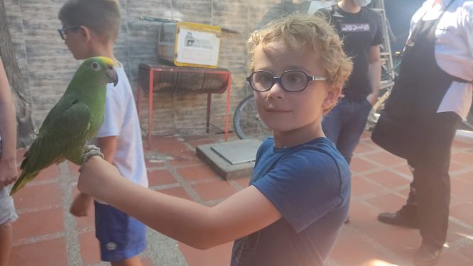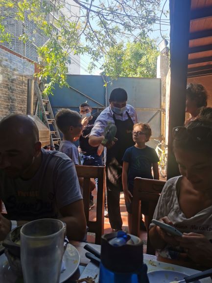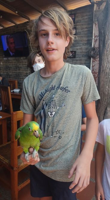 Le midi nous nous retrouvons tous ensemble et partons déjeuner dans un restaurant local recommandé par notre hôte pour ses cassolettes de la mer. En attendant notre repas, nous faisons connaissance avec le perroquet du restaurant.