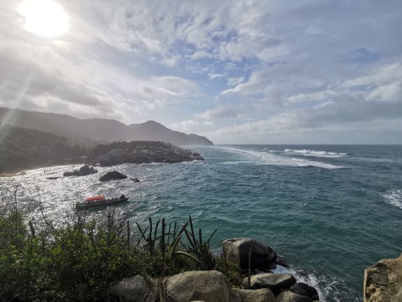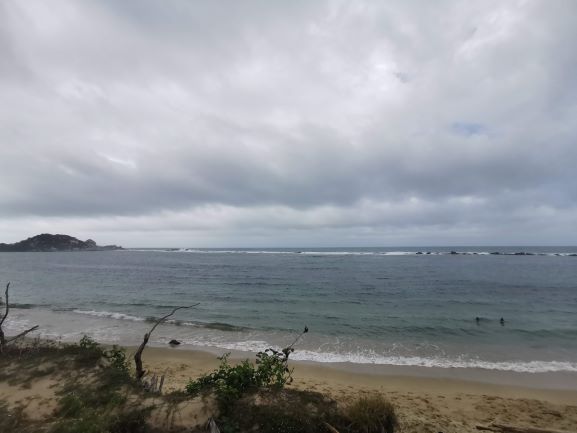 L’entrée dans le parc est très chère alors nous avons décidé de dormir dans la réserve pour bien profiter de l’expérience. Nous avons réservé deux tentes dans un camping. Nous nous enregistrons au camping puis nous préparons nos affaires pour la randonnée qui nous attend et c’est parti. Nous nous enfonçons dans la jungle. L’air est très humide et chaud, on sue très vite à grosses gouttes. Nous restons à l’affut de la faune : oiseaux ou singes. Il y a énormément d’espèces d’oiseaux en Colombie en général, ils sont tous plus colorés les uns que les autres. Nous apprécions notre randonnée dans la jungle, les paysages que nous traversons sont dignes d’un film d’Indiana Jones. De temps en temps, nous nous rapprochons de la côte, et découvrons de magnifiques plages de sable fin et des eaux turquoises.
