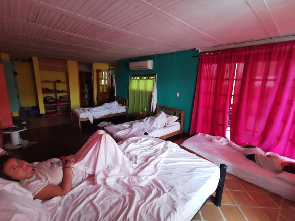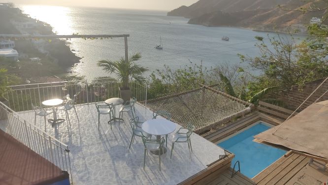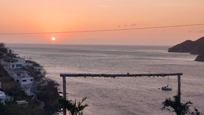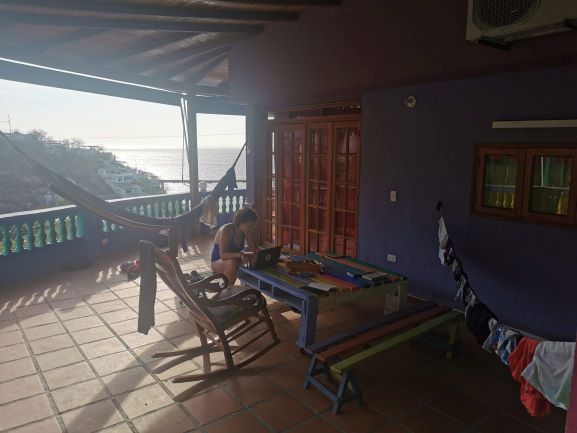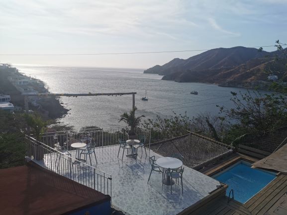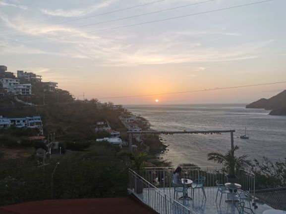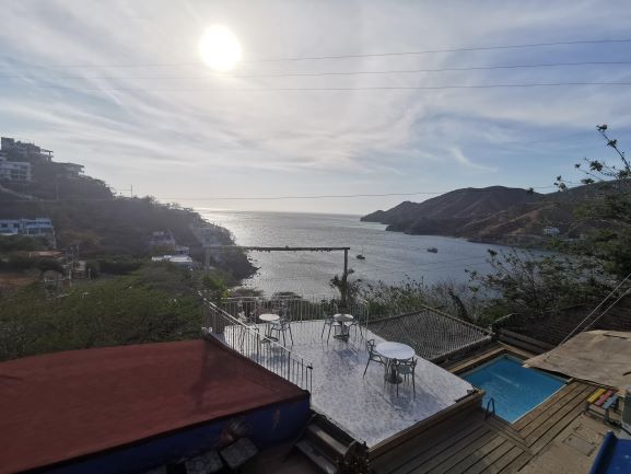 Nous nous posons à Taganga, au Tayron Colors Hostel, une auberge recommandée par nos amis. Elle est située sur les hauteurs de ce village de pêcheurs avec une vue splendide sur la mer. Nous avons un petit appartement avec une grande terrasse. Tout est parfait pour passer notre journée de confinement. Nous nous pressons le soir pour aller dîner dans le village avant le couvre-feu de 20h. Nous mangeons au restaurant le Pachamama, encore un super conseil de nos amis. Il est tenu par un marseillais. Le cadre est top, et la nourriture, un régal : ceviche, moules, tapenades, frites maison et j’en passe… j’ai même le droit à une part de crumble aux pommes à emporter sur le fil car les 20 heures ont déjà sonné !