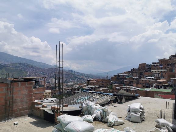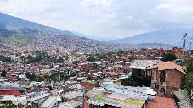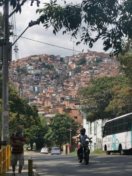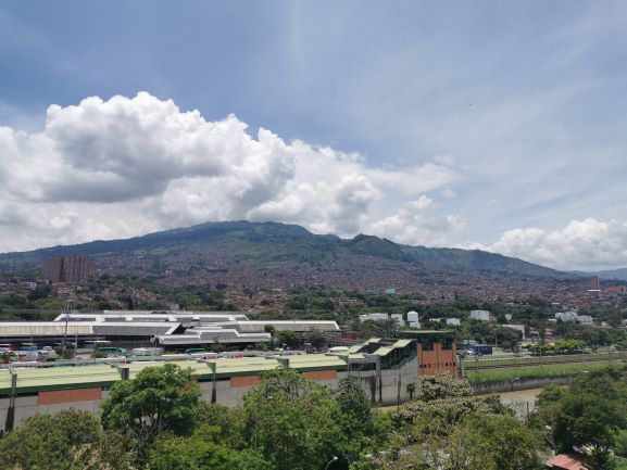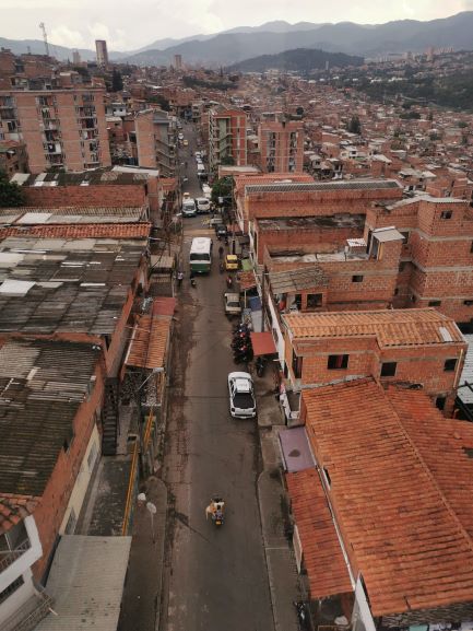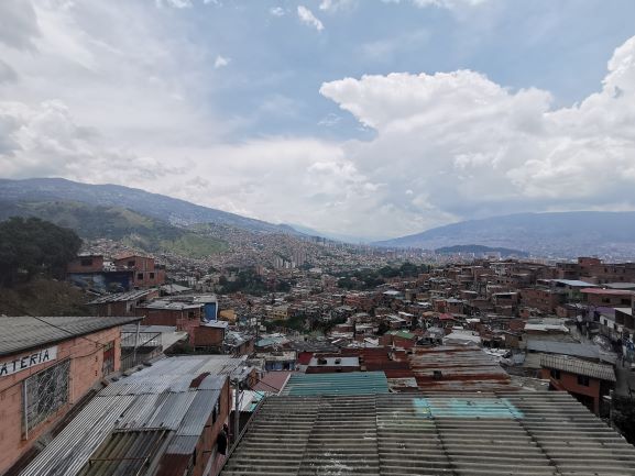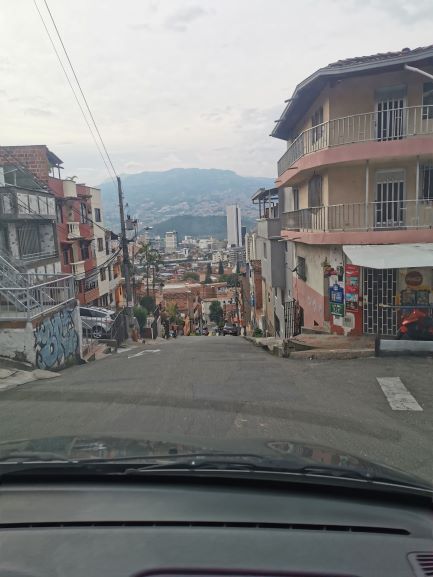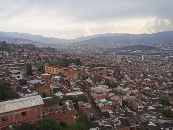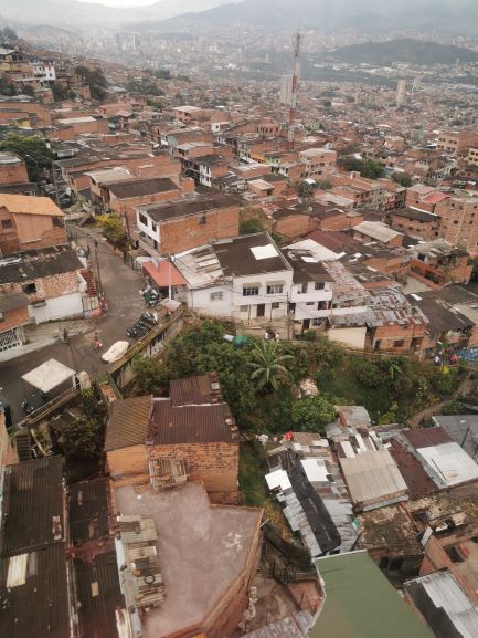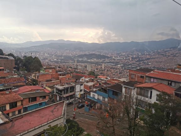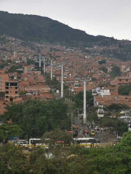 Nous arrivons sur Medellin en fin de journée par le vol de 17h. L’aéroport est situé sur les hauteurs par rapport à la ville. A la sortie d’un tunnel, nous découvrons un panorama incroyable : la ville immense qui s’étend dans la vallée et ses quartiers qui grignotent petit à petit les flans de montagne.