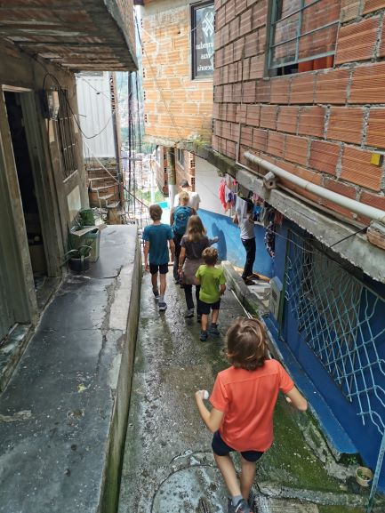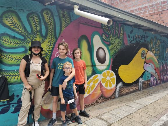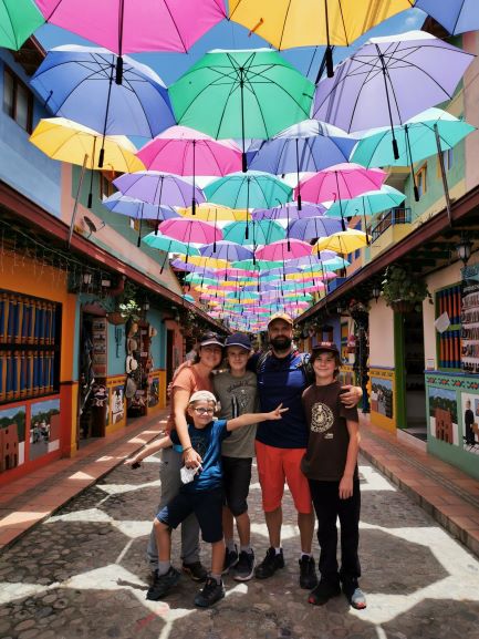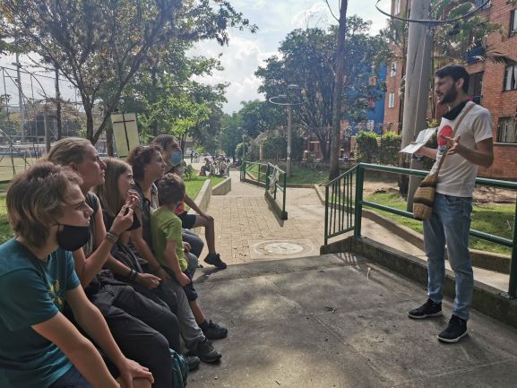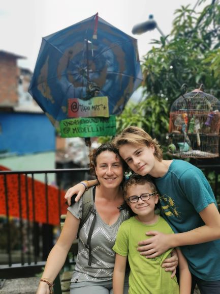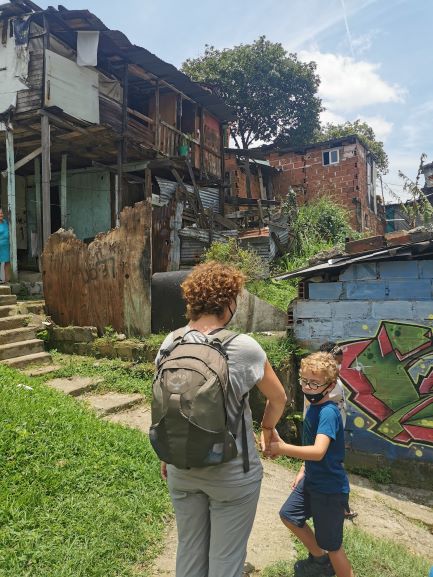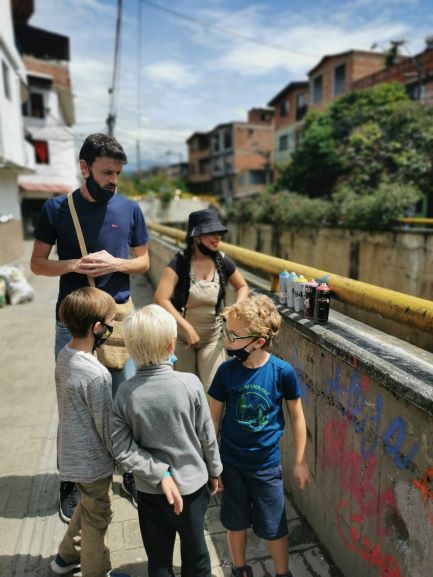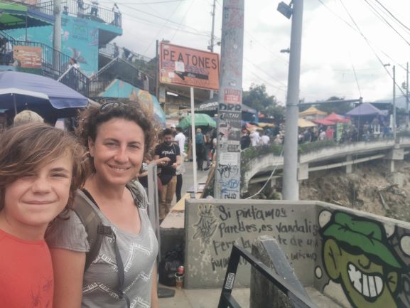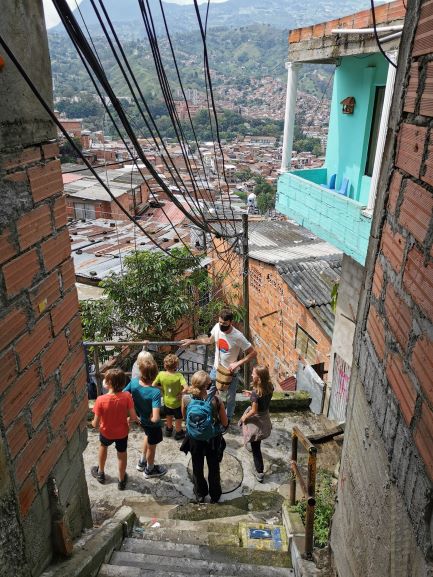 Le lendemain matin, nous retrouvons nos amis Les 8 Pieds sur terre, rencontrés à Bogota, Véronique, Arnaud et leurs deux enfants Thomas et Sarah. Nous avons rendez-vous tous ensemble avec un guide français, Ludovic, pour découvrir le quartier de la Comuna 13.