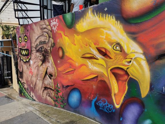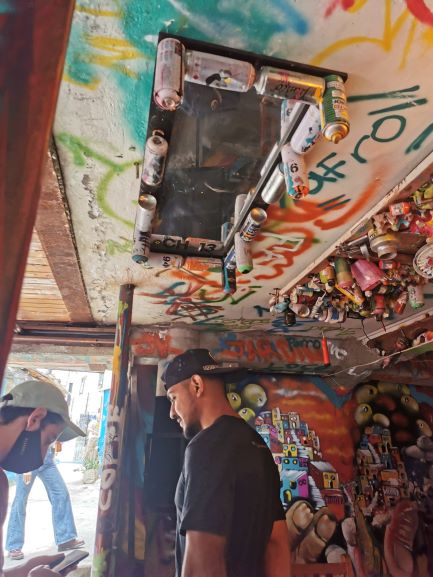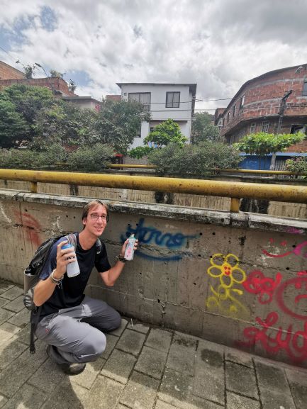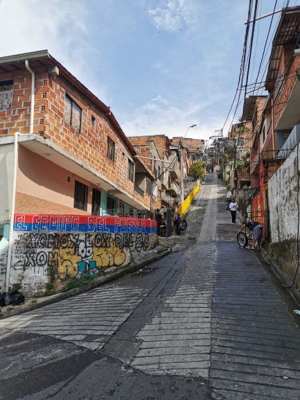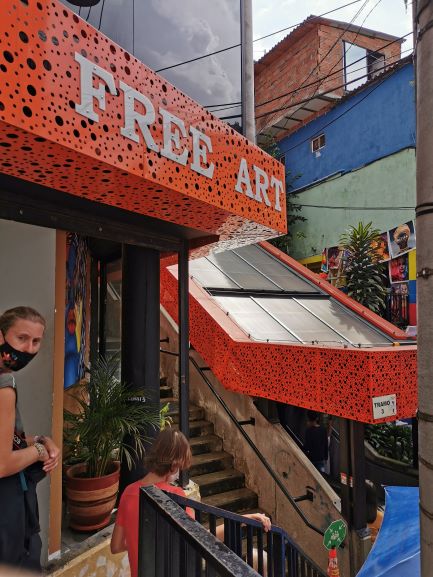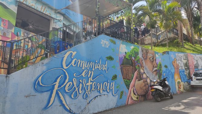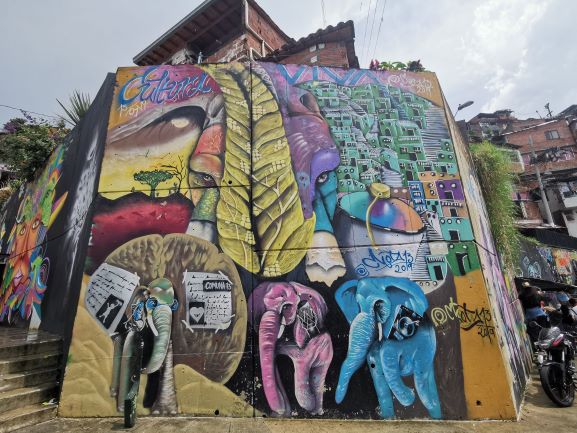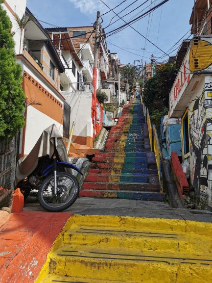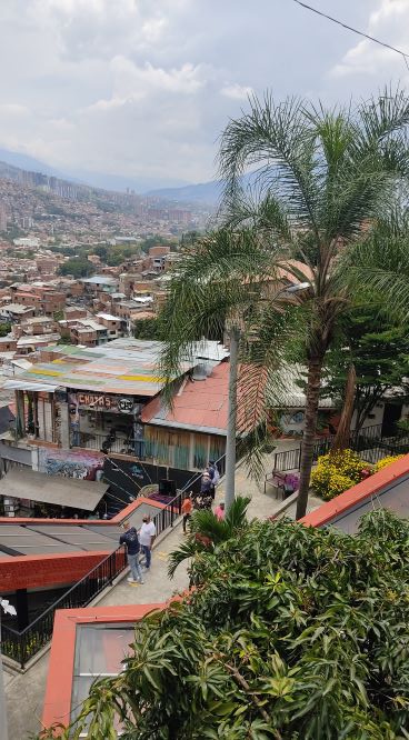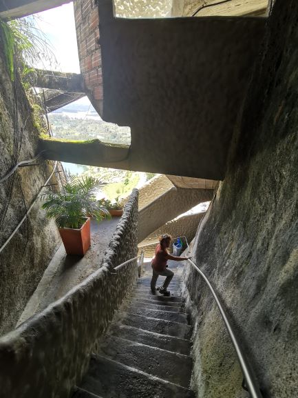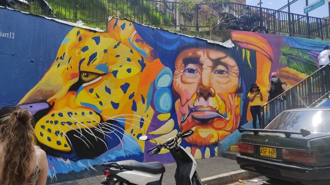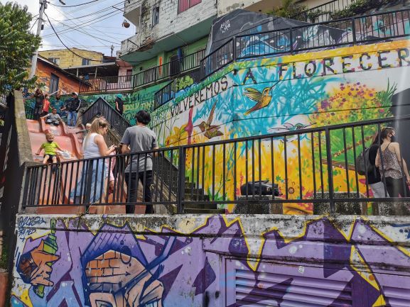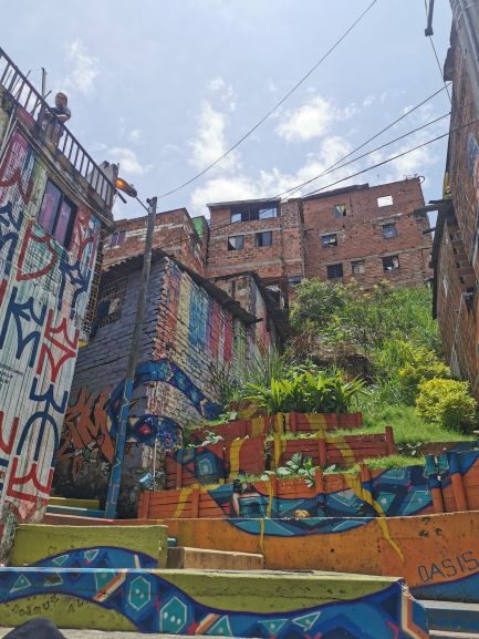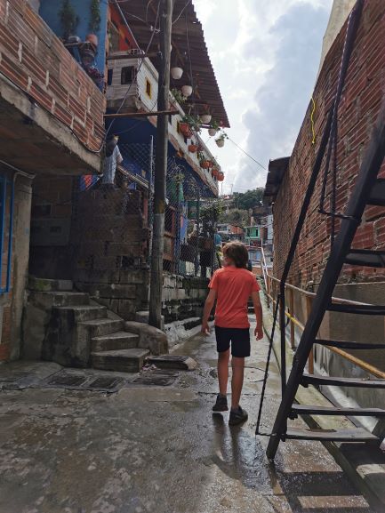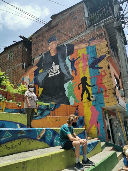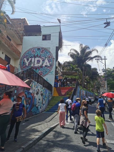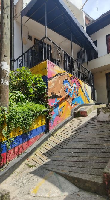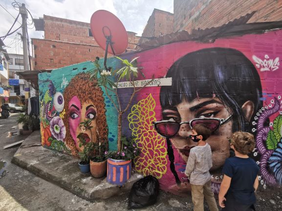 La Comuna 13 est construite sur le flan de la montagne comme la plupart des quartiers défavorisés de Medellin. Il faut donc grimper pour le découvrir. Au cours de la visite, Ludovic nous explique le sens derrière chaque street art, qui exprime très souvent un pan de l’histoire du quartier, un véritable travail de mémoire. Certains des artistes qui ont réalisé ces oeuvres sont des modèles pour la jeunesse du quartier et des leaders communautaires. Nous visitons notamment la galerie d’un de ces artistes