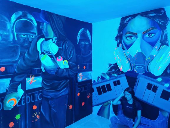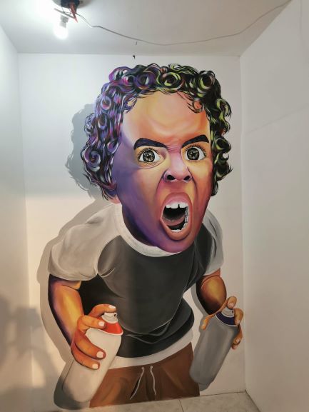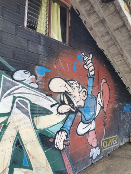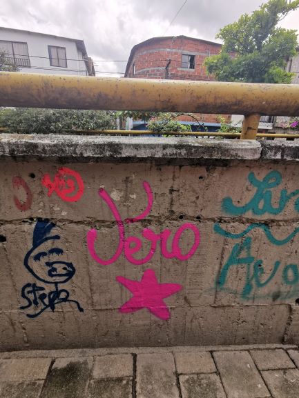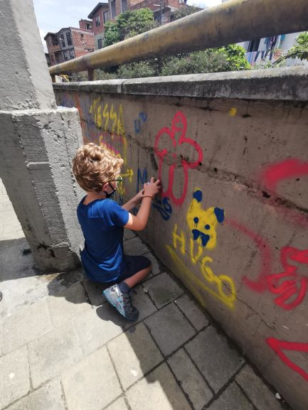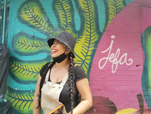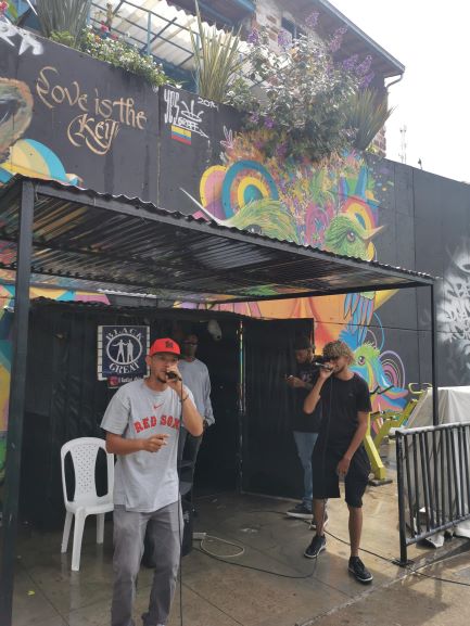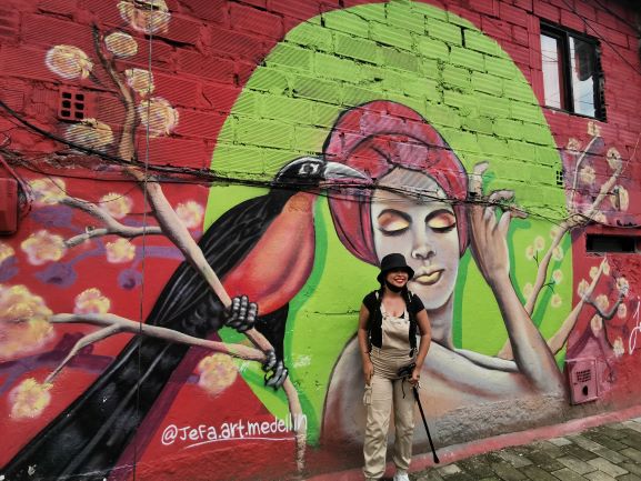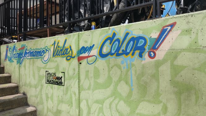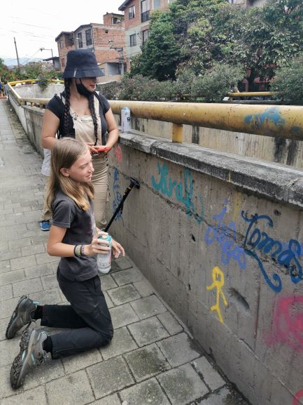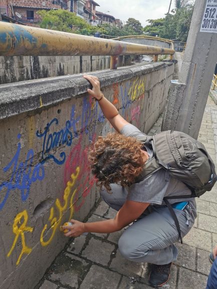 Jefa nous parle de son parcours et notamment son handicap dont elle a fait une force. Aujourd’hui elle réalise du street art dans le quartier avec l’aide de Gloria pour trouver les financements. Pour donner un ordre d’idée, il faut s’imaginer que la réalisation d’un mur peint en termes de coût correspond à un mois de salaire en Colombie.