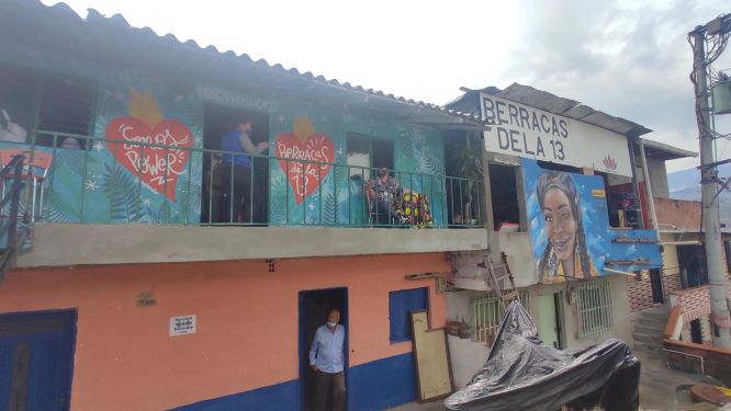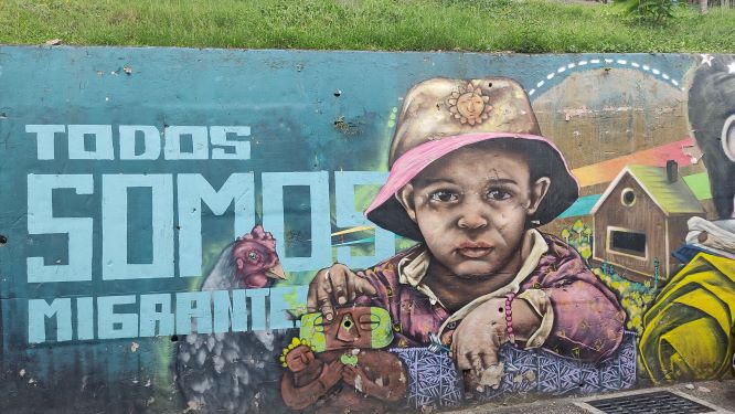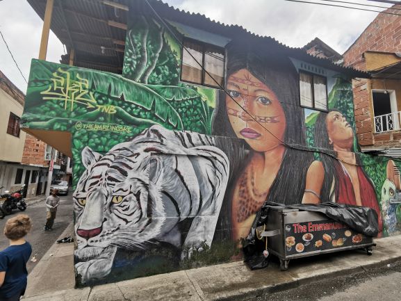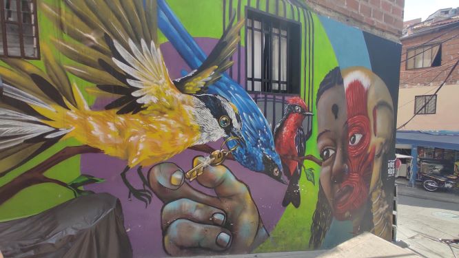 Cette oeuvre rappelle qu’initialement ceux qui sont venus habiter la Comuna 13 sont tous des migrants. Il représente également la culture indigène, qui représente les premiers peuples de Colombie. Enfin l’image de l’enfant avec la poule : en Amérique du Sud, ils ont l’image qu’un enfant qui n’a pas une poule n’a pas eu d’enfance.
