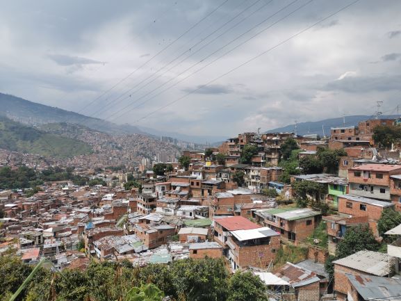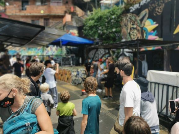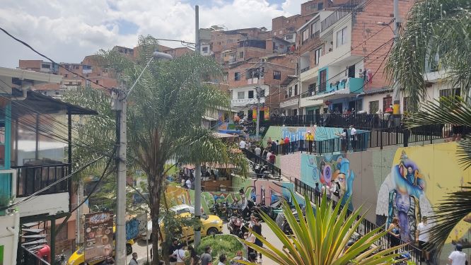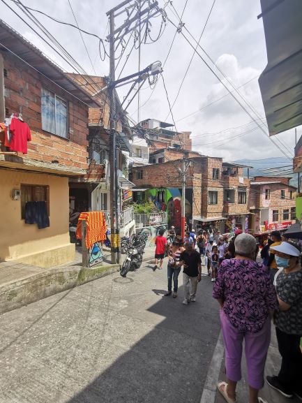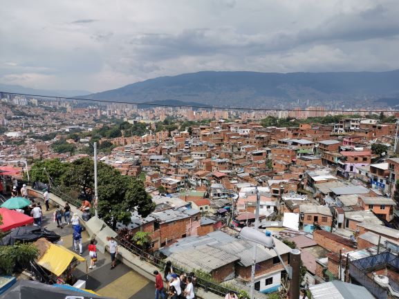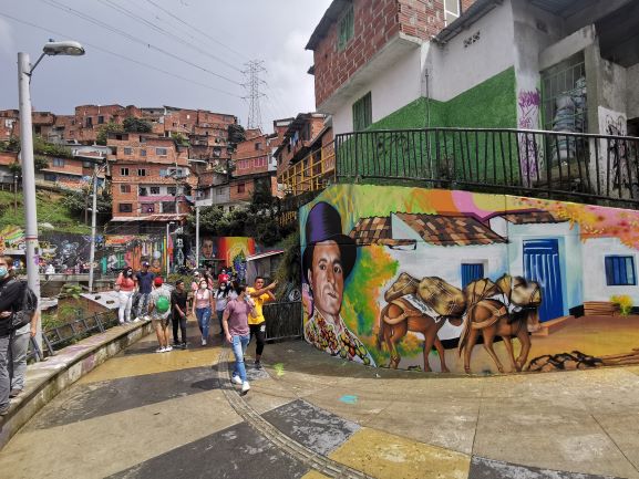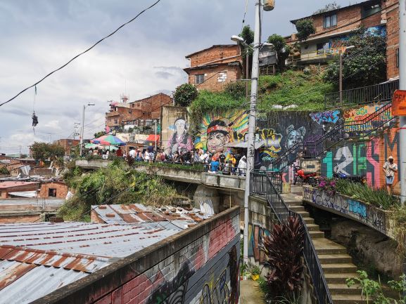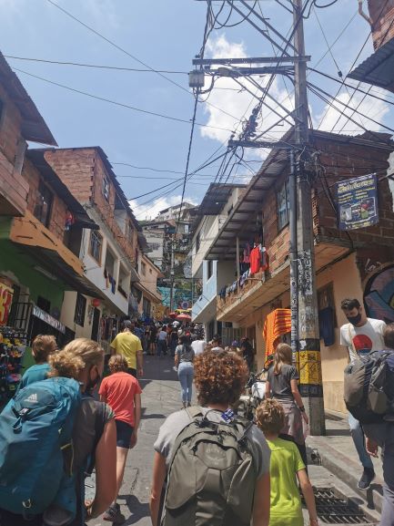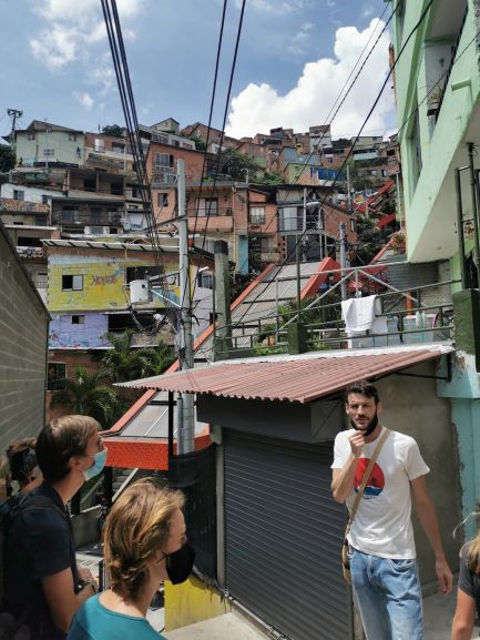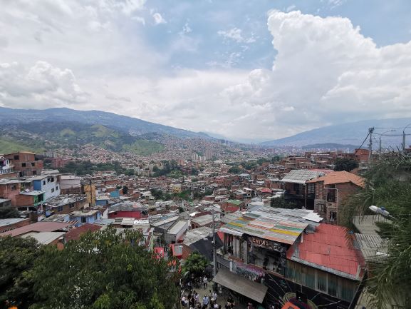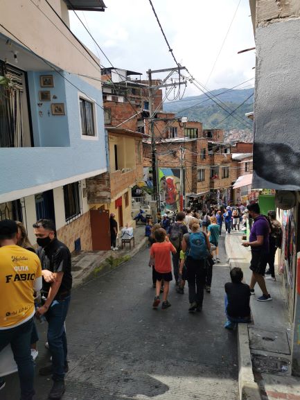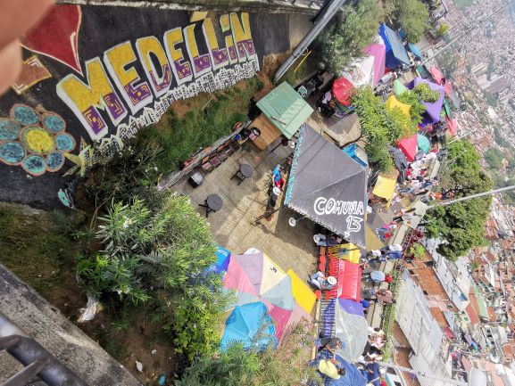 Nous débutons notre visite par un peu d’histoire. Medellin était il n’y a pas si longtemps une des trois villes les plus dangereuses du monde. Cela s’explique par une croissance extrêmement rapide de la ville en seulement quelques dizaines d’années sans aucun encadrement ramenant son lot de violence : les paysans y venaient s’y installer en masse espérant une vie meilleure dans la ville. En l’absence de l’état, les groupes guérilleros tels que les FARC et ELN ont vu l’opportunité de faire fructifier leur business et recruter de nouveaux guérilléros. Ils promettaient à ces migrants la protection et la sécurité dans le quartier de la Comuna 13, en contrepartie ils devaient laisser faire leur trafic (drogues, armes, personnes…). A cela se sont ajoutés les narco-traficants puis les groupes paramilitaires formés initialement par le gouvernement mais reconnus indépendants. A la période la plus noire de Medellin, on comptait plus de 7500 règlements de comptes par an, imaginez une moyenne de 20 meurtres par jour ! C’est le président Uribé qui a pris les choses en main pour stopper cette violence et en particulier dans le quartier de la Comuna 13, avec l’opération Orion qui marqua les esprits de cette communauté. Ce fut 3 jours de guerre civile qui ont fini par aboutir à un « traité de paix » entre les différents groupes. Puis des figures importantes de ce quartier ont souhaité sortir de cette image de violence et montrer qu’il y avait du bon à la Comuna 13. Et c’est ainsi qu’un mouvement de la culture Hip Hop s’est petit à petit imposé et a fait renaitre ce quartier : il fallait montrer au monde que la Comuna 13 n’est pas ce que l’on croit mais pleine de gens avec du talent comme dans le rap, le street art ou le hip hop.