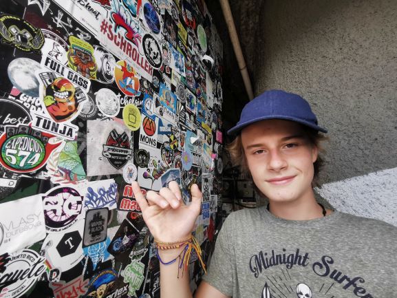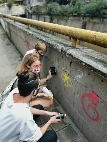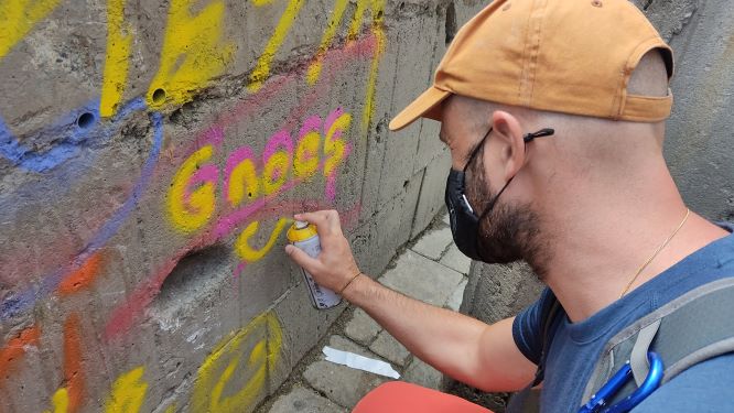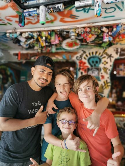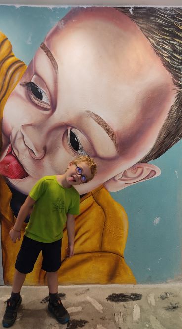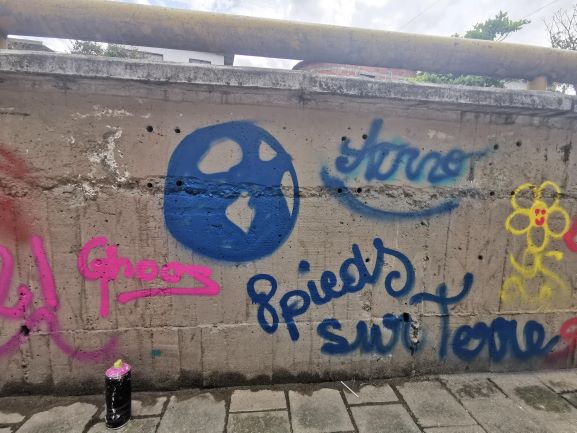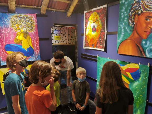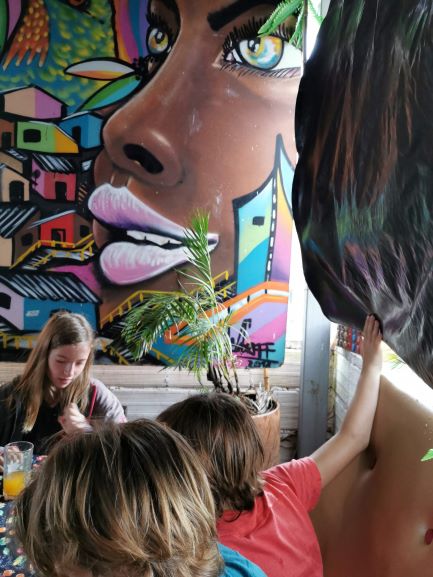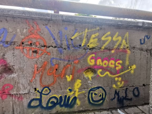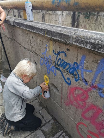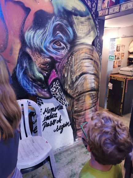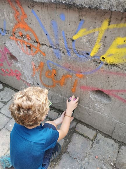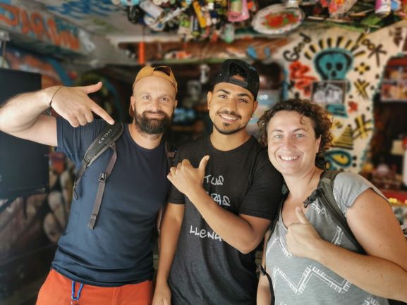 Au cours de la visite, Jefa nous propose de nous initier au street art, ou plutôt au tag pour commencer. En effet, pour s’imposer dans le street art, il faut d’abord avoir sa signature. Les enfants comme les adultes s’en donnent à cœur joie avec nos prénoms et nos surnoms de voyageurs…