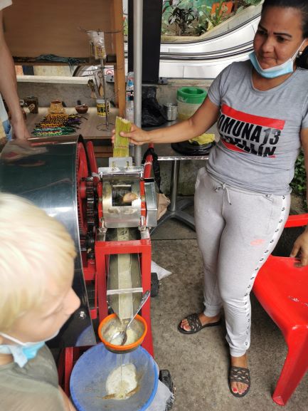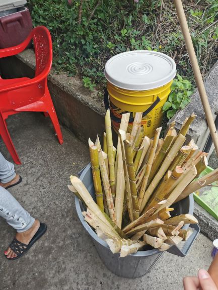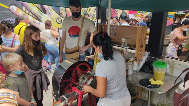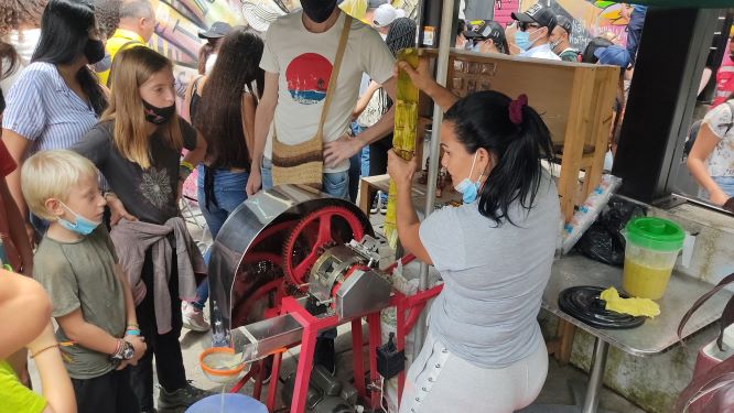 Nous continuons notre promenade avec un stop dans un petit stand qui prépare le Guarapo, une boisson rafraichissante à base de jus de canne à sucre et citron, un régal ! Ludo repart même avec un morceau de canne à sucre à sucer 🙂 Nous atteignons les hauteurs de la Comuna 13 avec des vues imprenables sur ce quartier et sur Medellin plus largement.