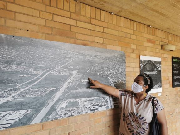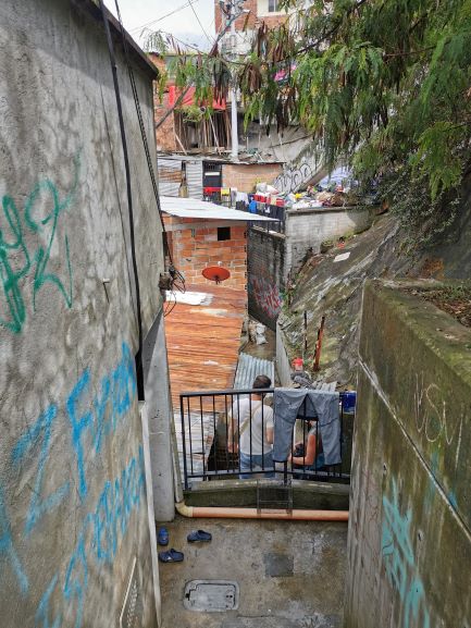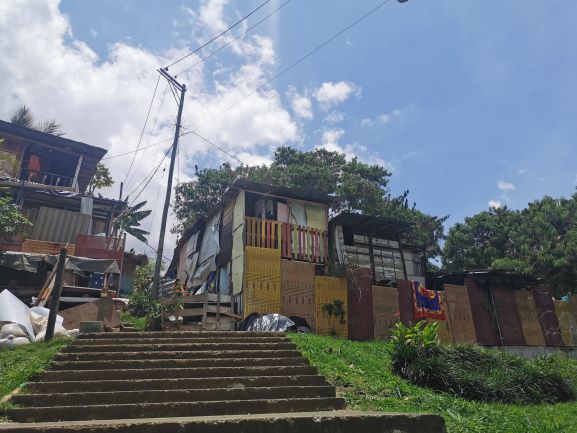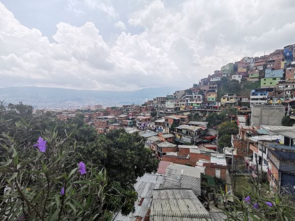 Après le centre culturel, Gloria nous raconte l’histoire de la Moravia au travers des rues, des fresques réalisées par les habitants et même d’une autre oeuvre street art de Jefa qui représente la mère de Gloria qui est à l’origine de la création d’une maison de la petite enfance. Le quartier s’est donc construit au départ sur une déchetterie. Les maisons étaient faites de matériel de récupération : tôles, cartons, plastique… Lorsque la transformation du quartier a été décidée, la montagne de déchets de 35m de haut a été recouverte de terre et la communauté a planté divers végétaux. Aujourd’hui c’est un véritable jardin, sans mauvaises odeurs mais la paix est fragile. Une minorité se rebelle et ne veut pas quitter la colline, il reste donc encore quelques maisons faites de bric et de broc. Nous n’avons d’ailleurs pu rentrer complètement dans le jardin au vue des tensions.