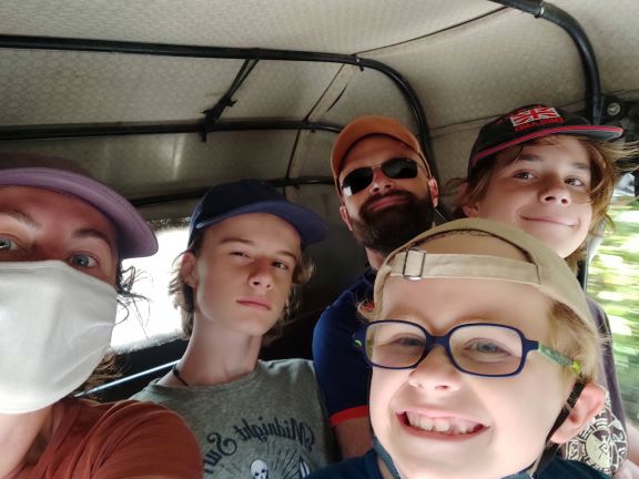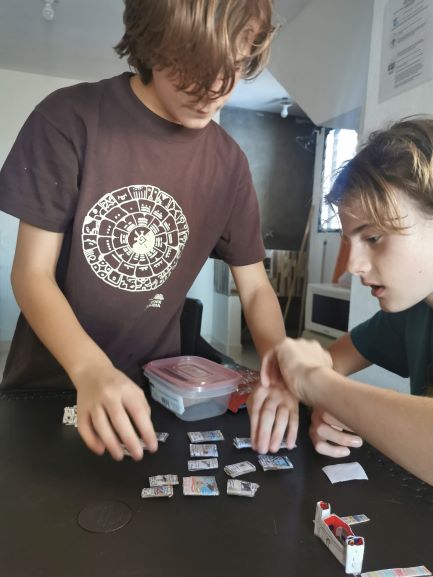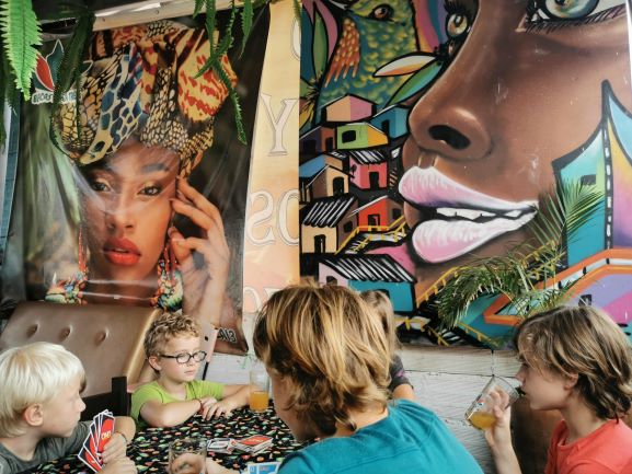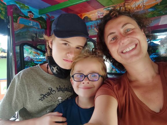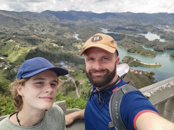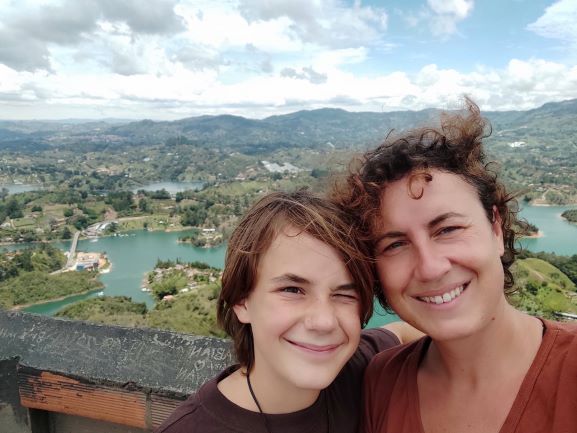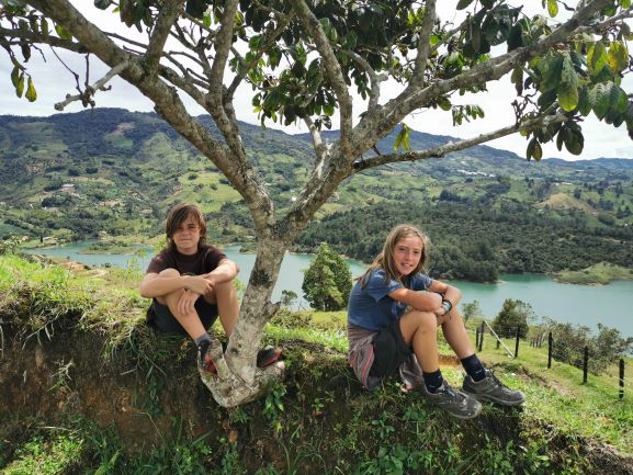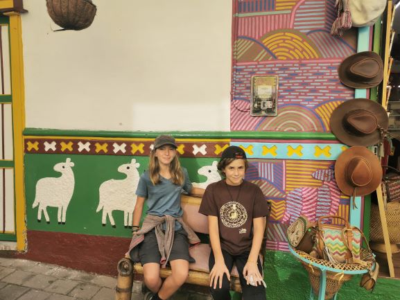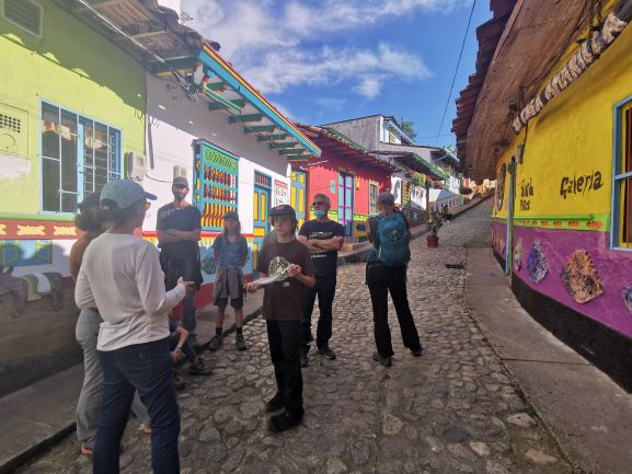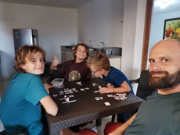 Nous repassons à notre auberge et après un encas rapide nous partons au terminal de bus pour nous rendre dans un joli village des alentours Guatape. Les citadins s’y pressent le week-end pour recharger les batteries. Finalement nous nous rendrons en taxi pour le même prix. Il nous faut 2 heures pour rejoindre Guatape avec notre conducteur Fanjo… Nous avons juste le temps de faire nos courses avant de nous installer dans notre appartement pour le couvre-feu. Nous avons du temps devant nous et Ludo en profite pour jouer pour la 1ère fois au jeu créé par les garçons (inspiré de Hero Realm).