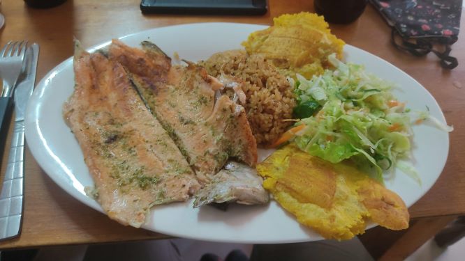 Après ces belles découvertes, nous allons déjeuner dans un restaurant local qui sert des truites à la plancha, enfin un plat non frit !!! Nous finissons tardivement car le service est plutôt lent…