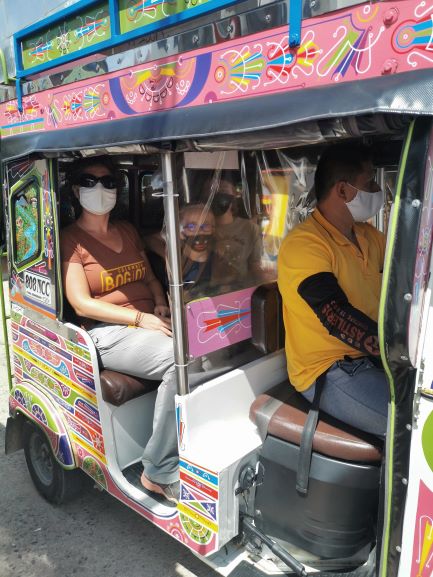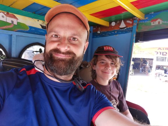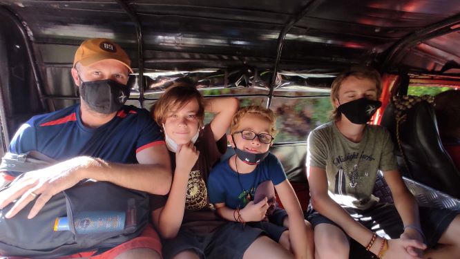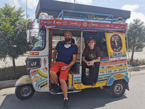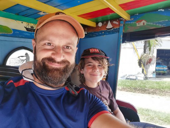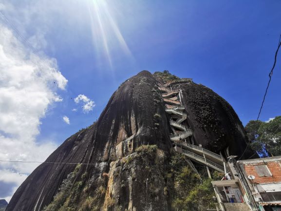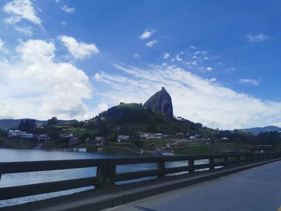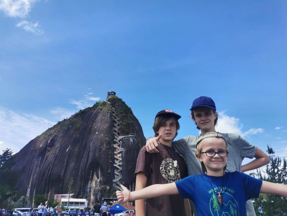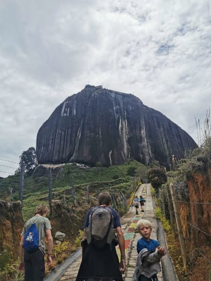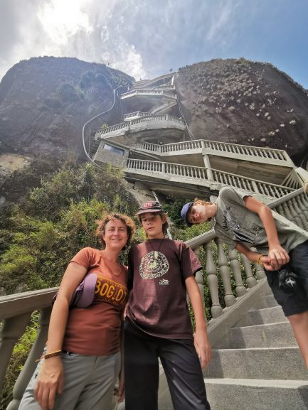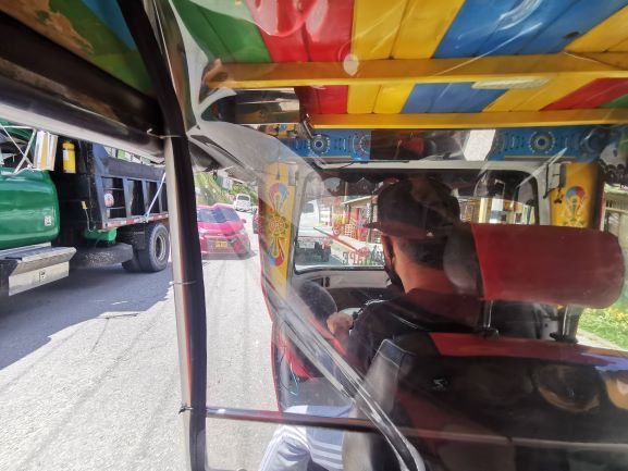 Le lendemain, nous avons rendez-vous avec nos amis Les 8 pieds sur terre pour grimper en haut de la fameuse Piedra del Penol, une montagne à la forme rappelant certains paysages de Thaïlande, sauf qu’ici il y en qu’une seule entourée d’un lac. Nous nous y rendons avec 2 tuk tuk, très colorés et avec la musique d’ambiance comme toujours.