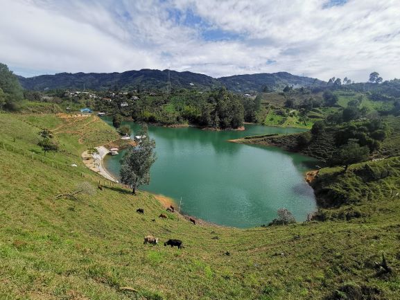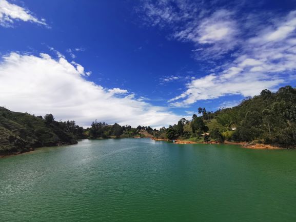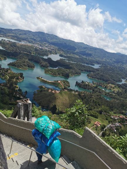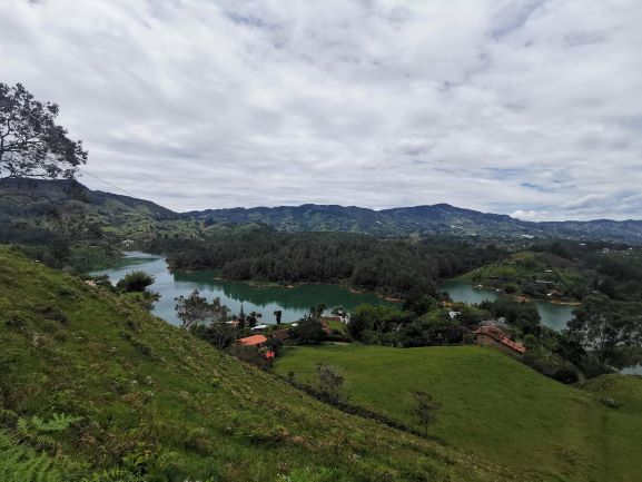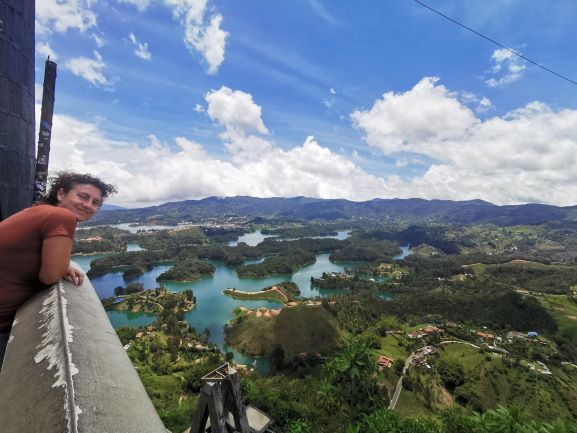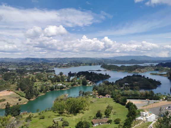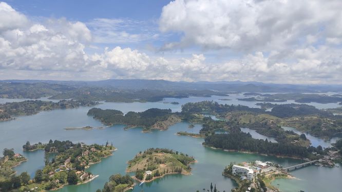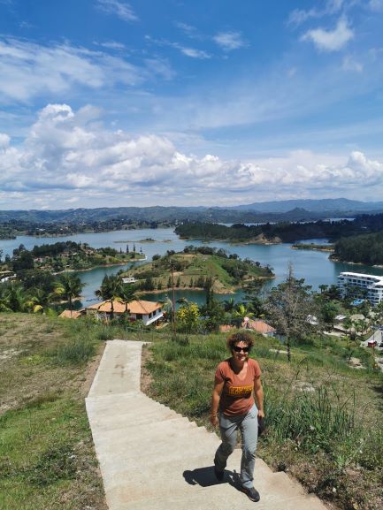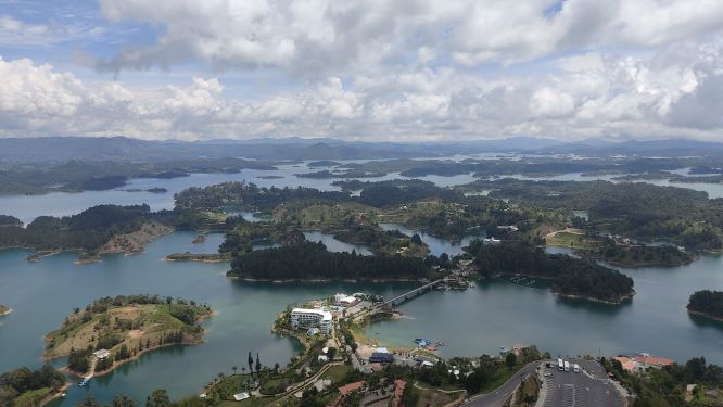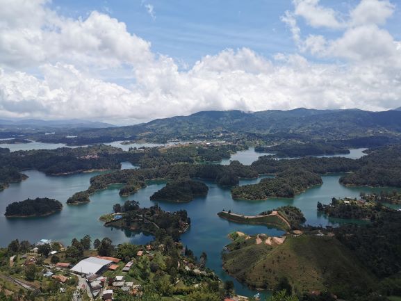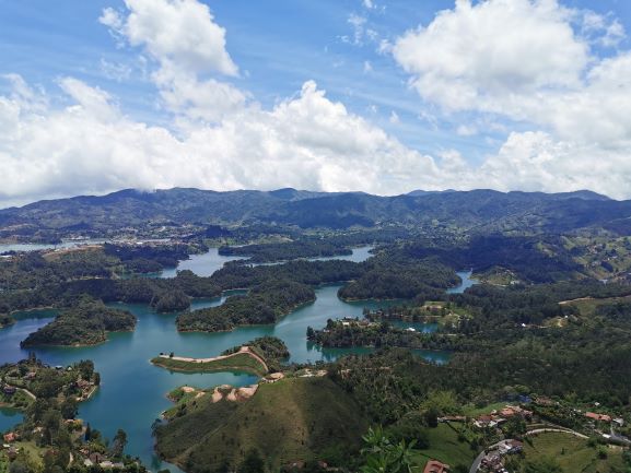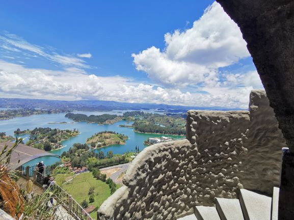 Après avoir gravi les 750 marches, nous bénéficions d’une vue à 360° sur la région de Guatape et son lac artificiel (une retenue d’eau immense créé pour les besoins en énergie de Medellin et sa région, la Colombie utilise surtout l’énergie hydroélectrique). Le temps est ensoleillé, c’est vraiment magnifique.