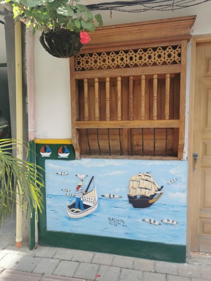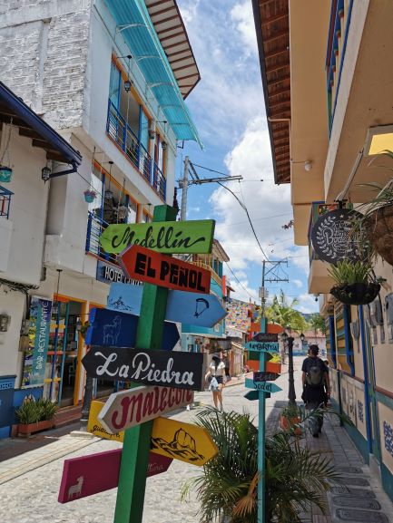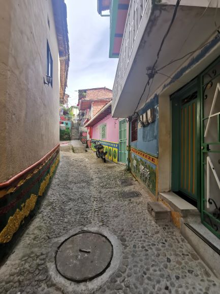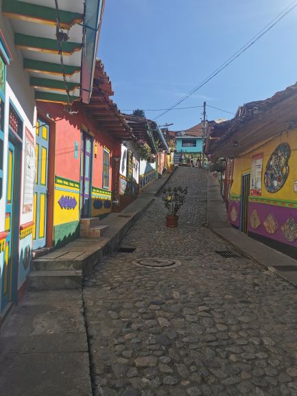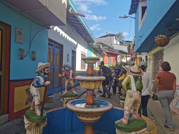 Nous visitons ensuite le village avec Valérie et Jérôme qui se sont installés il y a 4 ans à Guatape. Ils nous expliquent l’histoire des zocalos : ce sont des décorations que l’on trouve en bas du mur de chacune des maisons du village. Initialement, un homme avait peint des moutons dans sa maison et ses voisins lui avaient demandé de reproduire ce dessin sur leurs murs. Puis avec le temps, de plus en plus de maisons présentaient des plinthes principalement de formes géométriques. Jusqu’au jour où en 2008, le maire de Guatape déclara obligatoire que chaque maison ait des zocalos, sur le thème de leur choix. Ce village a donc désormais une véritable signature.