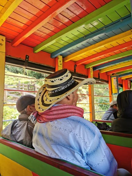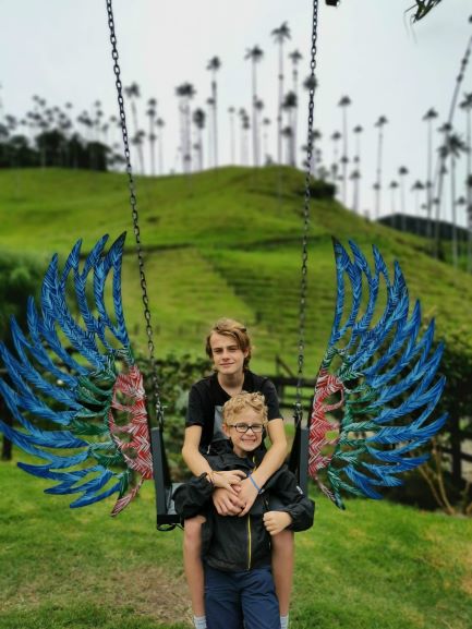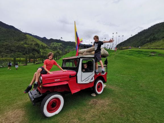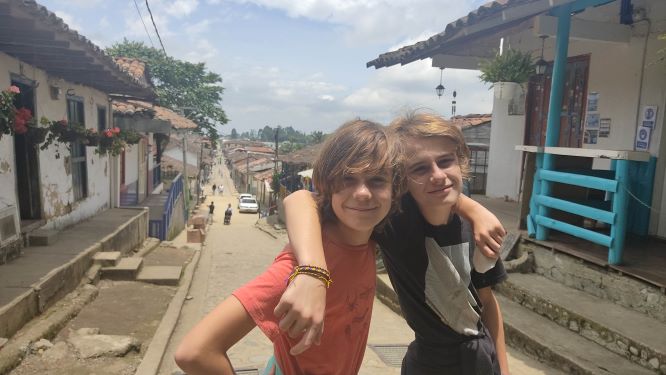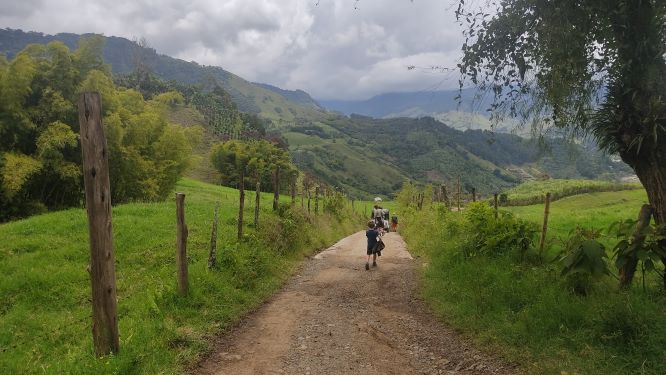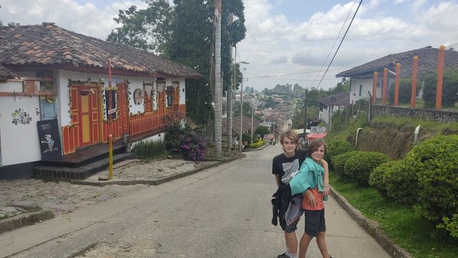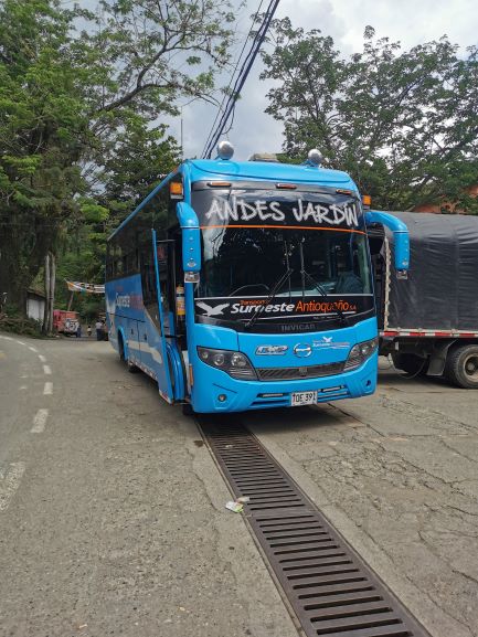 C’est une journée de transition comme nous en vivons beaucoup depuis le début de notre voyage en sacs à dos. Nous devons rejoindre le village de Jardin. Tout commence le matin à 9h après que Ludo soit passé chez le barbier. Nous avons rendez-vous avec un chauffeur de taxi repéré la veille qui conduit prudemment, denrée rare en Colombie !! En plus, Ludo a négocié qu’il nous pose au terminal de bus du sud de Medellin au lieu du nord afin de gagner un temps de trajet non négligeable. Nous arrivons vers 11h30 au terminal. Là nous prenons un bus direct pour Jardin. En théorie il faut compter 3 heures, et comme toute heure colombienne, le temps s’allonge un peu. Il nous faudra 4h30 pour rejoindre ce charmant village andin avec de magnifiques paysages de montagnes verdoyantes. La route est belle, mais le bus est vraiment « tape-cul » (pardonnez l’expression), mes lombaires me remercient une fois que nous sommes enfin arrivés ! En route, je me fais contrôler sous le regard amusé de Ludo, le policier se demandant si c’était vraiment mes enfants à côté de moi :). Nous trouvons pour finir un taxi pour nous emmener à notre lodge.