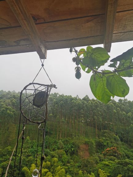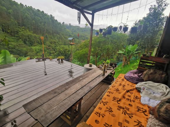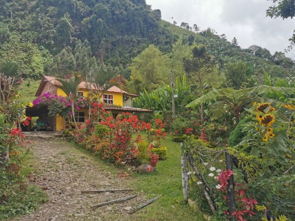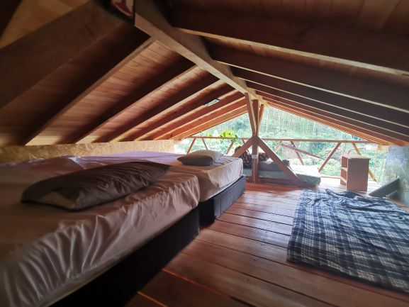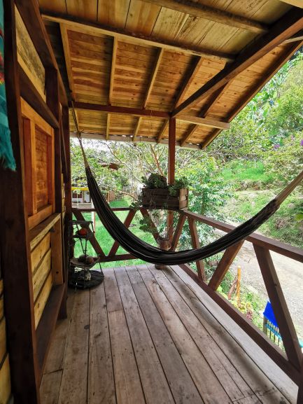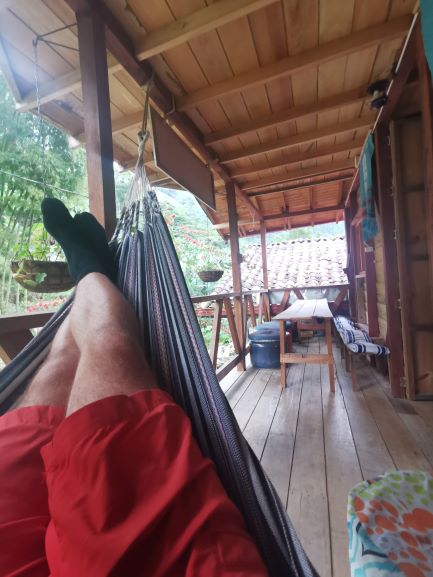 Nous avons choisi un éco-lodge, excentré par rapport au village, en pleine nature. Nous sommes servis. Le cadre se prête à l’apaisement, à la méditation, au repos très loin du tumulte des derniers jours passés à Medellin et Guatapé. Le concept est aussi vegan, donc pas le droit de stocker et cuisiner des protéines hormis les œufs :p Un petit régime qui nous fera le plus grand bien !
