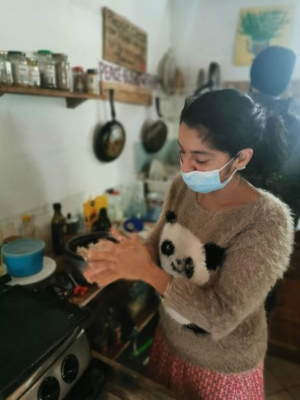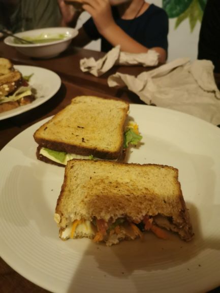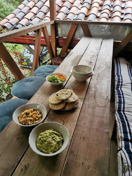 Comme nous arrivons après le couvre-feu, nous choisissons de prendre le repas préparé par leurs soins : un velouté d’épinards (un délice !), des sandwichs toastés vegan et en dessert des petites cracottes à tremper dans de la compote de goyave maison. Cela nous fait le plus grand bien de manger frais et léger depuis que nous sommes arrivés en Colombie !