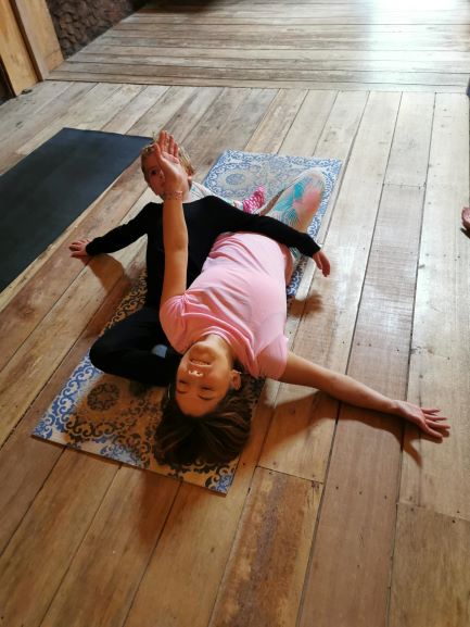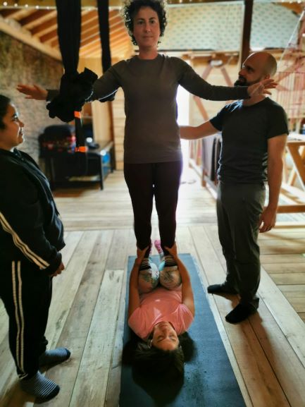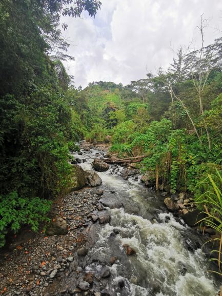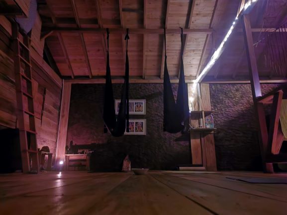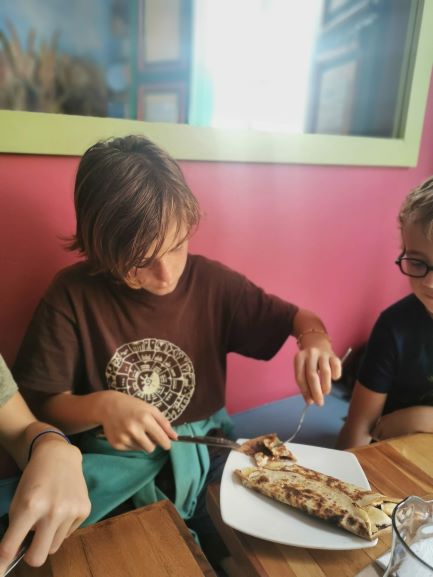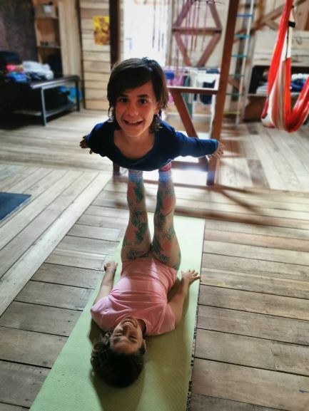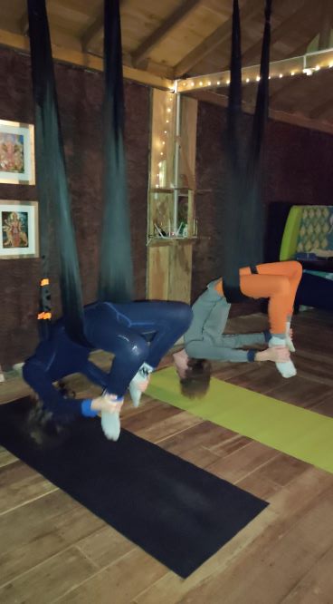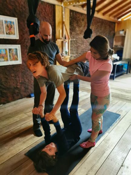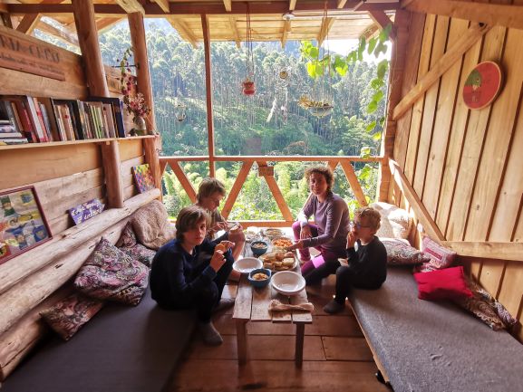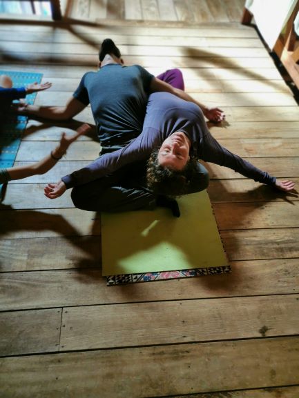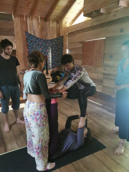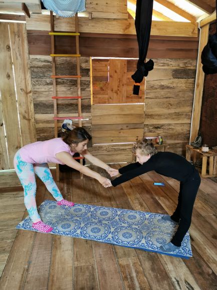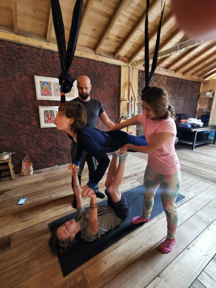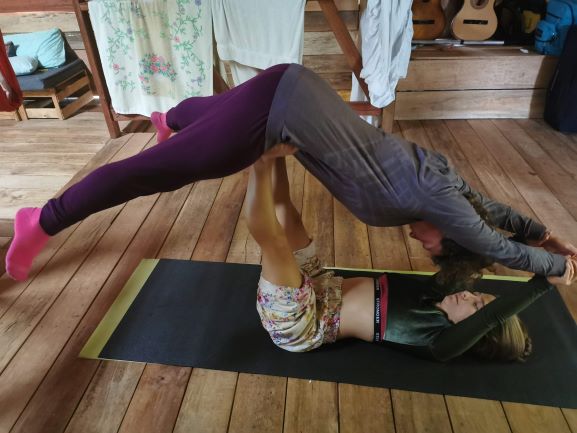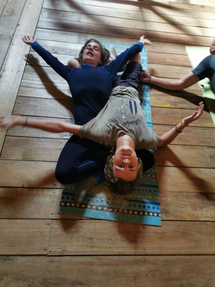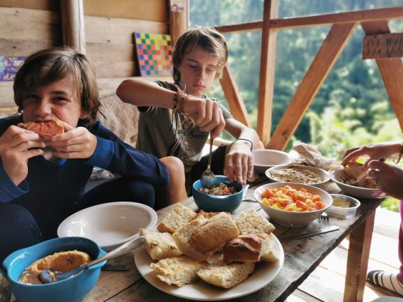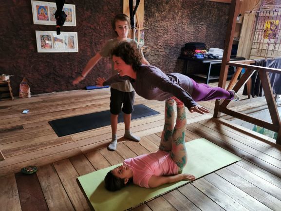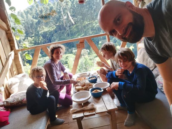 Après une nuit rythmée par les bruits de la nature et du torrent dans la vallée, nous nous levons au petit matin pour démarrer la journée par une séance d’accro-yoga en famille. Nous passons une heure à voler dans les airs avec des portées digne du cirque du soleil… ok avec un peu moins de grâce 🙂 Après le cours, ils nous servent un petit-déjeuner tout fait maison : baguette, compotes goyave et mangue verte / cannelle, houmous, riz au lait à la cannelle, céréales granola maison ; et tout cela servi dans un petit salon cosy avec vue sur la vallée. Juste wahou !