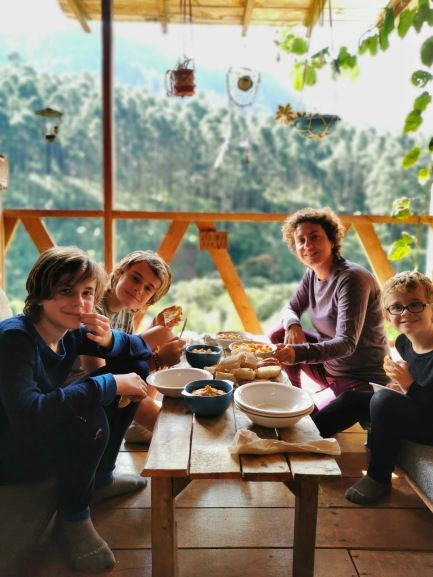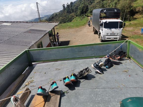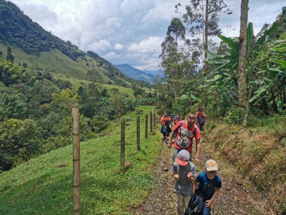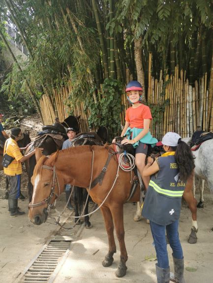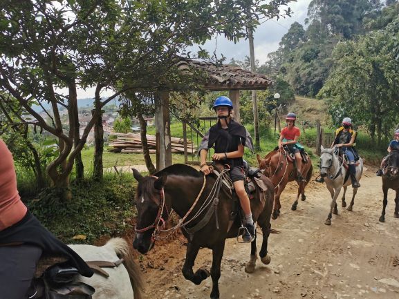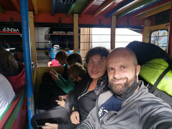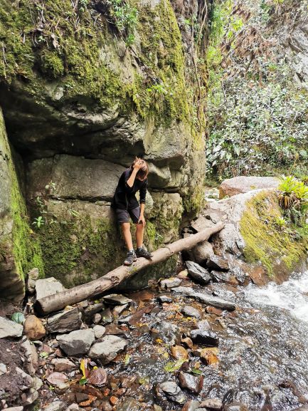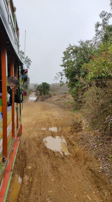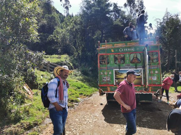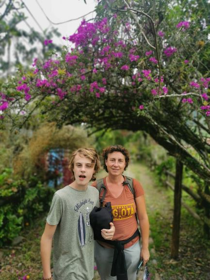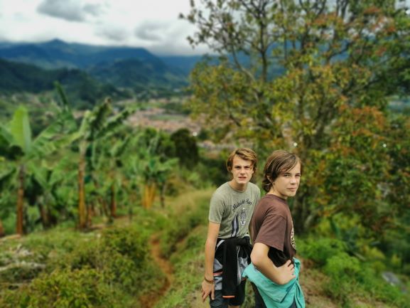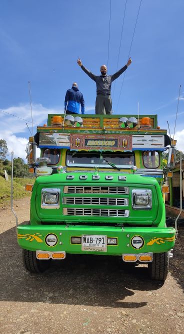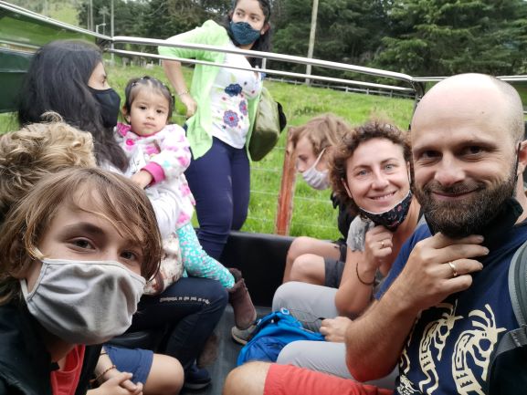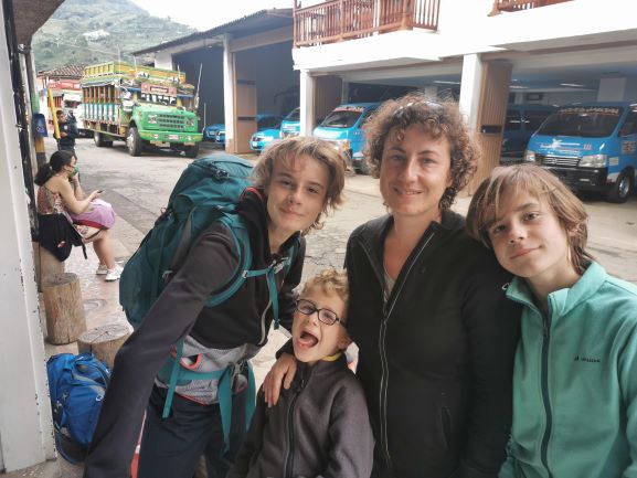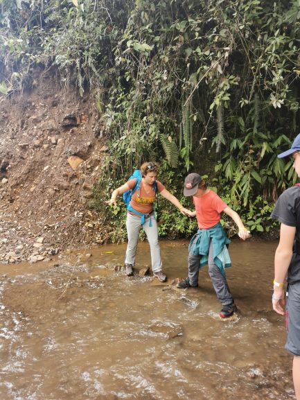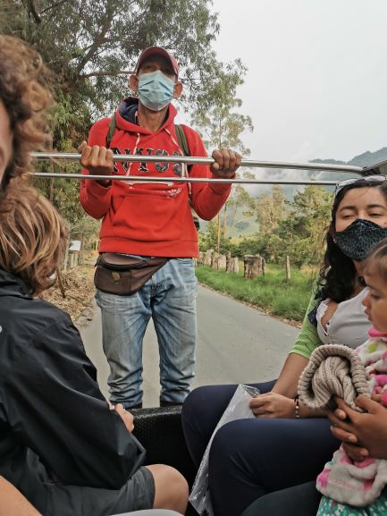 Nous prenons un premier bus, appelé Chiva Bus. Ce sont des bus hyper colorés, avec seulement des bancs, sans portes ni fenêtres, très folkloriques ! Et c’est parti pour 4 heures de route sinueuse dans la montagne, des fois à peine plus large que le bus, entrecoupées de quelques pauses au milieu de nulle part pour manger ou charger du bois. Il y a de l’ambiance dans le bus avec un mélange de musique locale et internationale et des led qui clignotent au rythme de la musique. On en profite même pour faire sécher nos chaussures sur le toit du bus. Puis à midi nous prenons un deuxième bus, plus classique, avec un fanjo du volant qui nous ballote dans chaque virage… estomac sensible s’abstenir ! Nous arrivons en fin de journée à notre auberge avec la famille Et pourquoi pas aller voir ailleurs ? et un couple de français Guillaume et Alicia. Nous préparons un dîner et un film aux enfants puis nous sortons entre adultes pour dîner dehors. Nous nous régalons d’une truite à l’ail ( et pas frite pour une fois !! car en Colombie tout est frit 😦 ) et en dessert un brownie :p