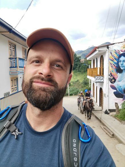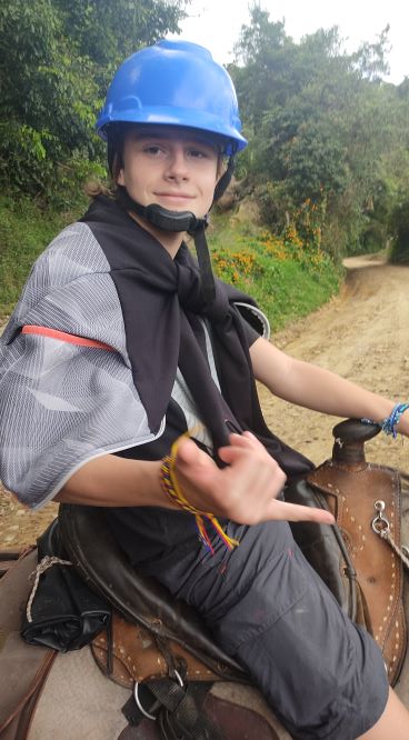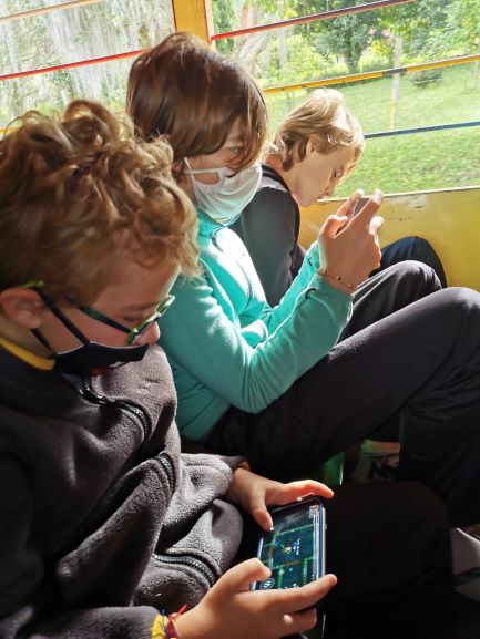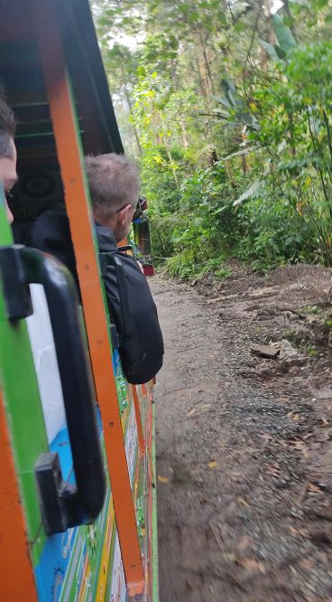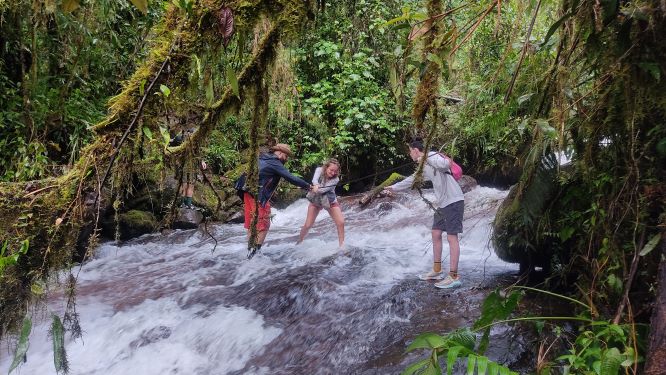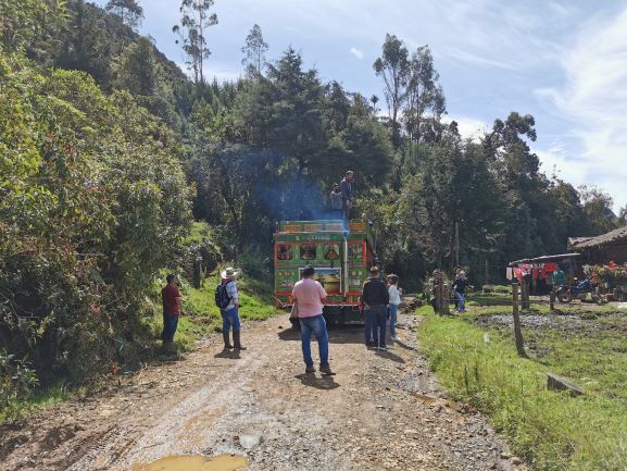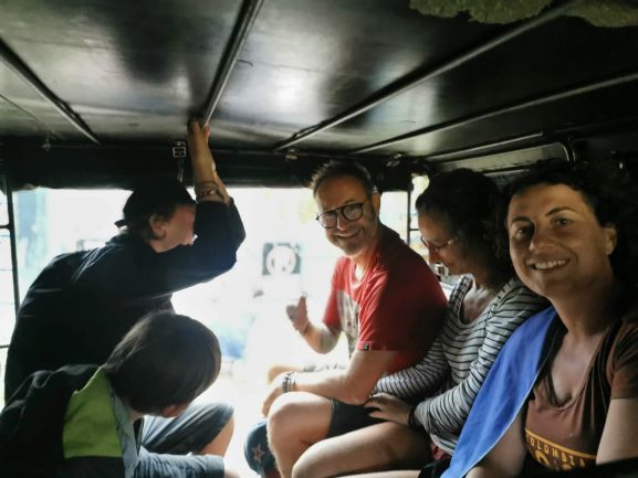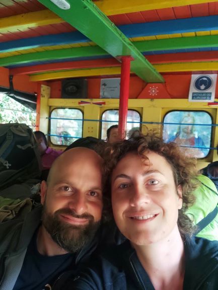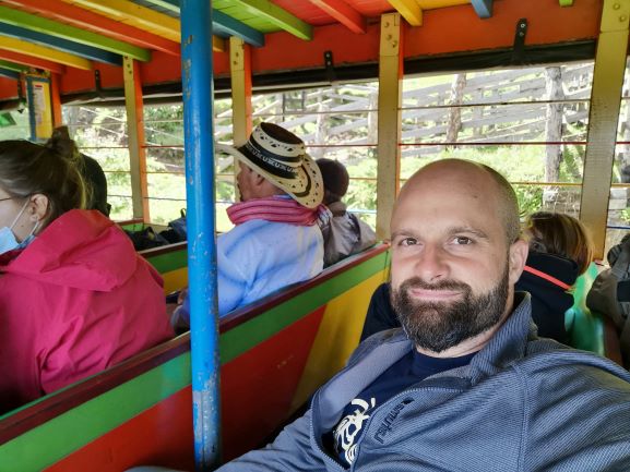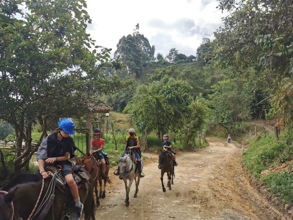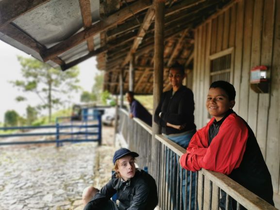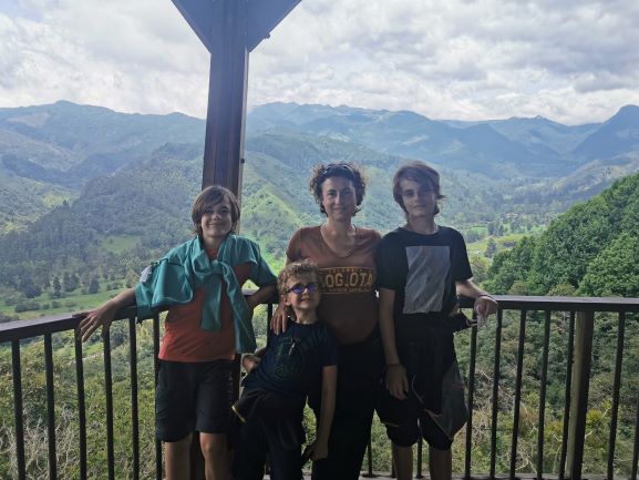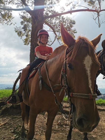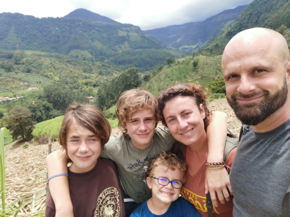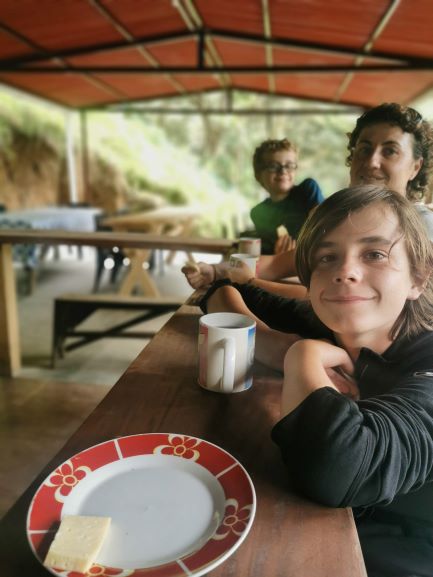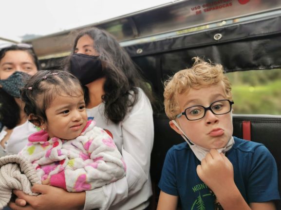 Nous prenons un premier bus, appelé Chiva Bus. Ce sont des bus hyper colorés, avec seulement des bancs, sans portes ni fenêtres, très folkloriques ! Et c’est parti pour 4 heures de route sinueuse dans la montagne, des fois à peine plus large que le bus, entrecoupées de quelques pauses au milieu de nulle part pour manger ou charger du bois. Il y a de l’ambiance dans le bus avec un mélange de musique locale et internationale et des led qui clignotent au rythme de la musique. On en profite même pour faire sécher nos chaussures sur le toit du bus. Puis à midi nous prenons un deuxième bus, plus classique, avec un fanjo du volant qui nous ballote dans chaque virage… estomac sensible s’abstenir ! Nous arrivons en fin de journée à notre auberge avec la famille Et pourquoi pas aller voir ailleurs ? et un couple de français Guillaume et Alicia. Nous préparons un dîner et un film aux enfants puis nous sortons entre adultes pour dîner dehors. Nous nous régalons d’une truite à l’ail ( et pas frite pour une fois !! car en Colombie tout est frit 😦 ) et en dessert un brownie :p