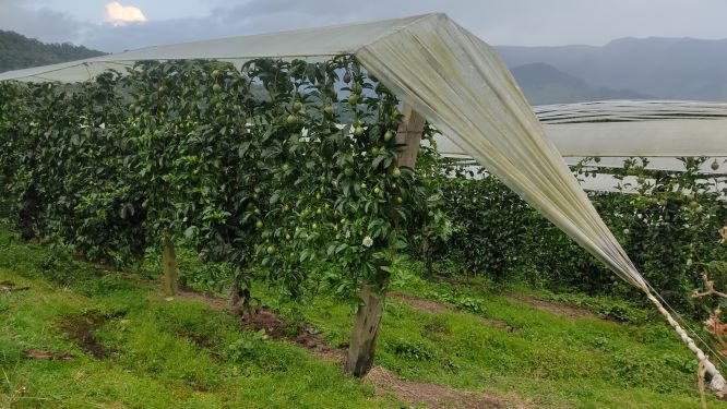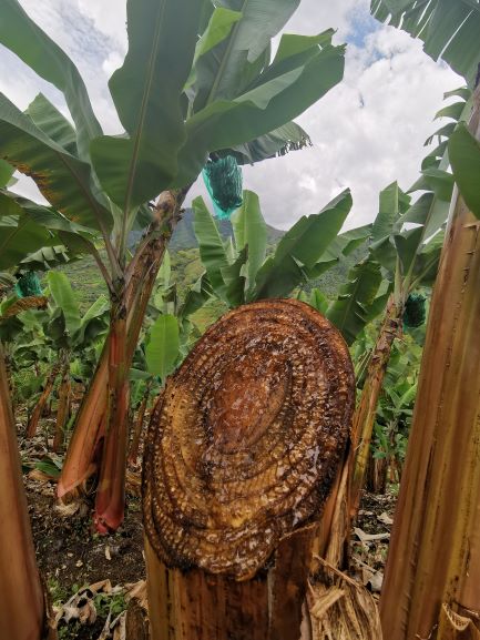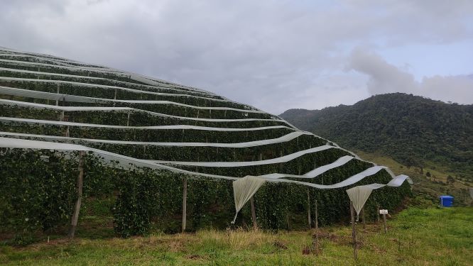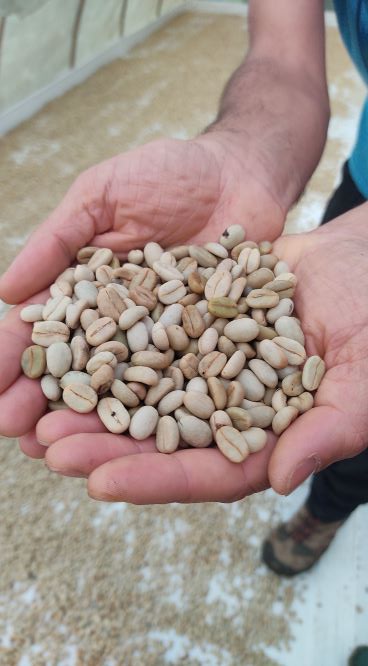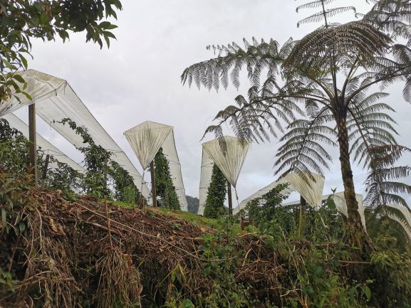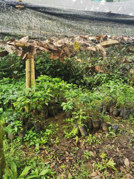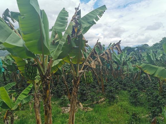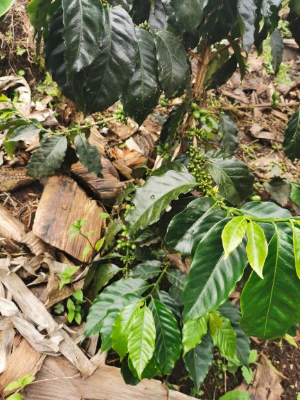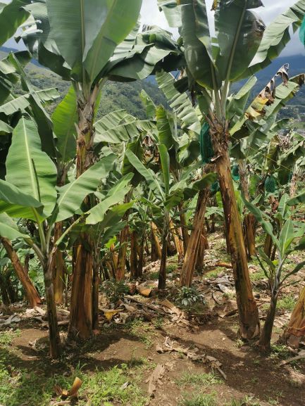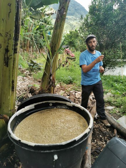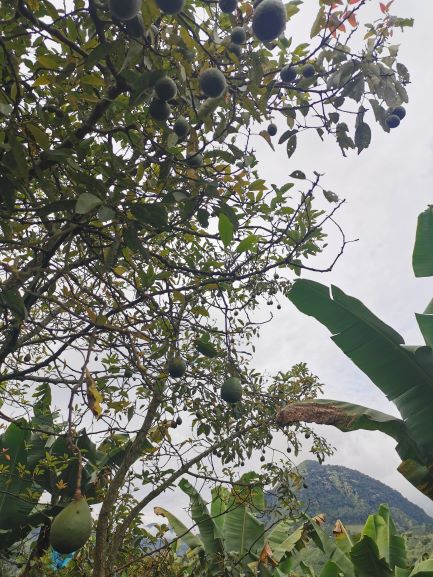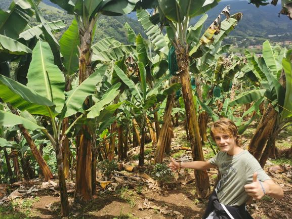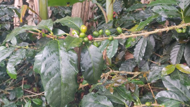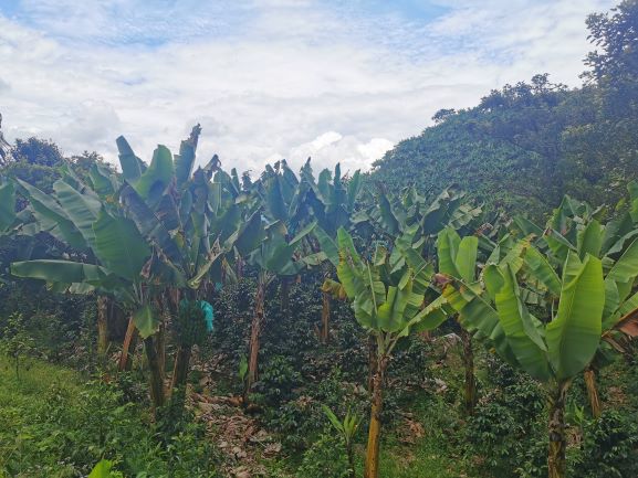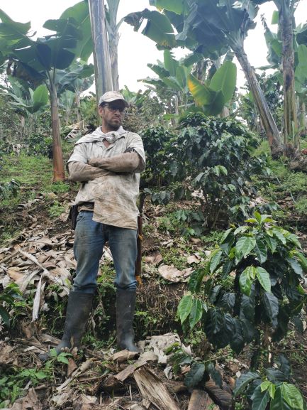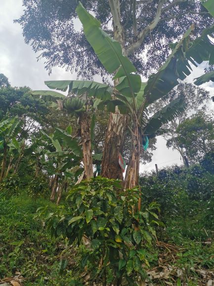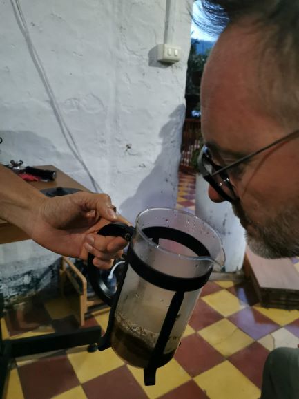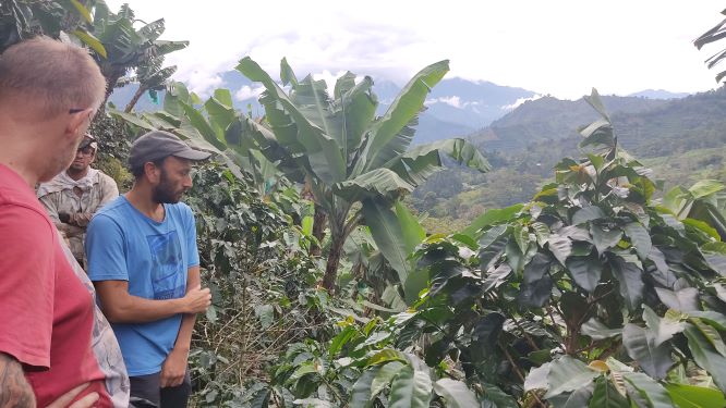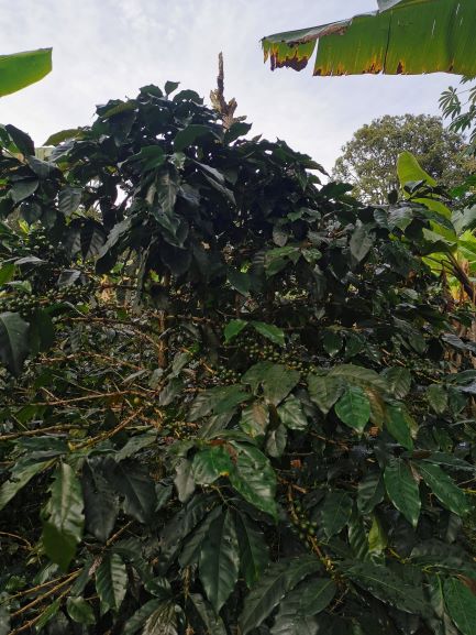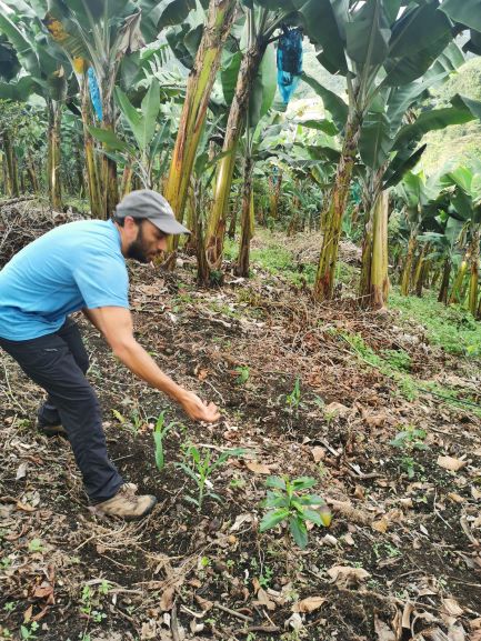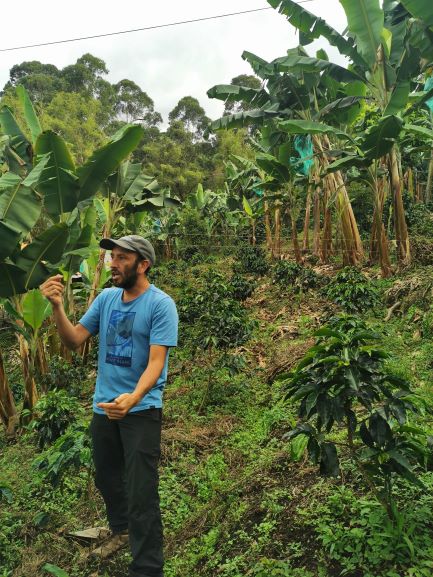 Nous sommes reçus par René, un des rares producteurs bio de café de la région. Il prend le temps de nous expliquer son parcours jusqu’à la reprise de la finca de ses parents. Initialement formé dans l’écologie, il a voulu mêler sa passion du café et ses compétences en matière d’environnement afin de produire du café de façon plus éco-responsable. Il nous fait visiter tout d’abord ses plantations afin de nous expliquer comment il cultive et quelles sont les différences avec ses voisins qui produisent du café en masse avec des produits Monsento. Il utilise les notions de permaculture notamment : au milieu des caféier, il plante d’autres arbres comme les bananiers, les avocatiers, les orangers… Ces arbres apportent l’ombre nécessaire au caféier de type Arabica et aussi apportent une saveur différente. Il utilise également la culture en terrasse afin que ne pas perdre les nutriments qui ruissellent avec les eaux de pluie.