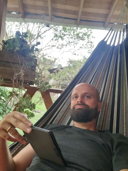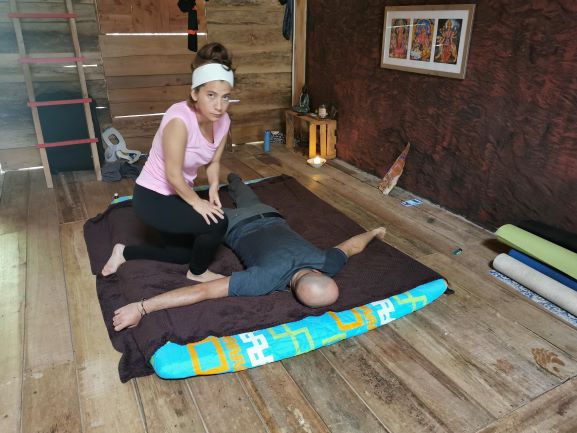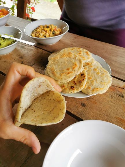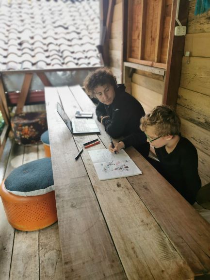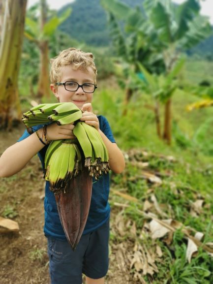 Le lendemain matin, je participe à une nouvelle séance d’accro-yoga avec des étirements en mode portée, je plane… Puis suit le merveilleux petit-déjeuner toujours tout fait maison : aujourd’hui arepas avec guacamole et petite salade de tomate pour mettre dedans. On se régale une fois de plus. A 9h du matin, le temps ne semble pas être de la partie… Il tombe des trombes d’eau, pas étonnant que les paysages soient bien verdoyants 🙂 On décide de reporter notre randonnée au lendemain. Du coup, on profite d’une matinée farniente : école, lecture, hamac et pour bien clôturer tout ça un massage thaïlandais doux sous les mains expertes de notre hôte Paula… Nous voilà bien zen et détendus !