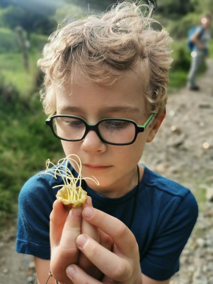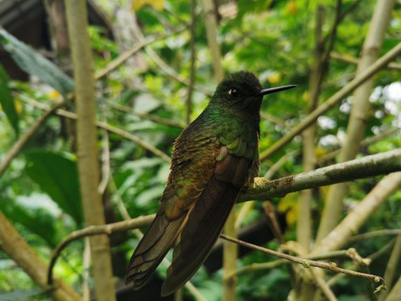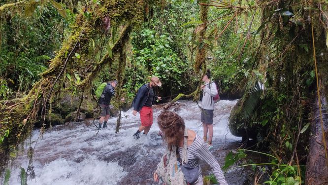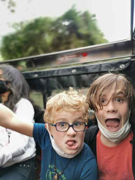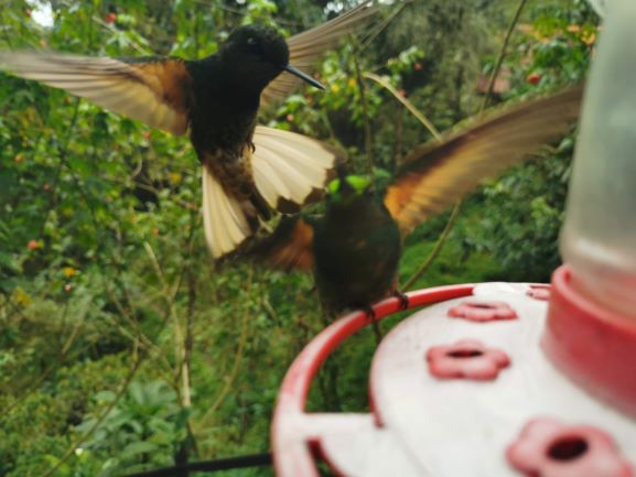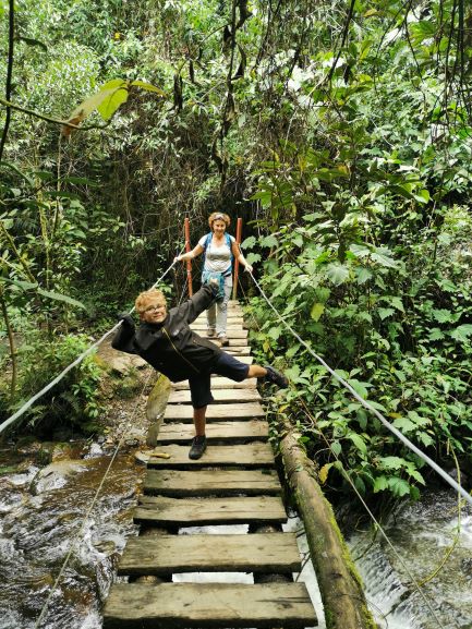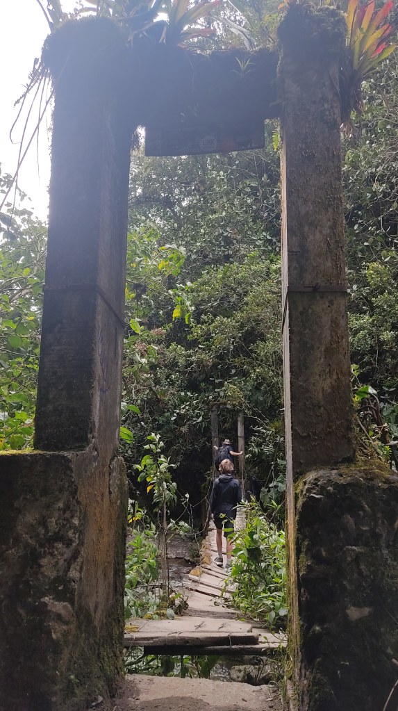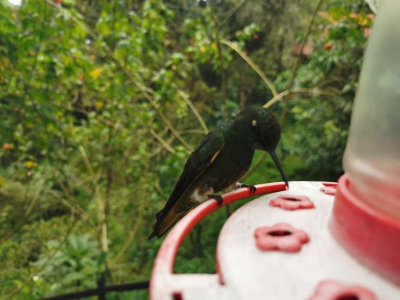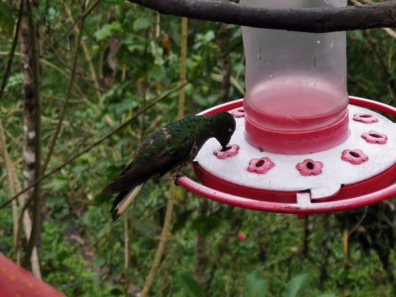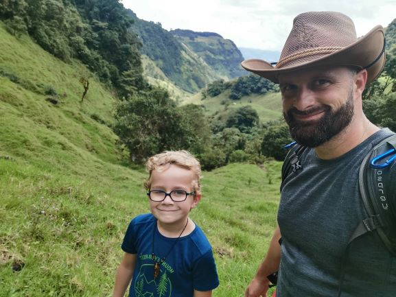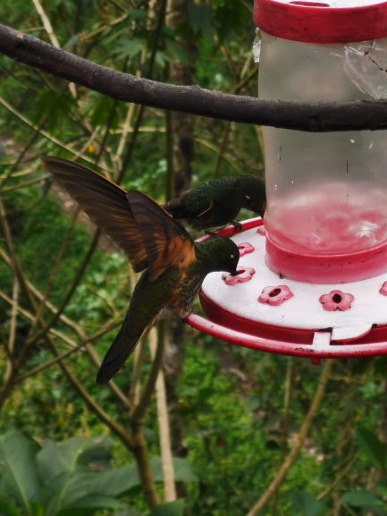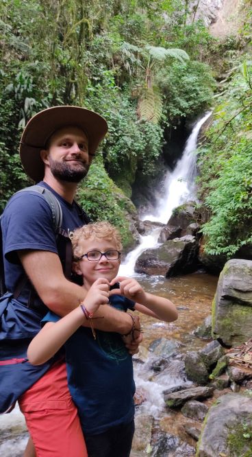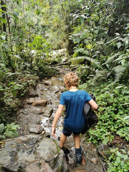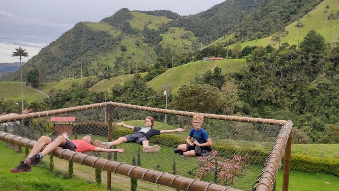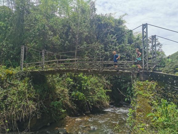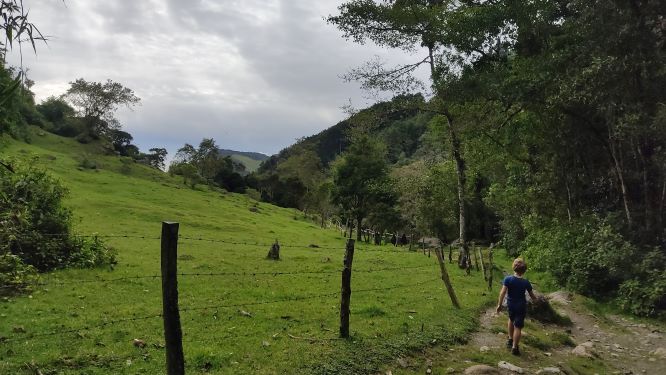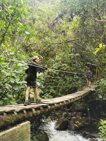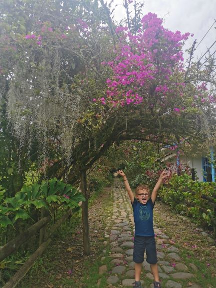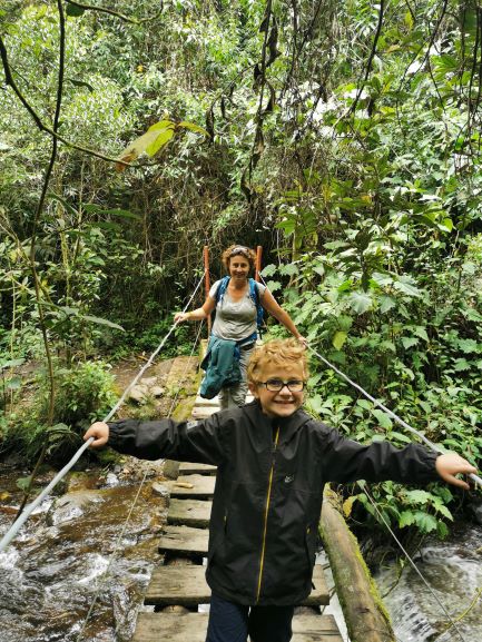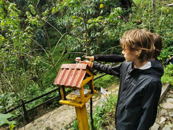 Une fois sur les hauteurs, nous prenons notre pause pique-nique avant d’entamer la redescente. Nous arrivons tout en bas au niveau de la rivière. Nous faisons un petit crochet pour aller voir la ferme aux colibris. Dans cette ferme, ils nous servent un morceau de fromage servi avec une tasse d’infusion à la canne à sucre. Les colibris sont présents par centaines, virevoltant entre les arbres et les mangeoires. Le spectacle est magique, les garçons ne s’en lassent pas. Puis nous reprenons le chemin du retour. Nous traversons plusieurs ponts au dessus de la rivière, dignes des films d’Indiana Jones. Les enfants s’y croient, et leur conquête du Saint Graal est l’arrivée à la jeep. Nous terminons la ballade avec la lumière de fin de journée, vraiment magnifique sur cette vallée qui se dévoile petit à petit devant nous quand nous sortons de la forêt et traversons les verts pâturages. Nous avons un véritable coup de cœur pour ce petit coin de paradis.